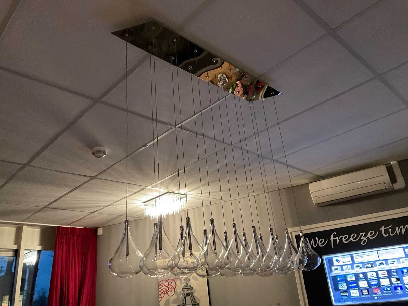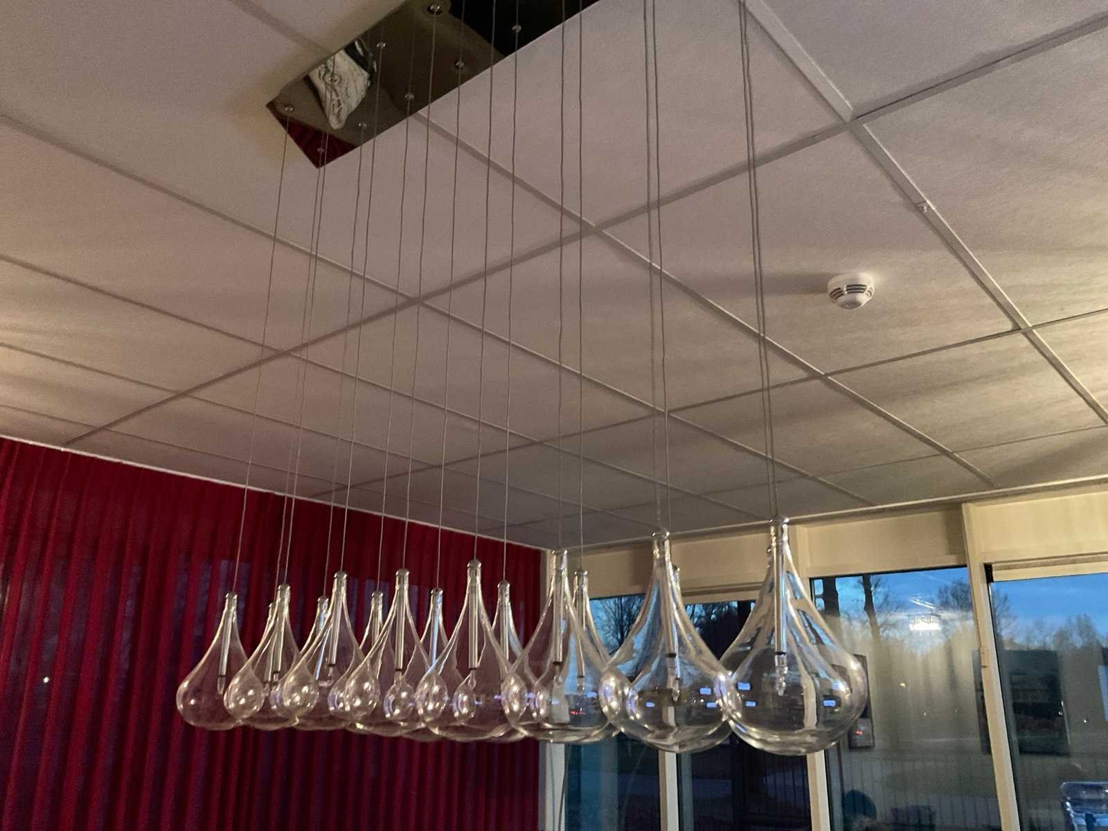 Bestaande uit 16 glazen lampen Dit kavel dient door de koper zelf gedemonteerd te worden en elektra dient afgedopt te worden Met lichtbron: true Lengte: 105cm Breedte: 24cm Hoogte: 107cm