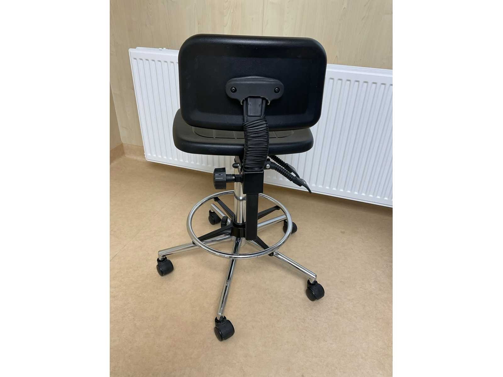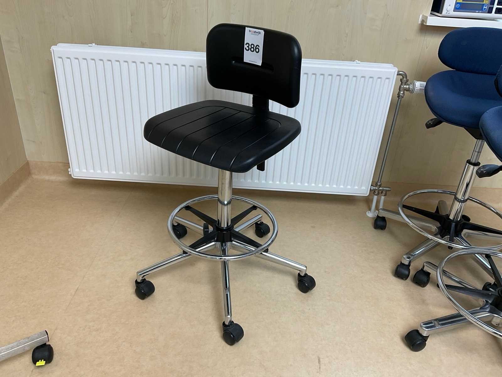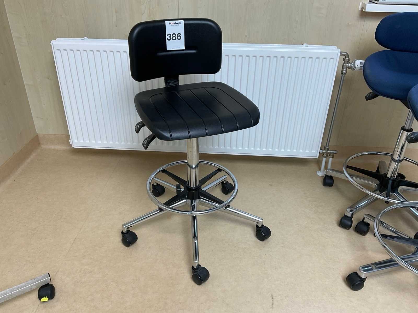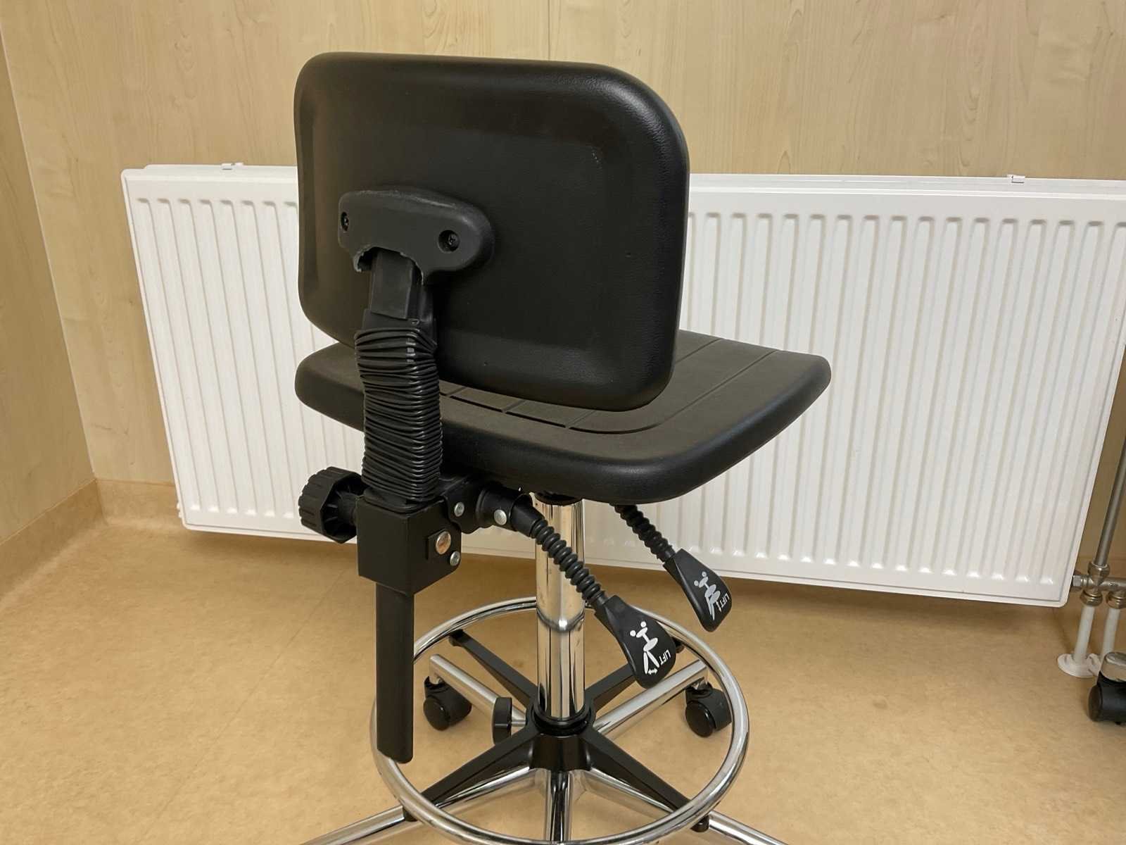 Verrijdbare in hoogte verstelbare kruk voorzien van rugleuning en voetring