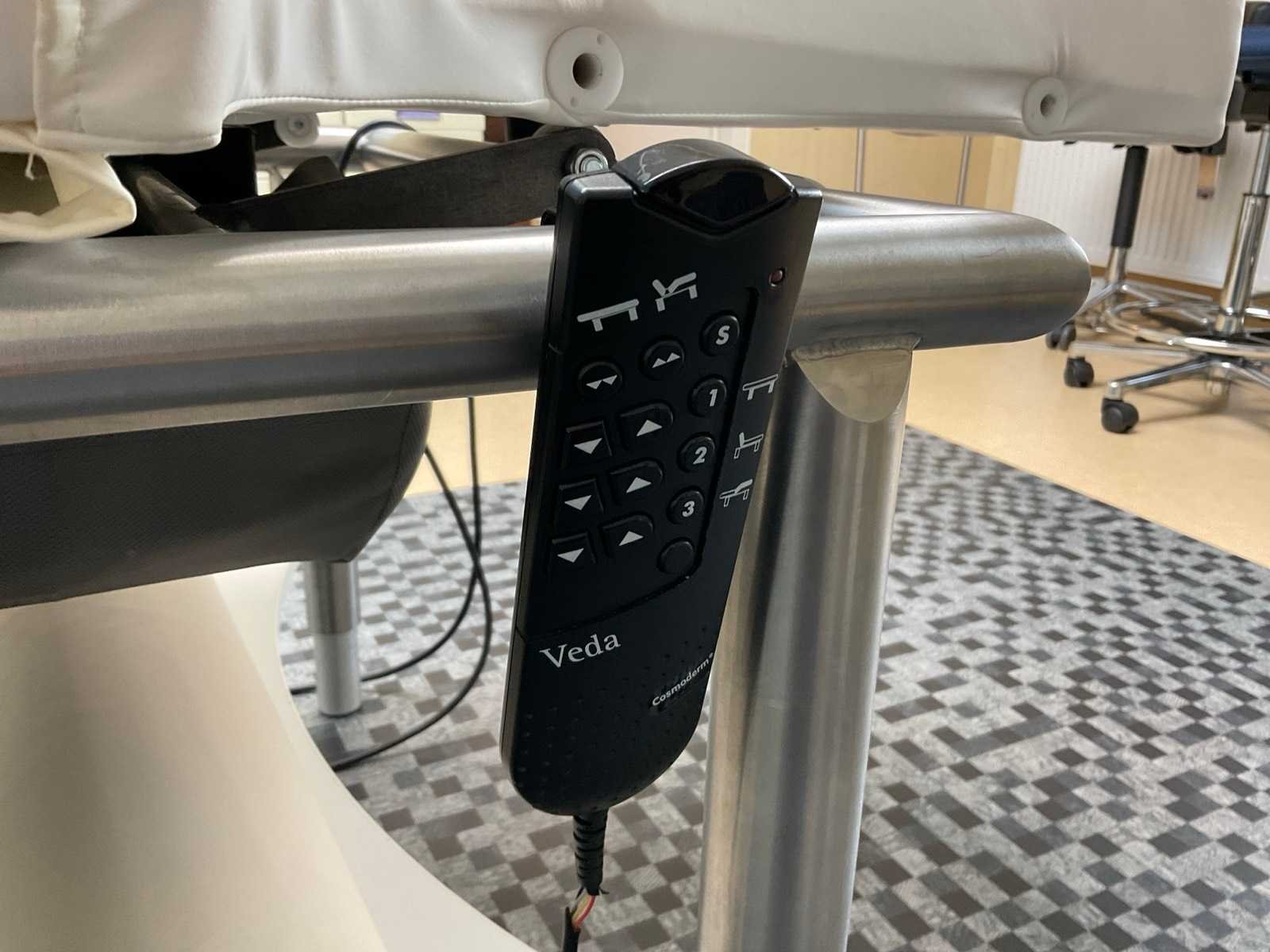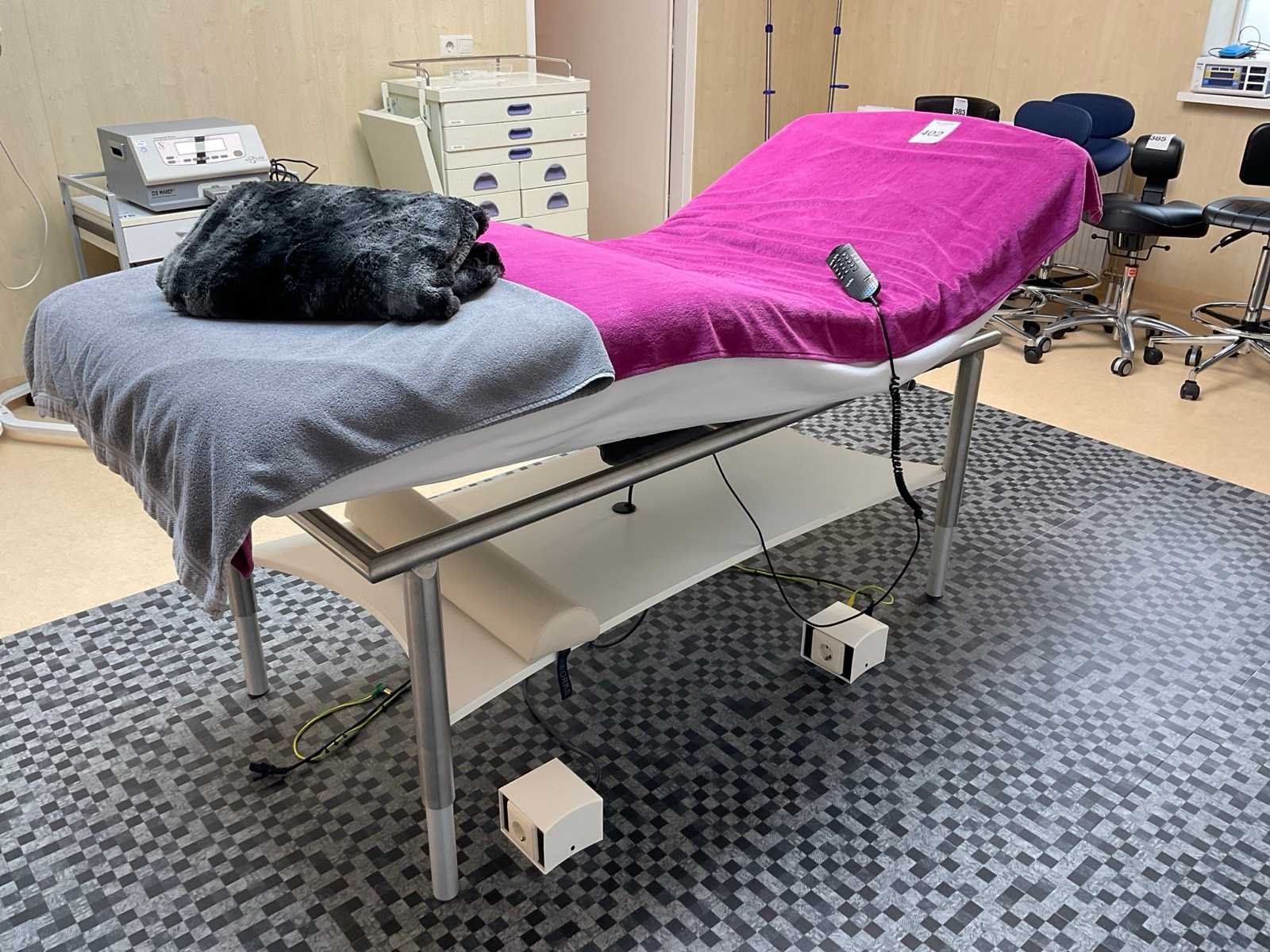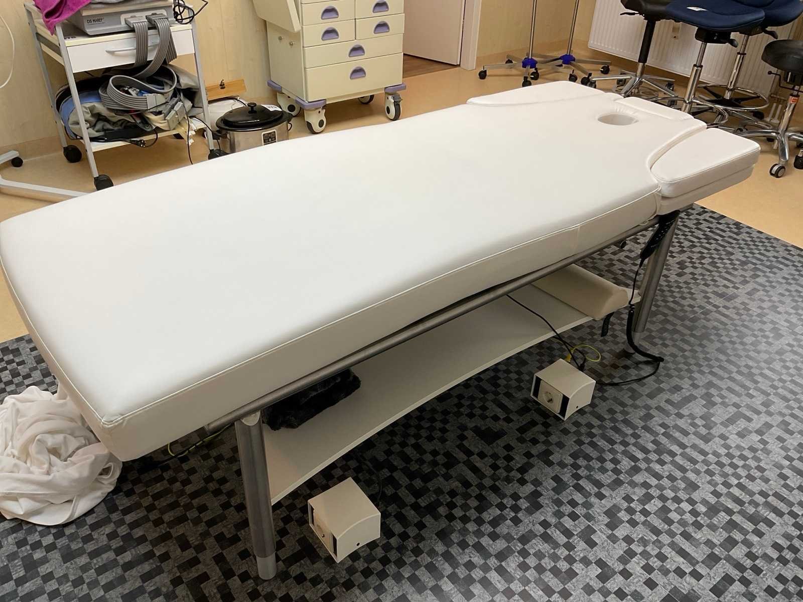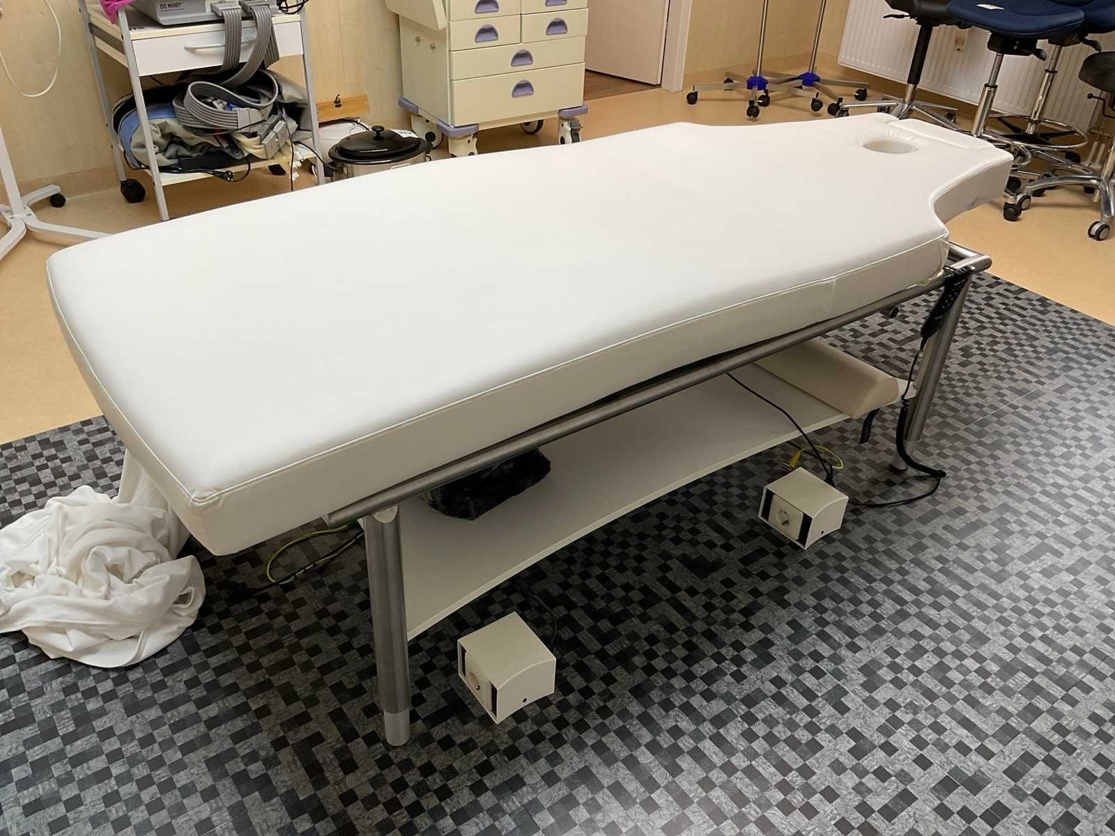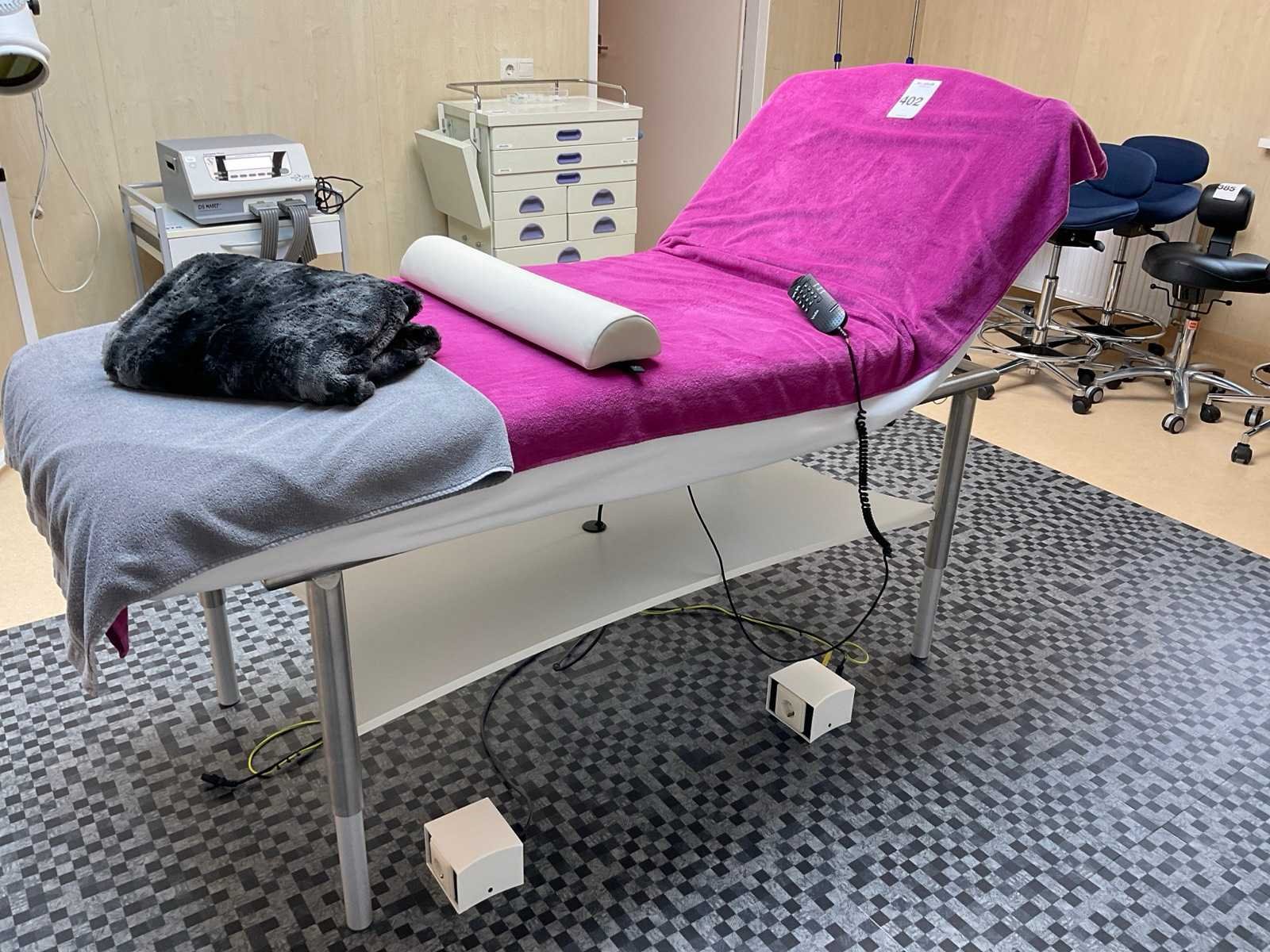 Electrisch in hoogte verstelbare behandeltafel, voorzien van verwarming en afstandsbediening Uitneembaar hoofddeel en zijsteunen bovenzijde Incl. Steun, handdoeken en deken Merk: Veda Model: Cosmoderm Lengte: 205cm Breedte: 80cm