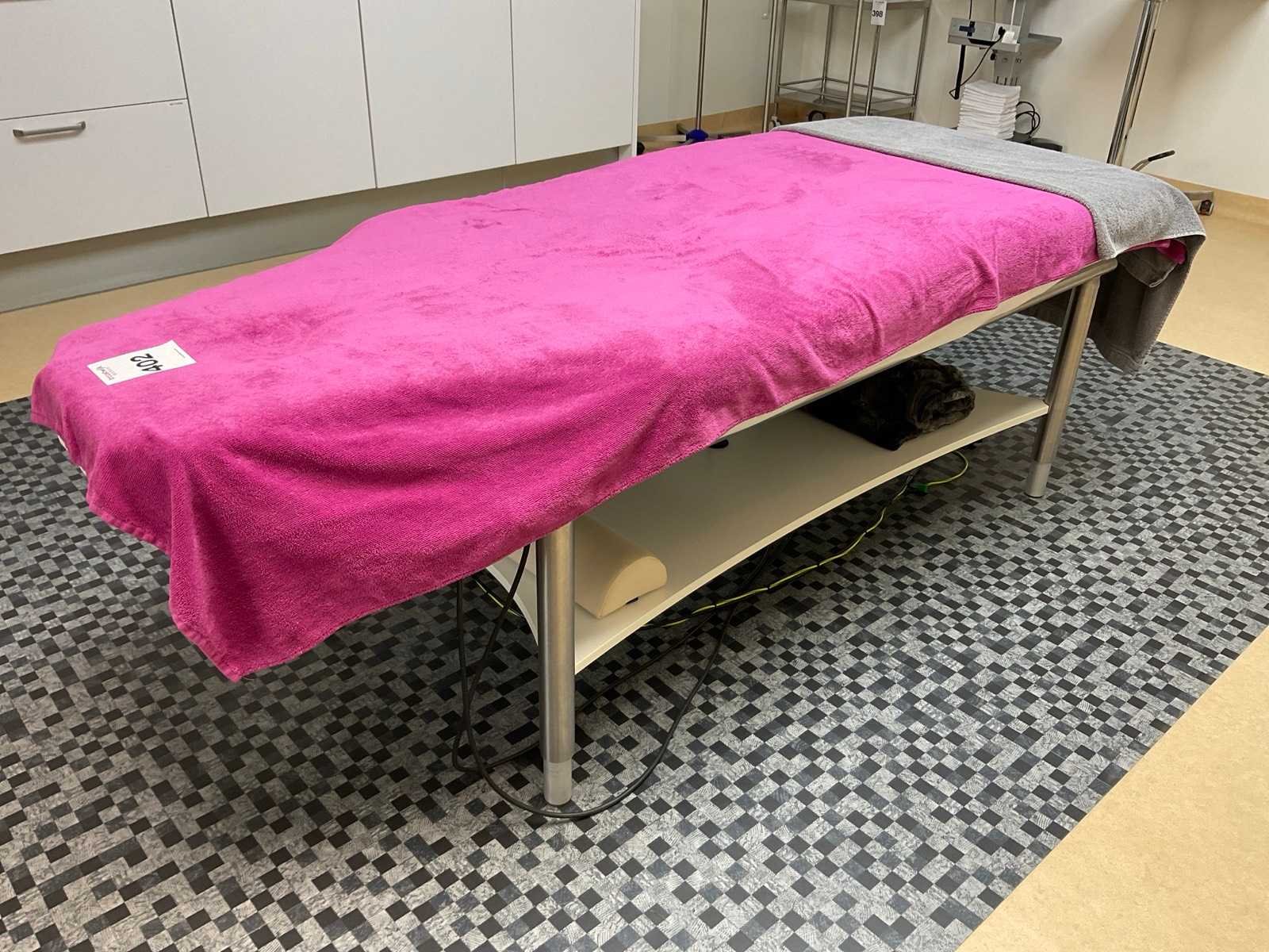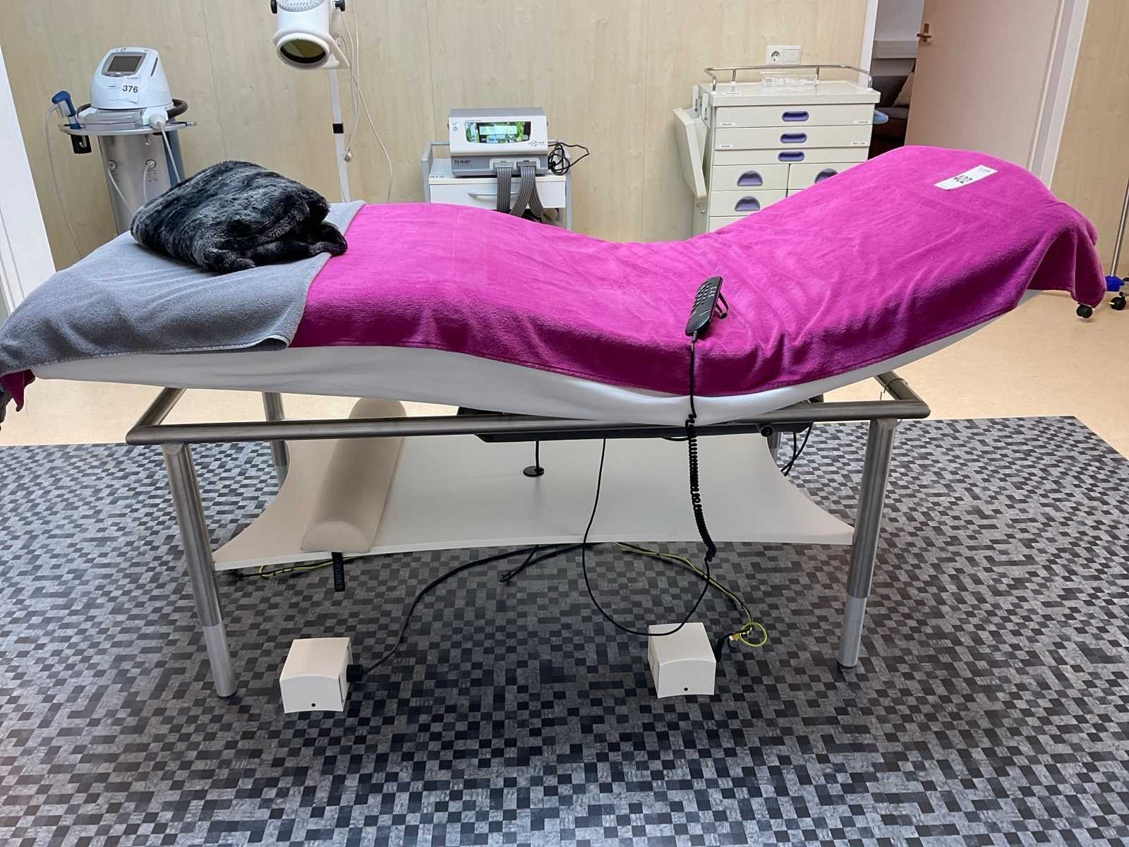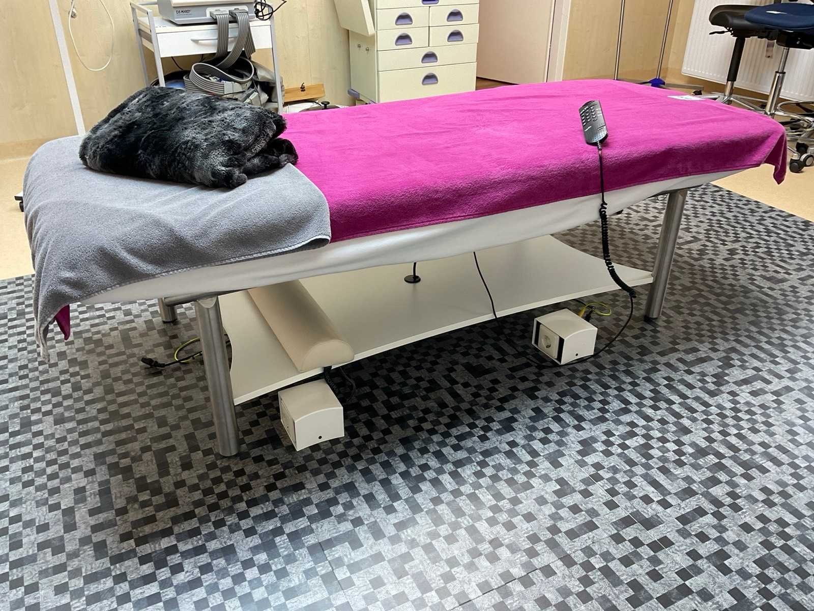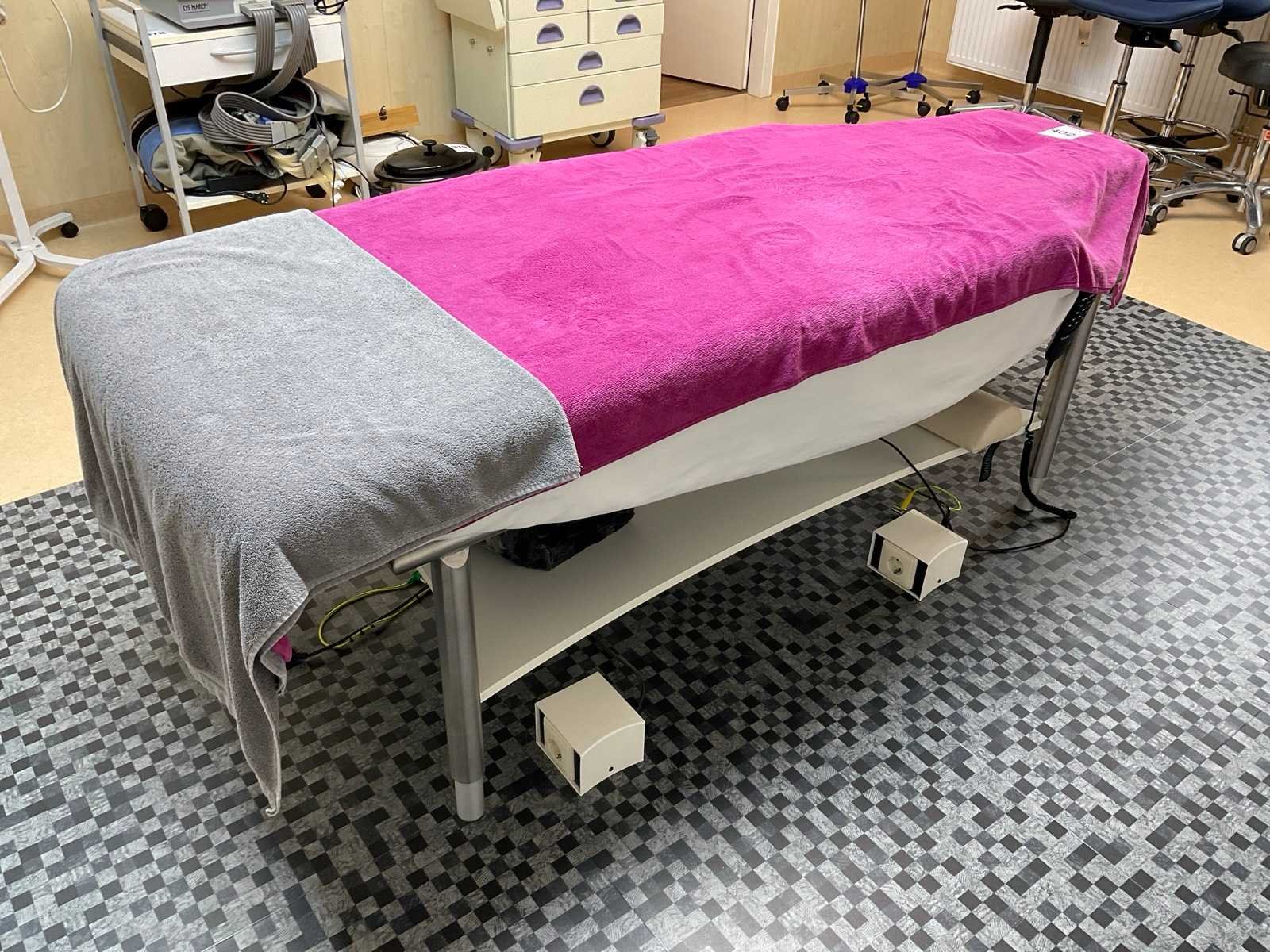 Electrisch in hoogte verstelbare behandeltafel, voorzien van verwarming en afstandsbediening Uitneembaar hoofddeel en zijsteunen bovenzijde Incl. Steun, handdoeken en deken Merk: Veda Model: Cosmoderm Lengte: 205cm Breedte: 80cm
