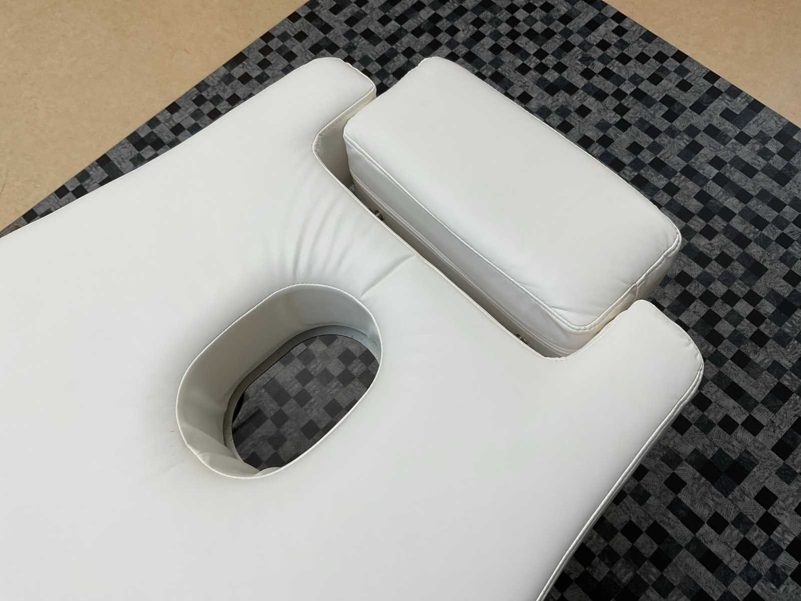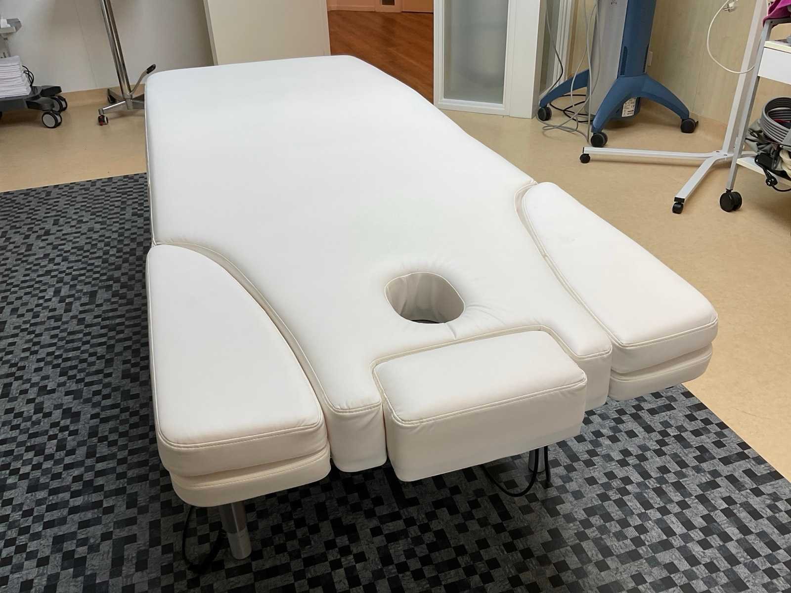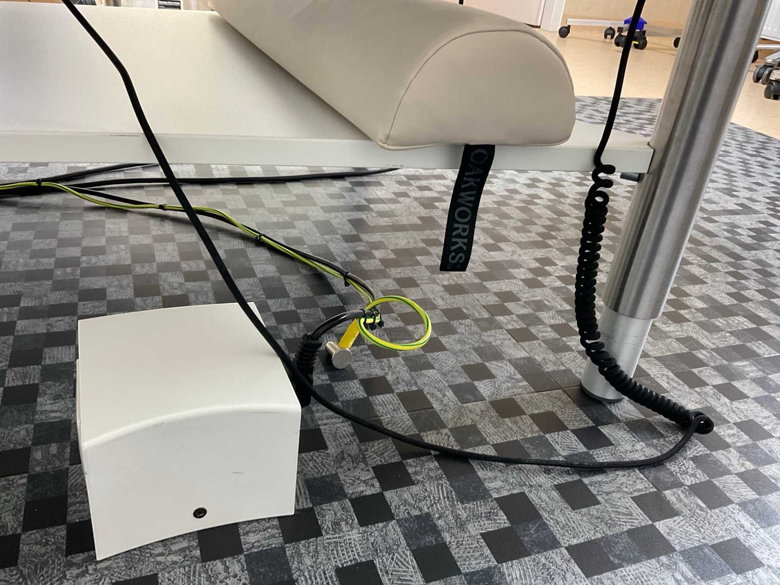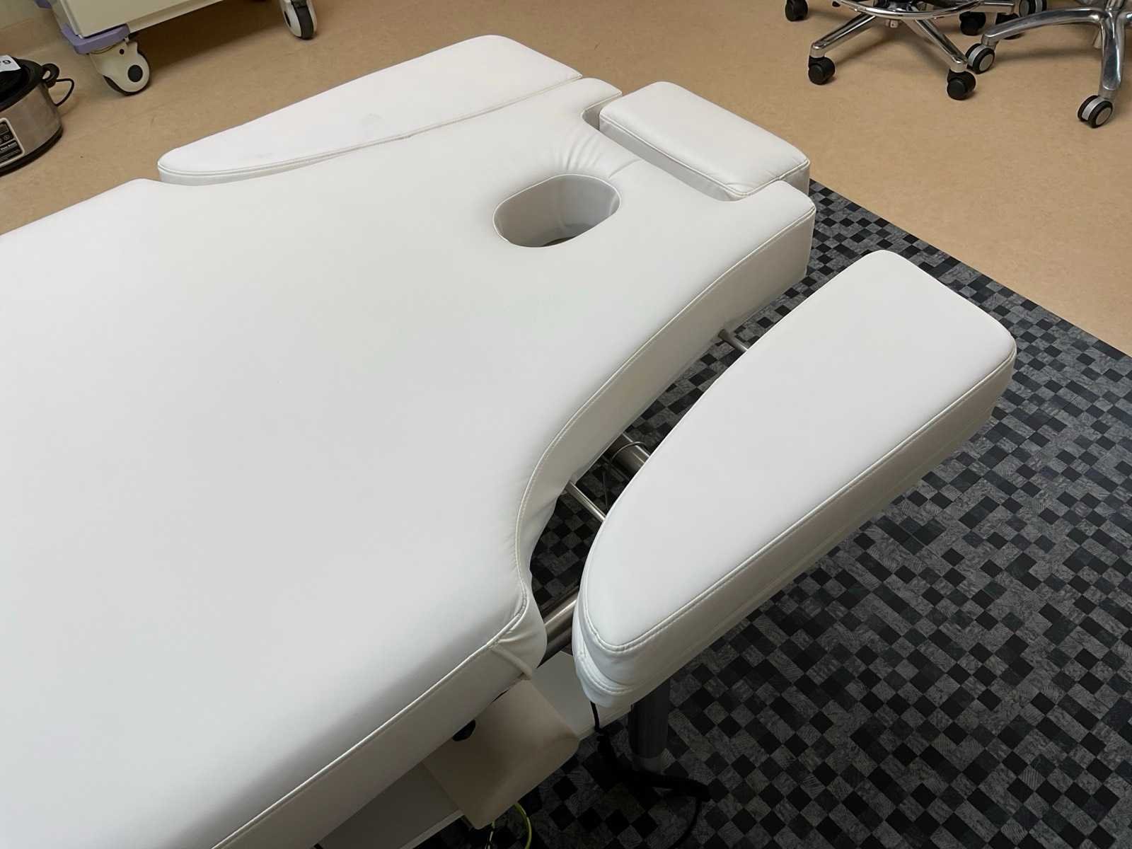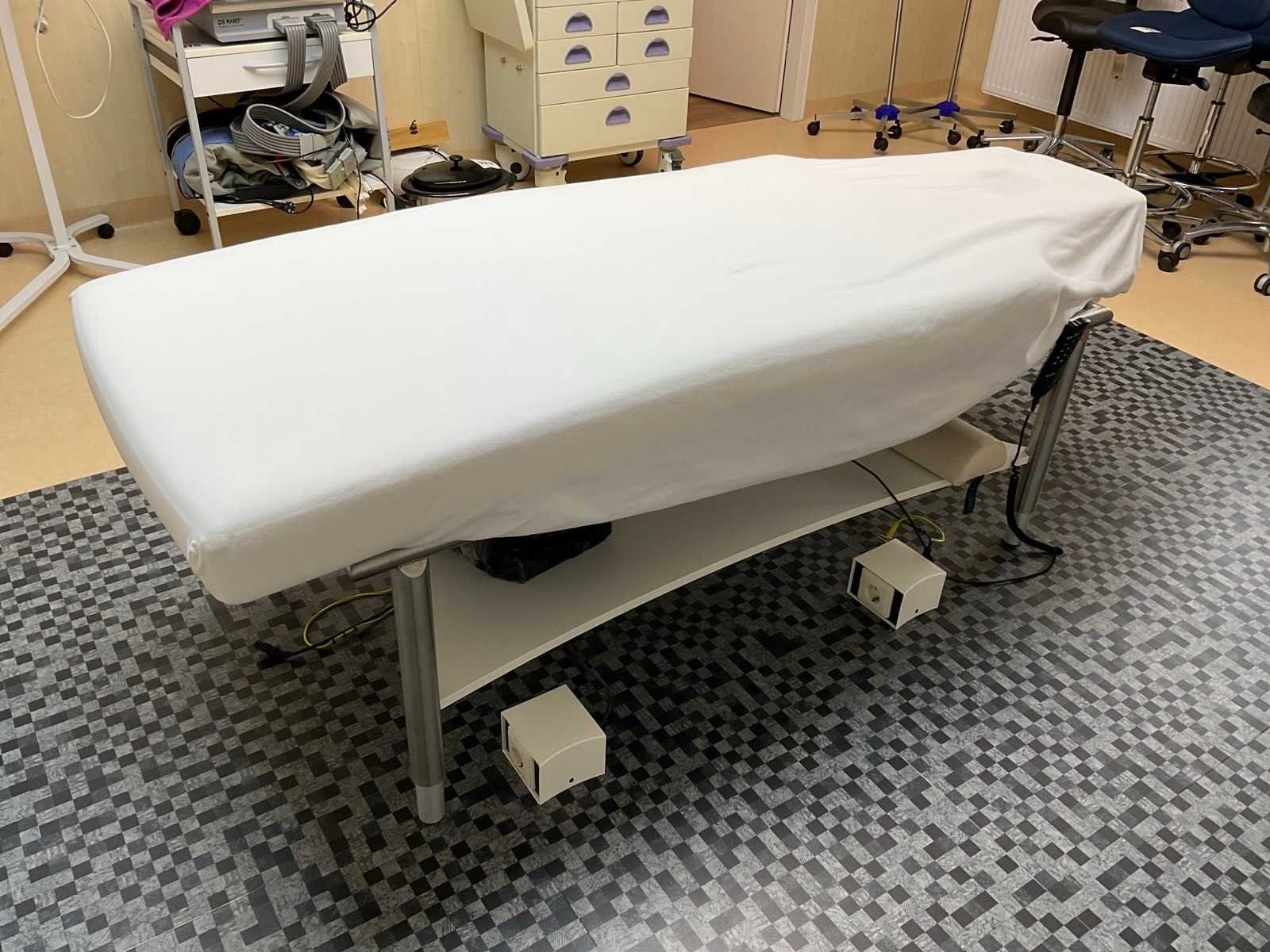 Electrisch in hoogte verstelbare behandeltafel, voorzien van verwarming en afstandsbediening Uitneembaar hoofddeel en zijsteunen bovenzijde Incl. Steun, handdoeken en deken Merk: Veda Model: Cosmoderm Lengte: 205cm Breedte: 80cm