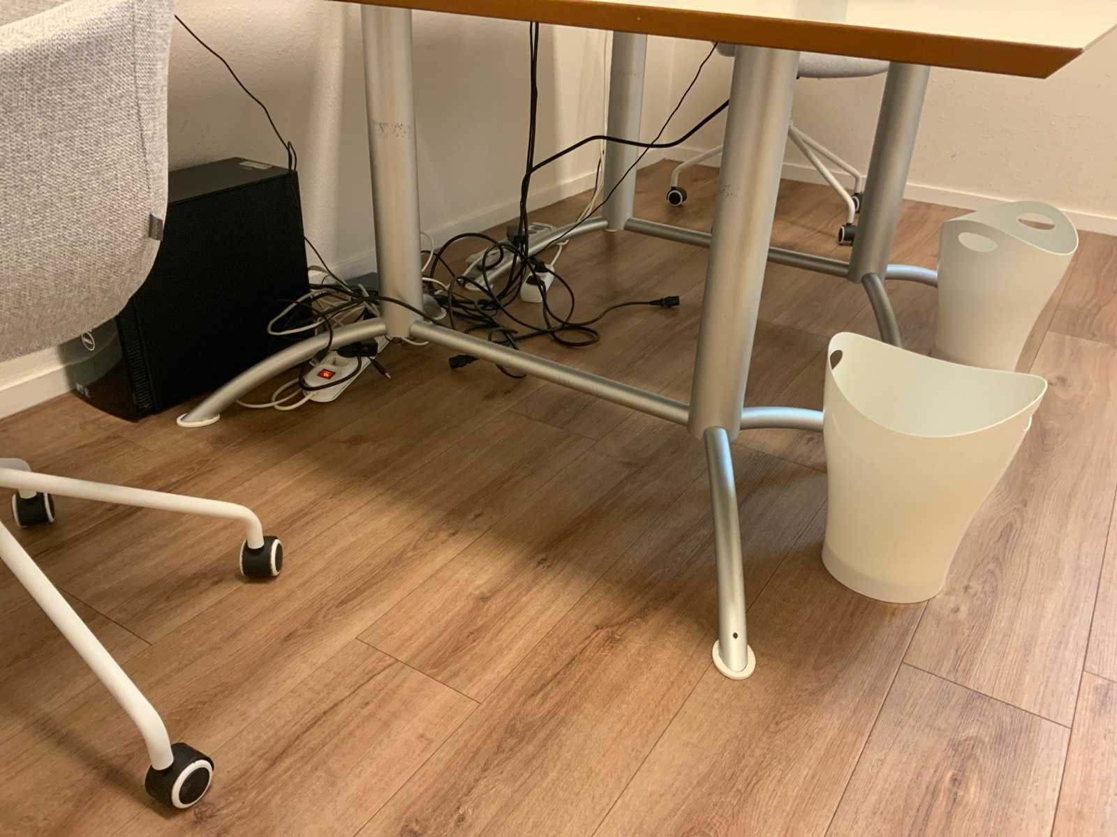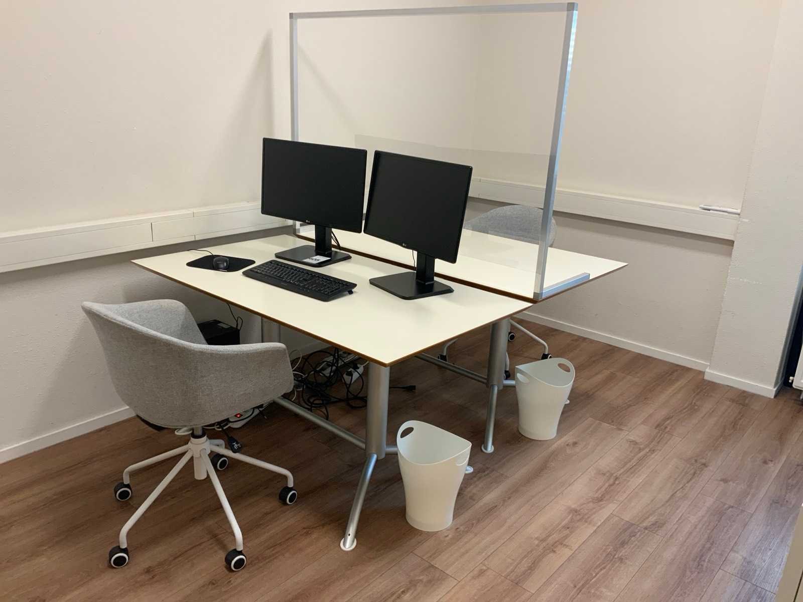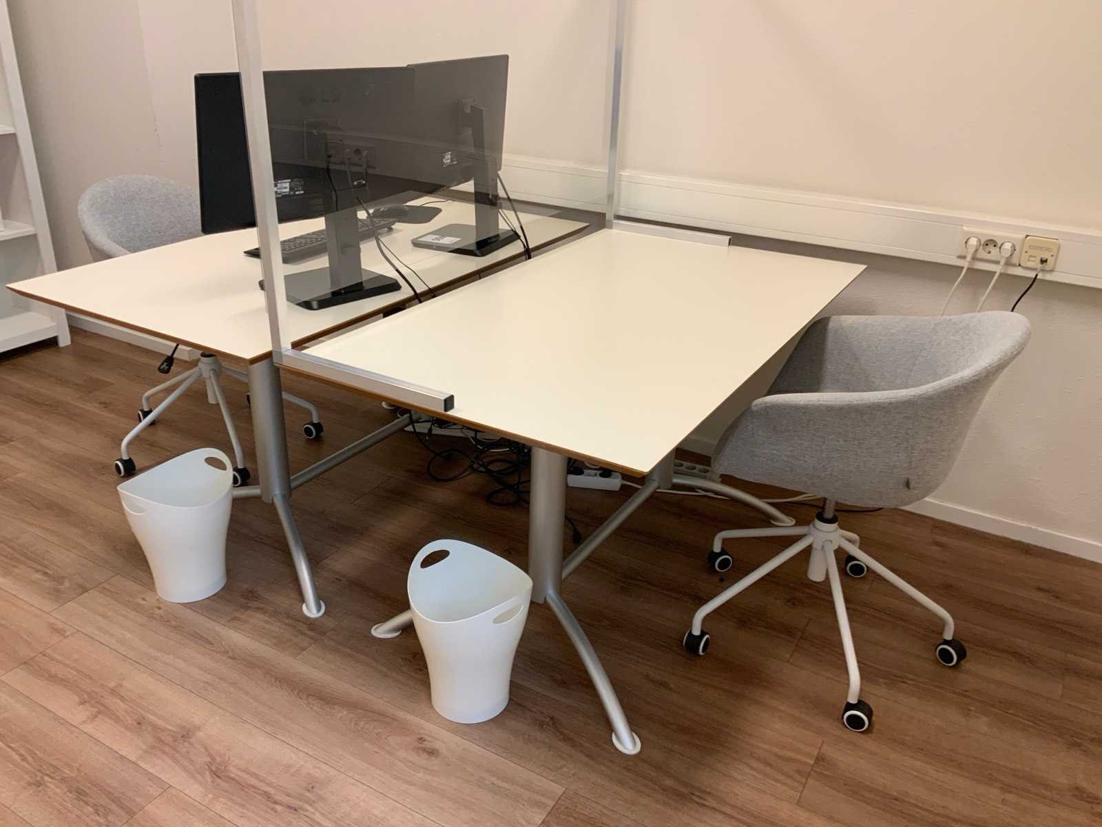 Bestaande uit 2 ladekasten afm ca. 80x48x101 cm en glasplaat 2 bureaus afm ca. 140x78 cm waarvan 1 voorzien van scherm 2 Nolon bureaustoelen 2 prullenbakken Houten open vakkenkast afm ca. 96x35x205 cm Computer en monitoren niet inbegrepen