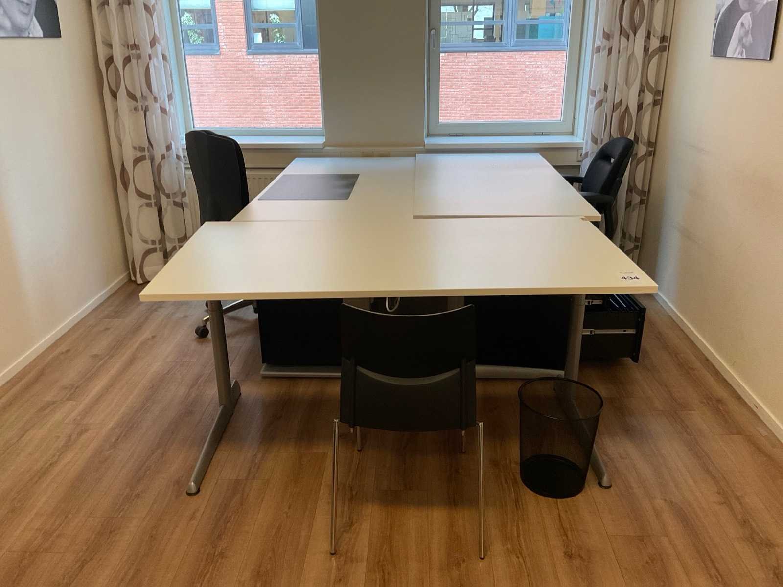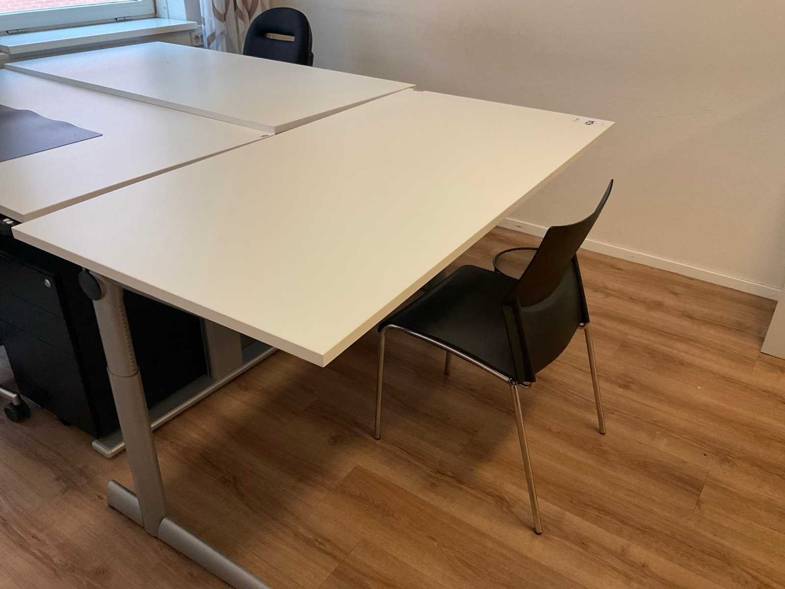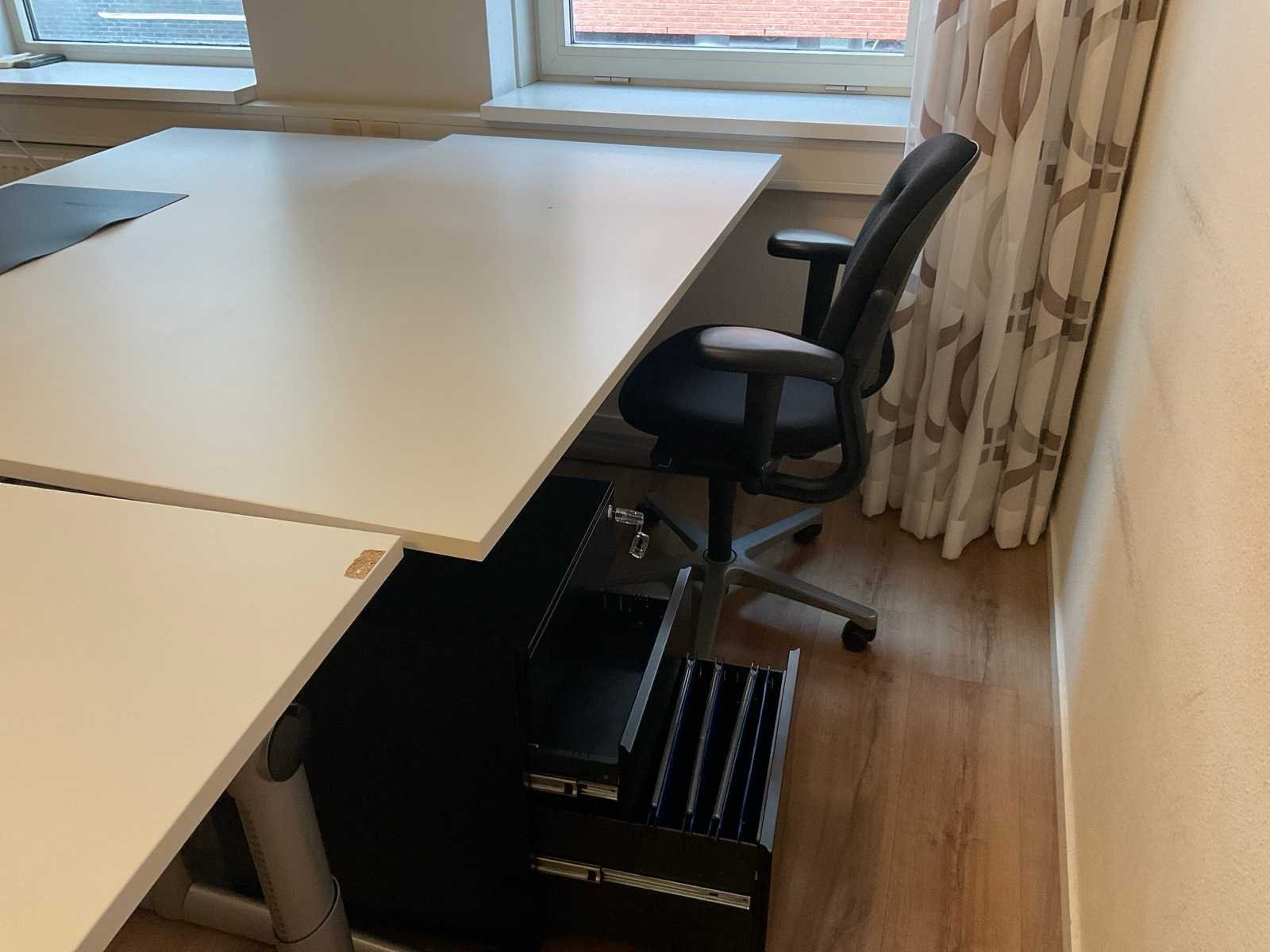 3 x bureau, 2 bureaustoelen, vergaderstoel, 4 x ladeblok, wanddecoratie en 2 x kapstok. 1 bureau is elektrisch verstelbaar. Lengte: 160cm Breedte: 80cm Hoogte: 80cm