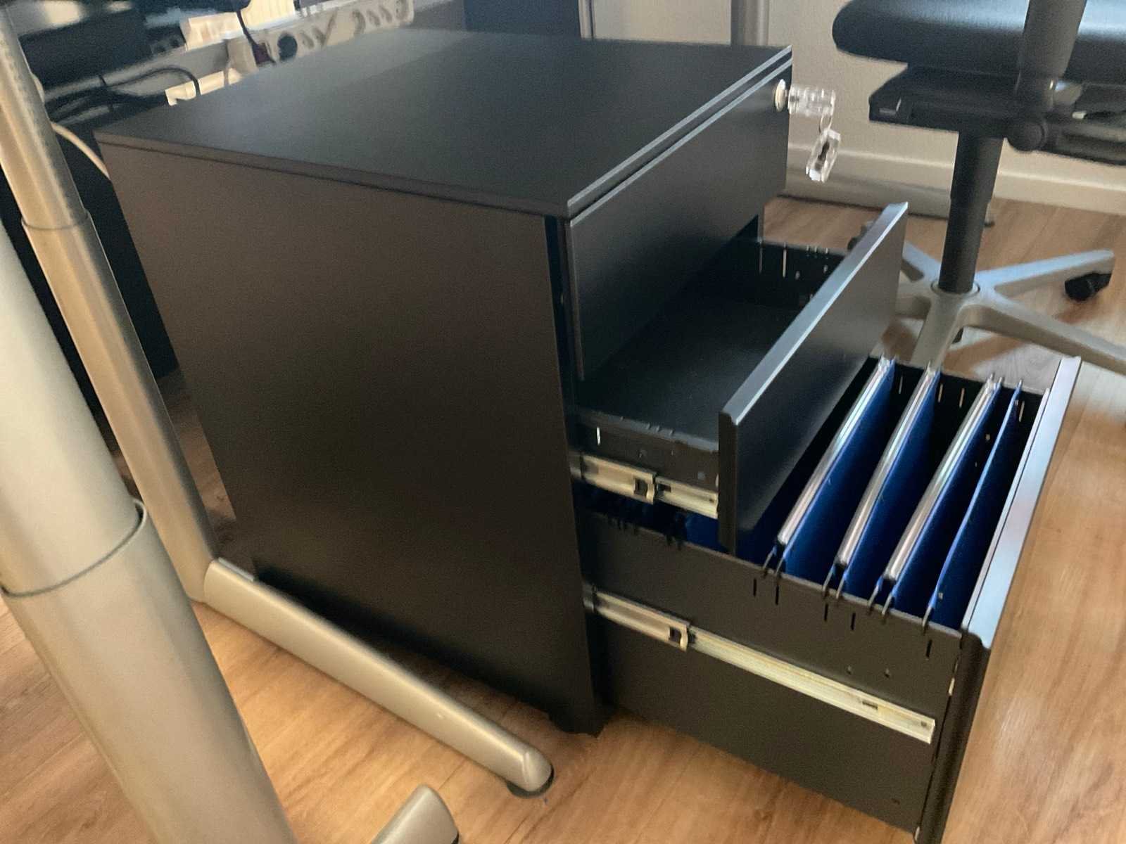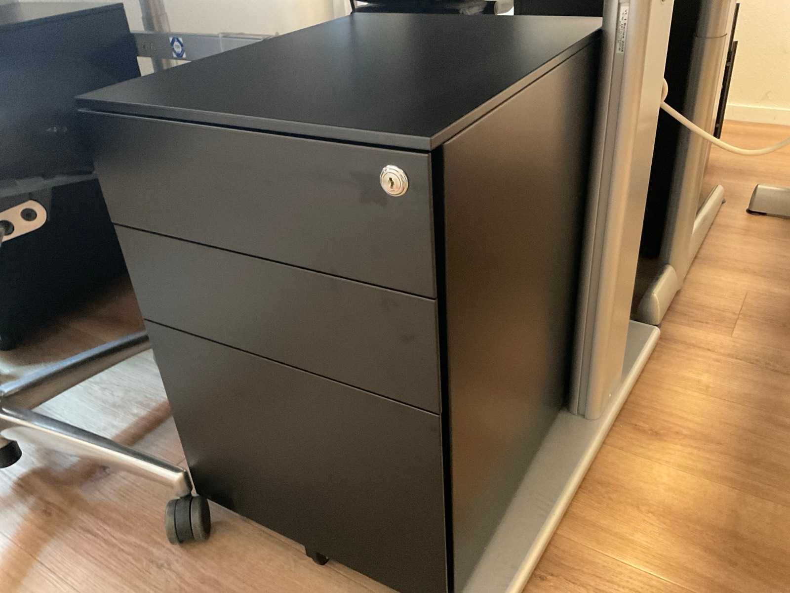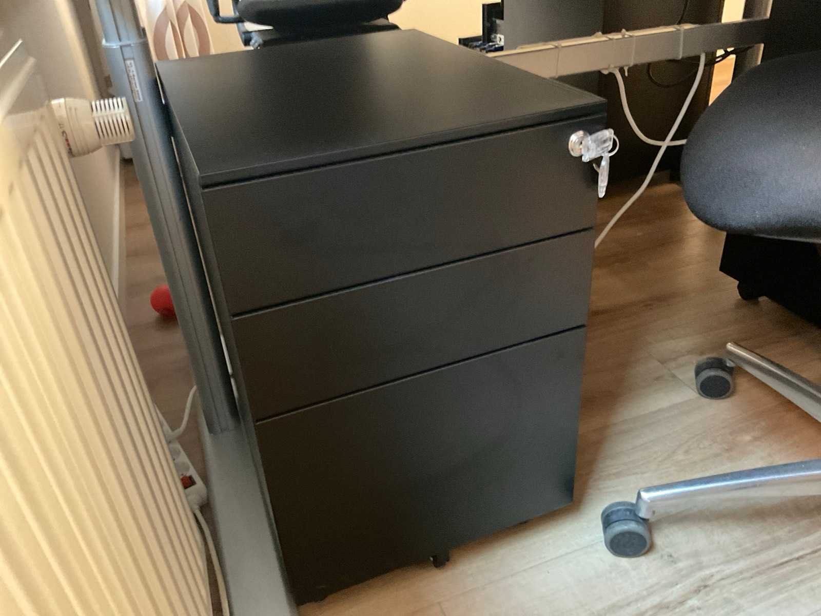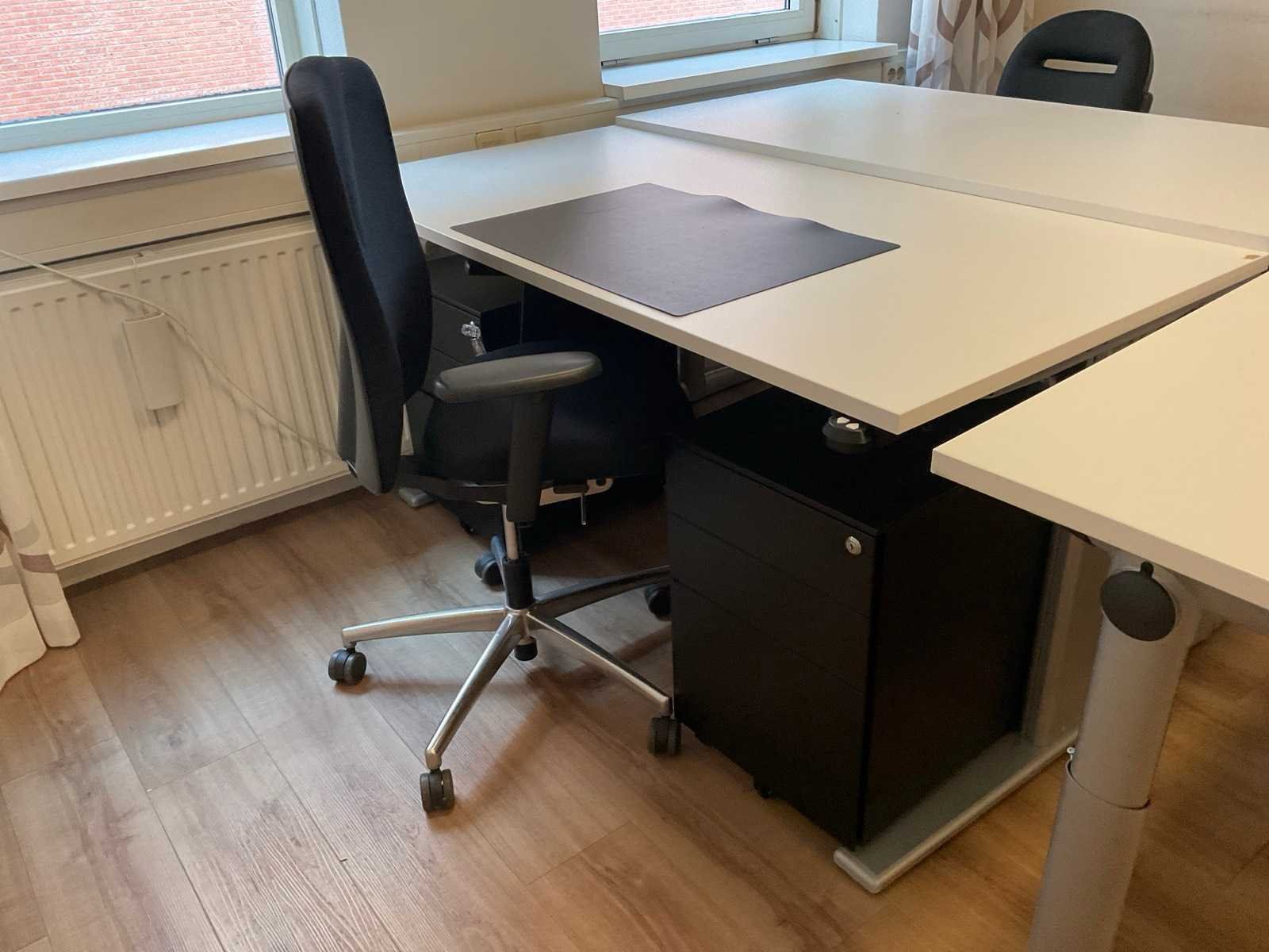 3 x bureau, 2 bureaustoelen, vergaderstoel, 4 x ladeblok, wanddecoratie en 2 x kapstok. 1 bureau is elektrisch verstelbaar. Lengte: 160cm Breedte: 80cm Hoogte: 80cm