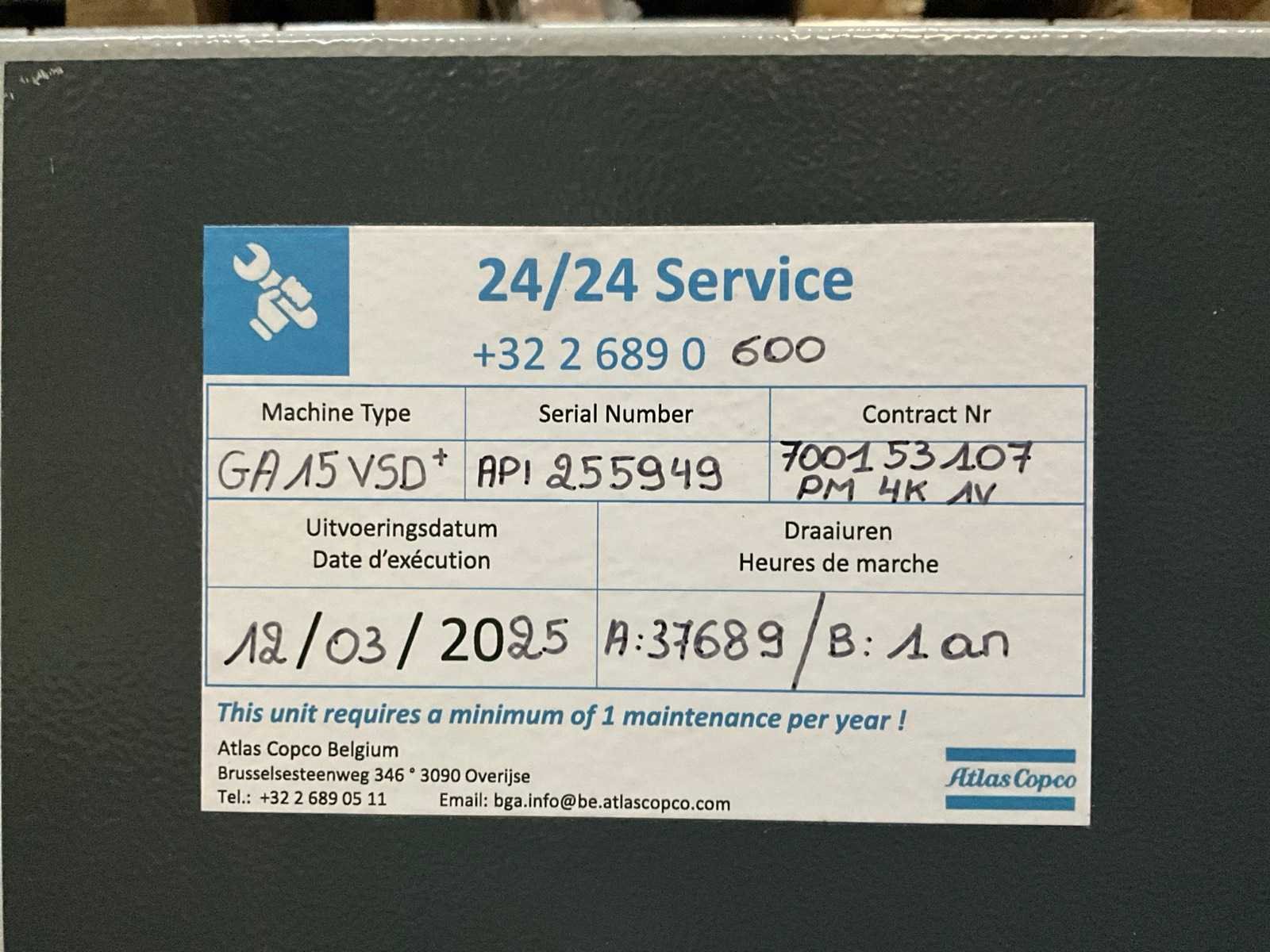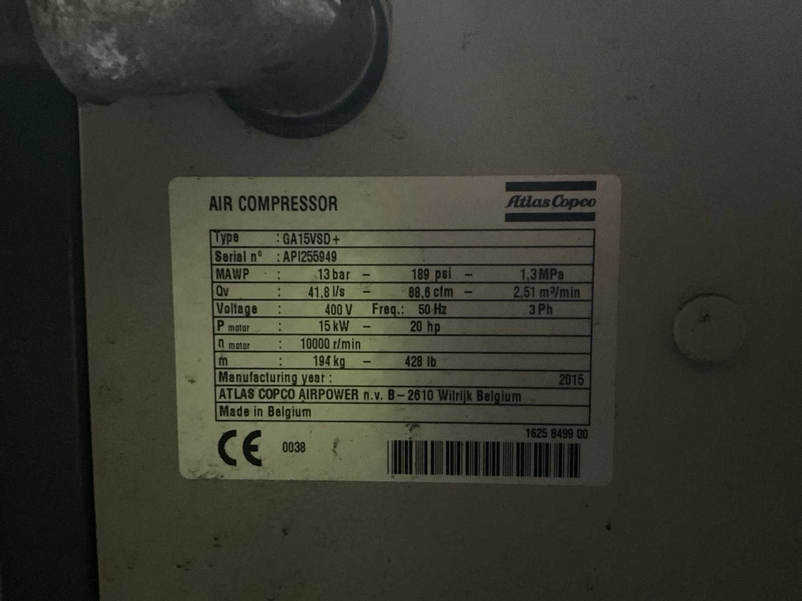 Merk: Atlas Copco Type: GA15VSD+ Bouwjaar: 2015 Capaciteit.: 13bar Luchtstroom: 251l/min Vermogen: 15kW Afgelezen urenstand: 38694hr Aansluiting: 400V Eigen gewicht: 195kg Totale afmeting L: 630mm Totale afmeting Breedte: 660mm Totale afmeting Hoogte: 1420mm