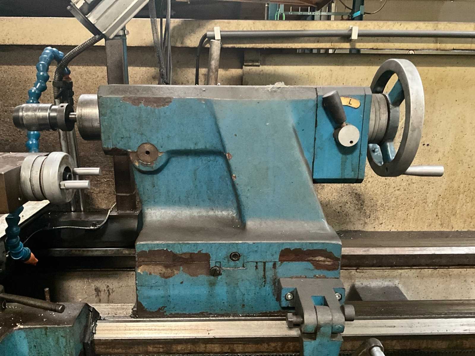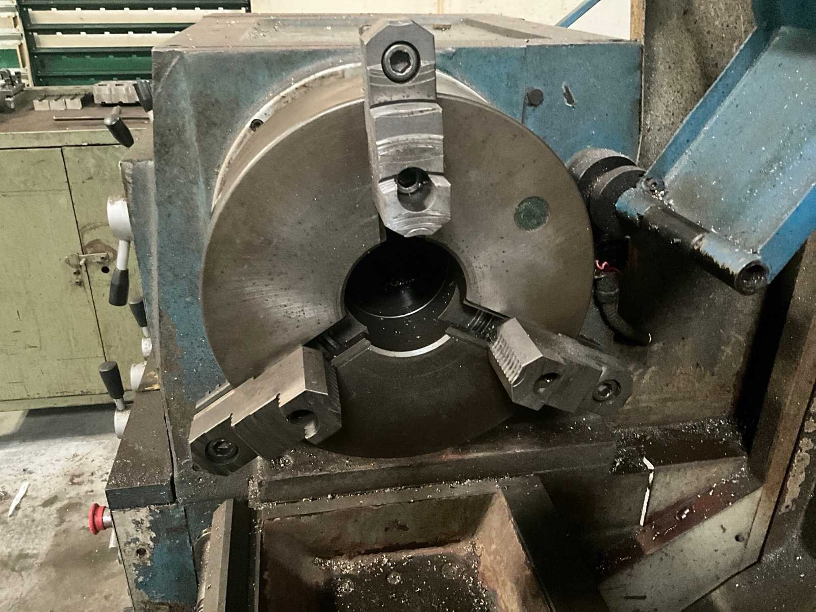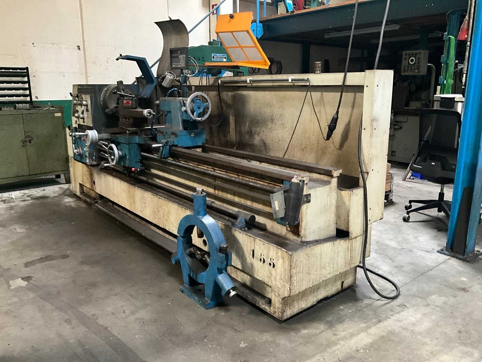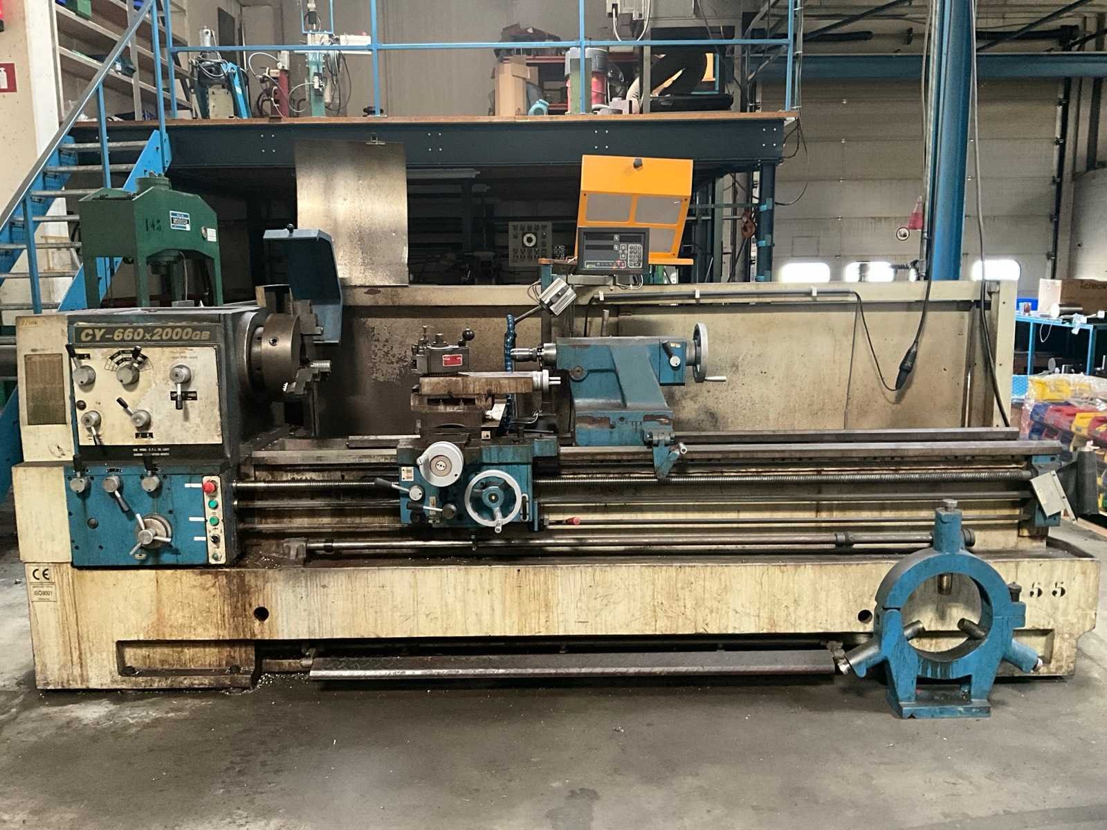 Met gereedschap en gereedschapskast Draaibank Steady Rest: 300 mm diameter. Middendiameter: 320 mm Merk: Yunnan Type: CY-660 x 2000GB Draai: 660mm Holle spil Ø: 82mm Aantal snelheden: 3 Snelheid van n =: 6rpm Snelheid tot n =: 1200rpm Besturing, merk, type: Newall DP700 Aansluiting: 400V Afmeting l: 4100mm Afmeting b: 1200mm Afmeting h: 2100mm