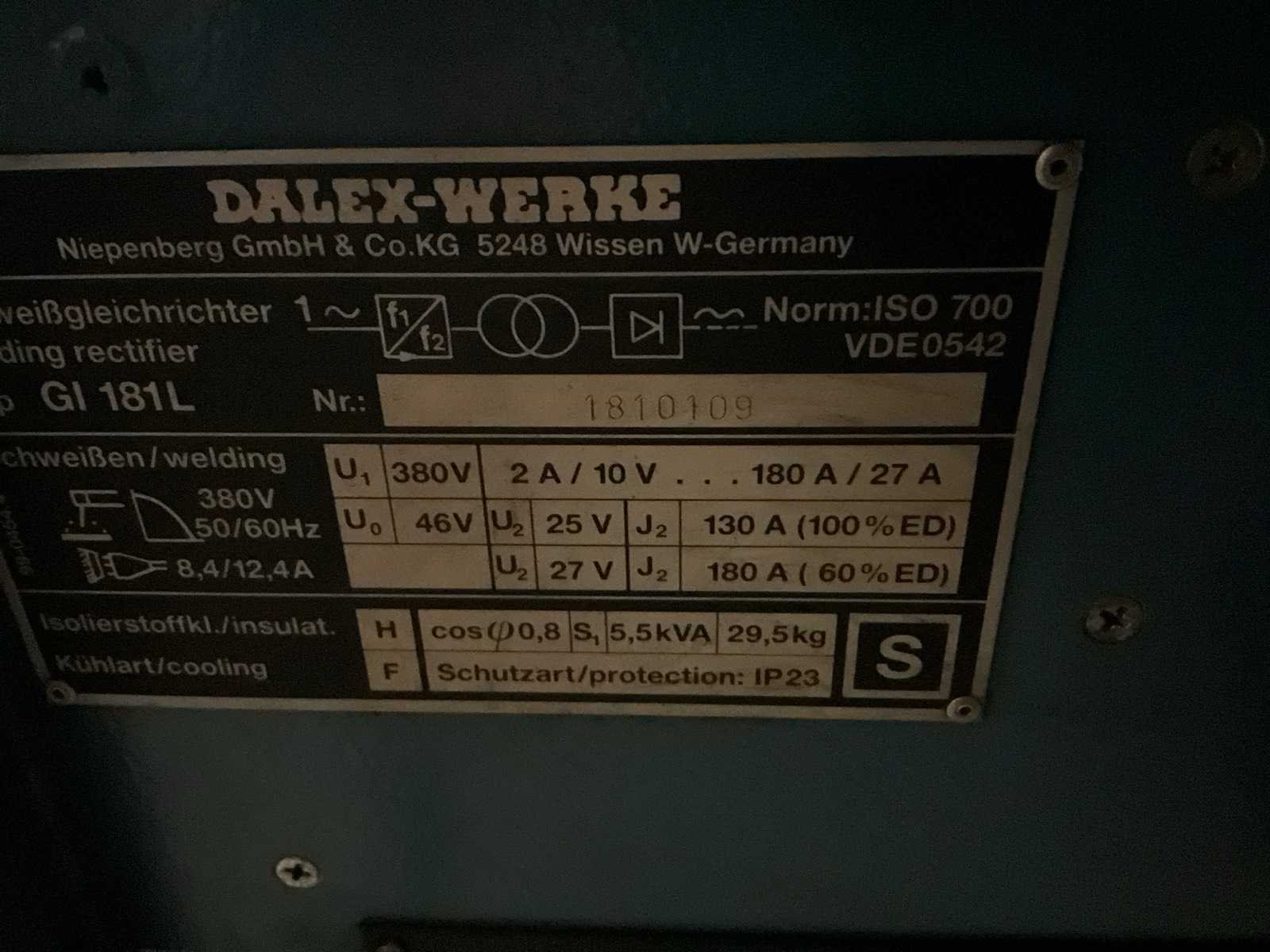 Merk: Dalex Type: GI 181L Max. lasvermogen: 180A Aansluiting: 380V Afmeting l: 500mm Afmeting b: 280mm Afmeting h: 400mm