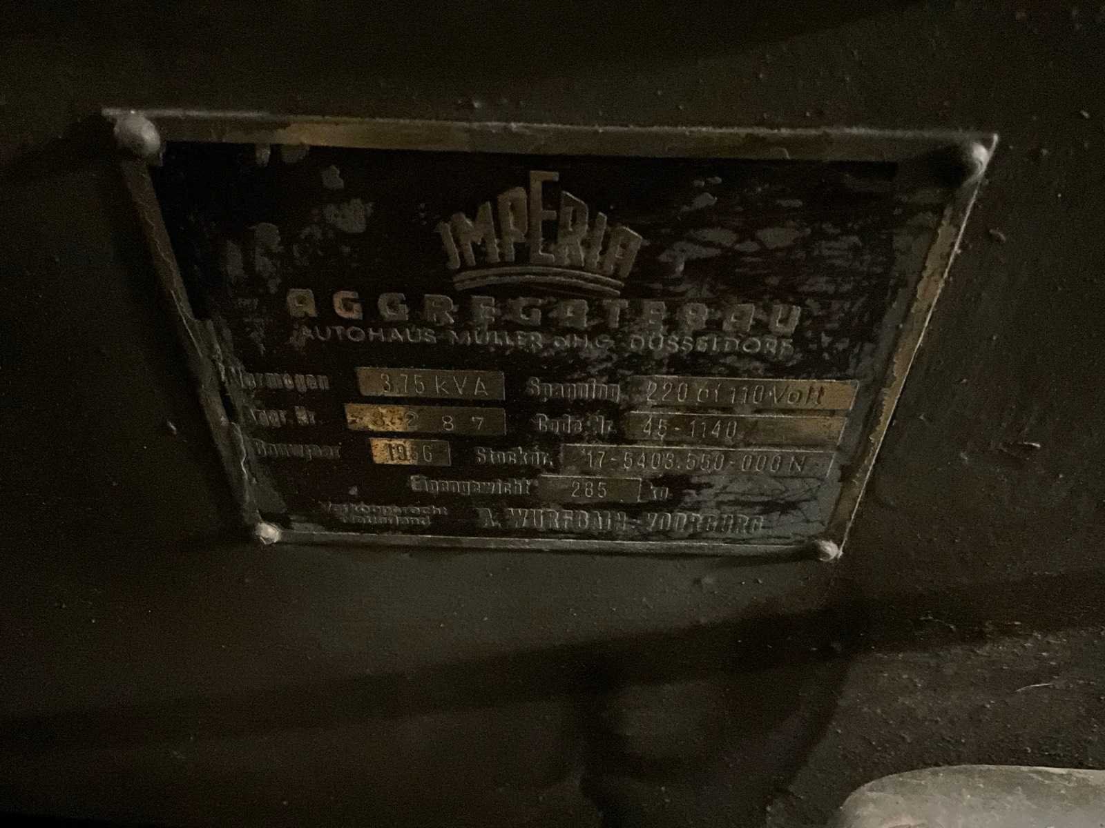 Merk: Imperia Aggregatebau Type: 3287 Bouwjaar: 1956 Capaciteit.: 3.75kVA Benzine: true Luchtgekoeld: true Mobiel: true Machinegewicht: 285kg Totale afmeting L: 1400mm Totale afmeting Breedte: 650mm Totale afmeting Hoogte: 1200mm