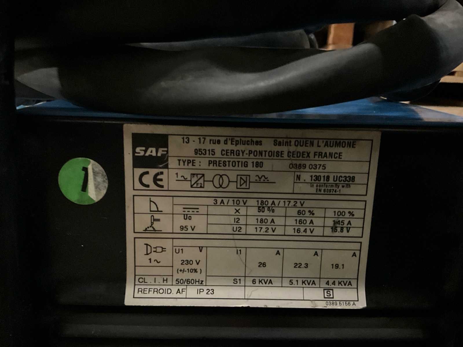 Merk: Saf Type: Prestotig 180 Max. lasvermogen: 170A Aansluiting: 230V Afmeting l: 550mm Afmeting b: 250mm Afmeting h: 450mm