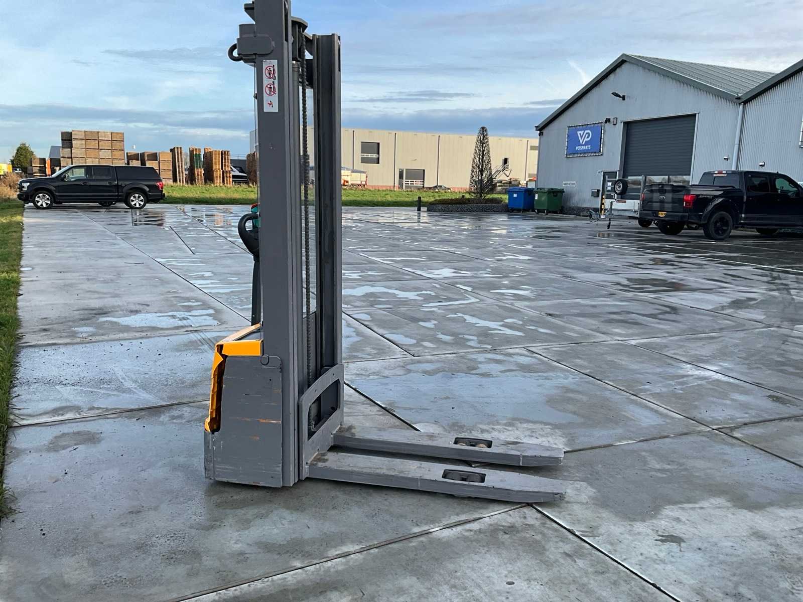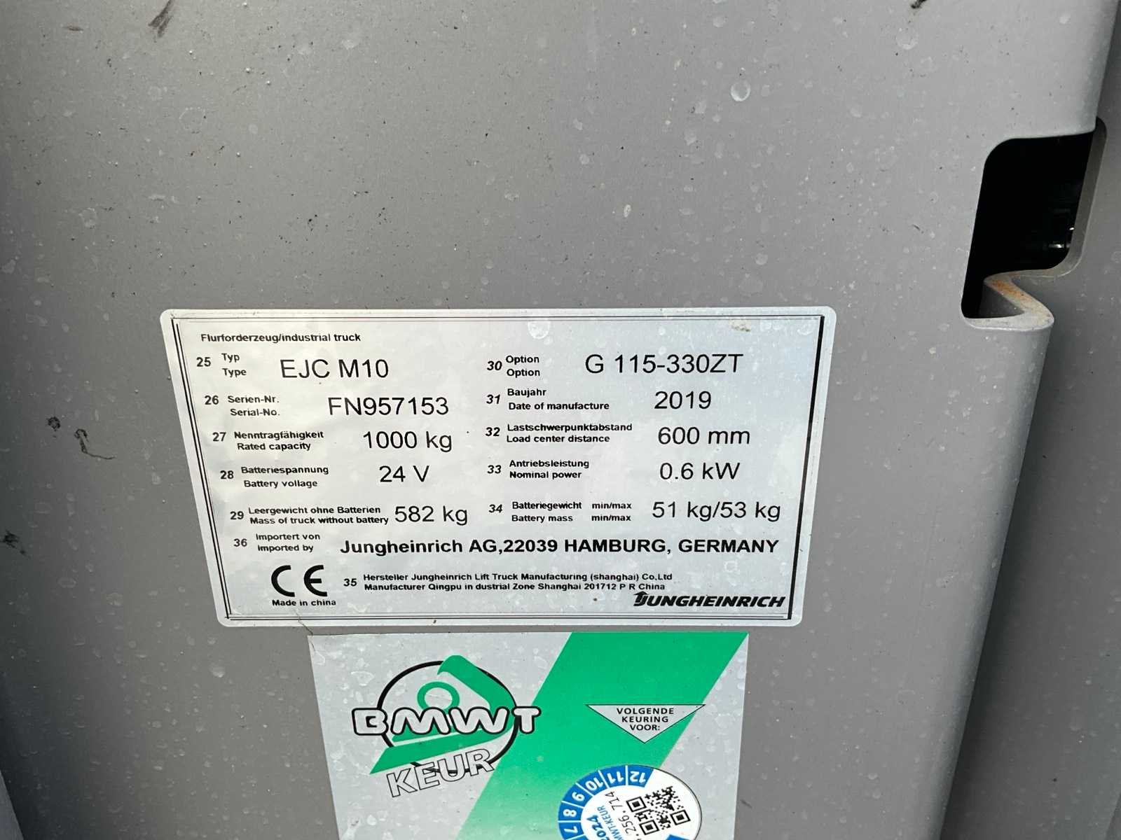 Ingebouwde oplader Merk: Jungheinrich Type: EJC M10 Bouwjaar: 2019 Serienummer: FN957153 Hefvermogen: 1000kg Hefhoogte: 3300mm Lepellengte: 1150mm Afgelezen urenstand: 655.8 Eigen gewicht: 633kg Minimale doorrijhoogte: 2060mm Totale afmeting L: 1900mm Totale afmeting Breedte: 800mm Totale afmeting Hoogte: 2060mm