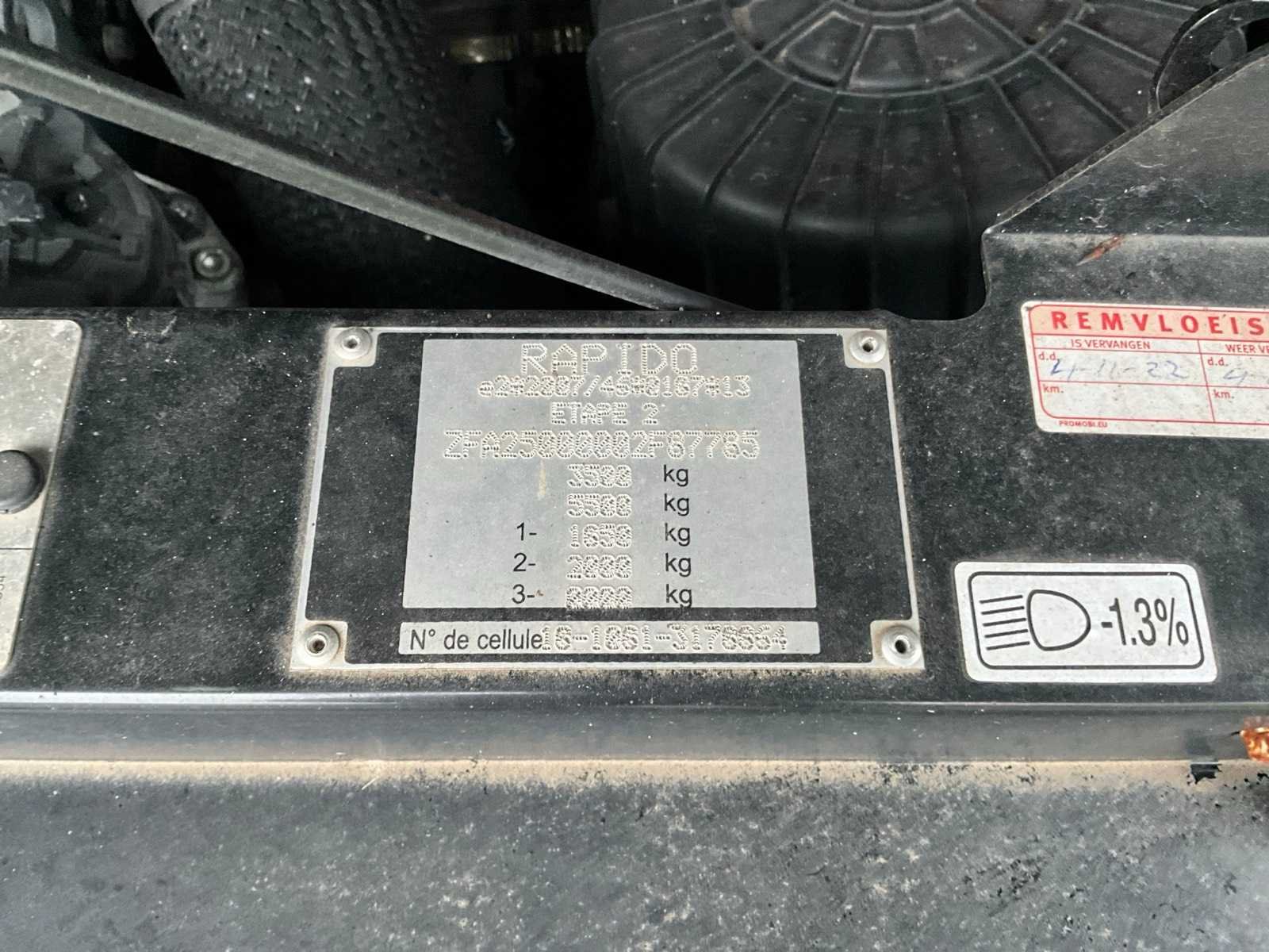 - dak airco - Hefbed - Zonnepaneel - Elektrisch Fietsenrek - Achteruitrijcamera - TV met automatische schotel Let op uitsluitend op afspraak te bezichtigen, staat op andere locatie Kenteken: R-398-PH Merk: Rapido Model: 883F Type: 883F Aantal zitplaatsen: 4 Bruto BPM (NL): 12618€ Transmissie: Automaat Datum eerste toelating (NL): 2022-11-15 Datum eerste toelating: 2018-02-20 APK vervaldatum: 2026-03-28 Bouwjaar: 2018 Afgelezen kilometerstand: 32475km NAP status: Geen oordeel Vermogen (kW): 110kW Vermogen (pk): 150hp Cilinderinhoud: 2287cc Emissieklasse: 6 Brandstof: diesel Aantal deuren: 2 Kleur: wit Carrosserie: kampeerwagen Ledig gewicht: 3000 Self drive export possible : true