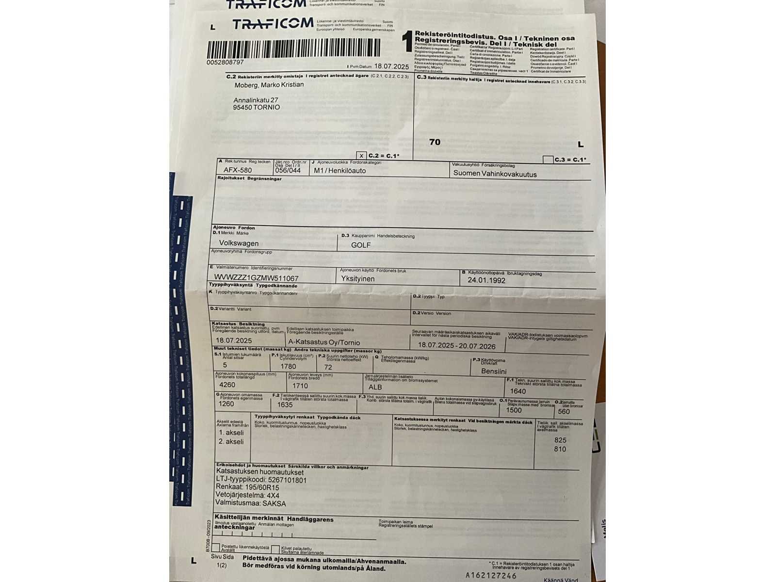 Finse registratie zie foto, 4x4 Chassisnummer: WVWZZZ1GZMW511067 Merk: Volkswagen Model: Golf Type: Montana Country Syncro Afgelezen kilometerstand: 356942km Brandstof: Benzine Datum eerste toelating (NL): 24-01-1992 Nationaliteit documenten: Fins Startinformatie: Ja Bouwjaar: 1992 No self drive export!: true