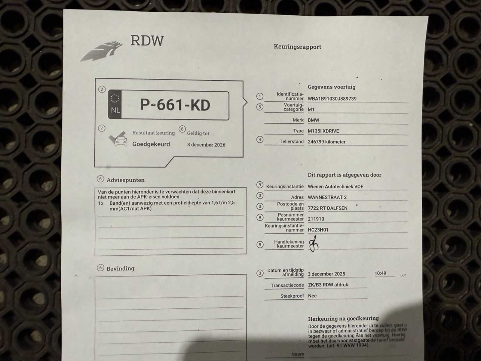 - achterbumper met spuitbus gespoten - schadehistorie Kenteken: P-661-KD Merk: Bmw Model: 1-serie Type: M 135 i Bouwjaar: 2013 Afgelezen kilometerstand: 246813km Cilinderinhoud: 2979cc Vermogen (kW): 235kW Brandstof: benzine Laadvermogen: 0kg NAP status: Geen oordeel Datum eerste toelating: 2013-05-09 Datum eerste toelating (NL): 2022-03-29 APK vervaldatum: 2026-12-03 Vermogen (pk): 320hp Aantal zitplaatsen: 5 Kleur: blauw Transmissie: Automaat Emissieklasse: 5 Aantal deuren: 4 Ledig gewicht: 1495kg Bruto BPM (NL): 3283€ Rest BPM: 386€ Aantal cilinders: 6 Carrosserie: stationwagen Carfax Link: https://was.carfax.eu/v0/api/ccdid/5100016408/svc/201/vinreg/P661KD/checksum/eyJhbGciOiJIUzI1NiIsInR5cCI6IkpXVCJ9.eyJleHAiOjE3NzEyNDU0MTR9.Epe2J1QinFj6Iru4dJSp0R-Hg9JFuKMRUqrUyBDRFwk Start en rijdt: Ja Self drive export possible : true