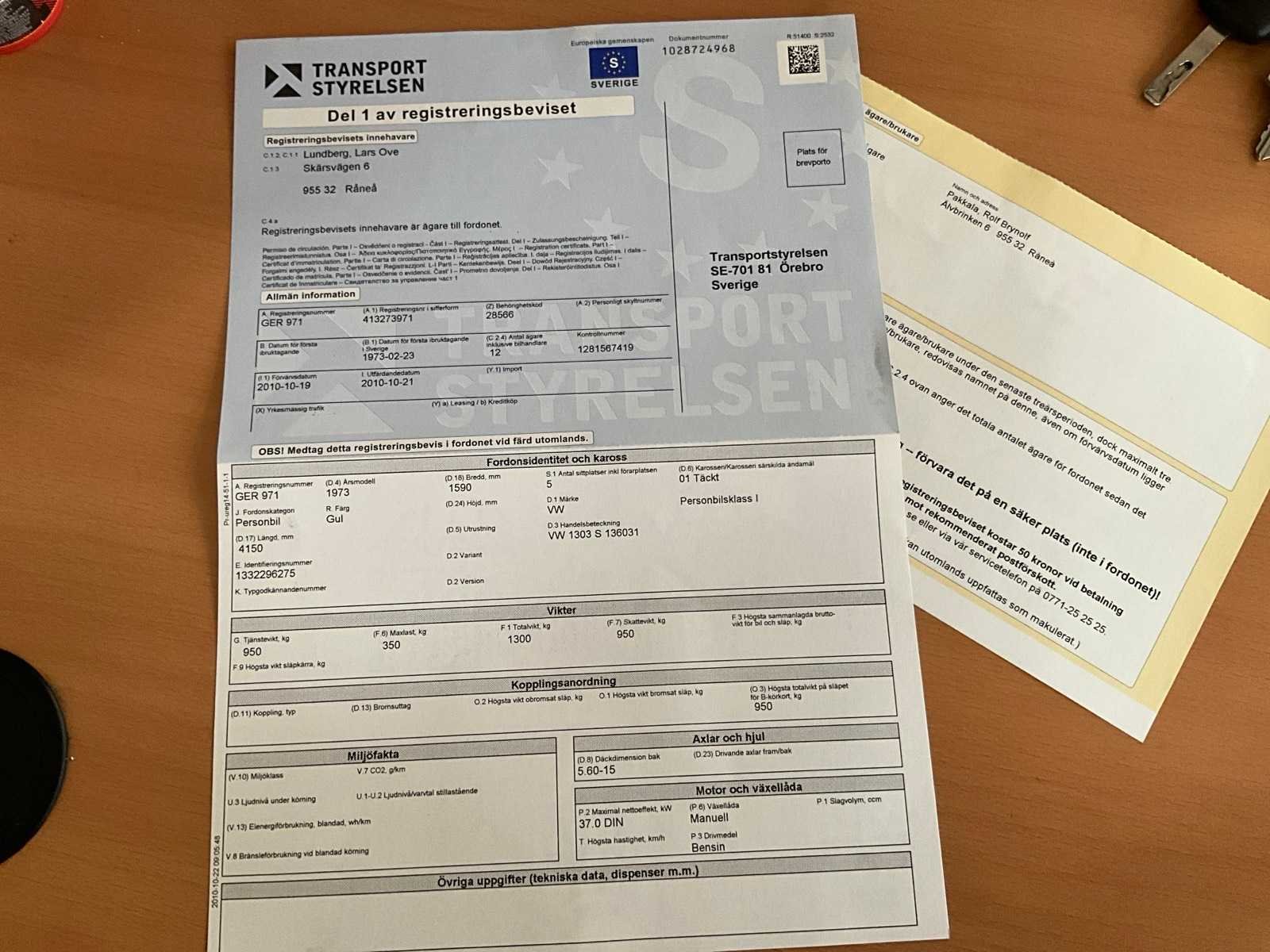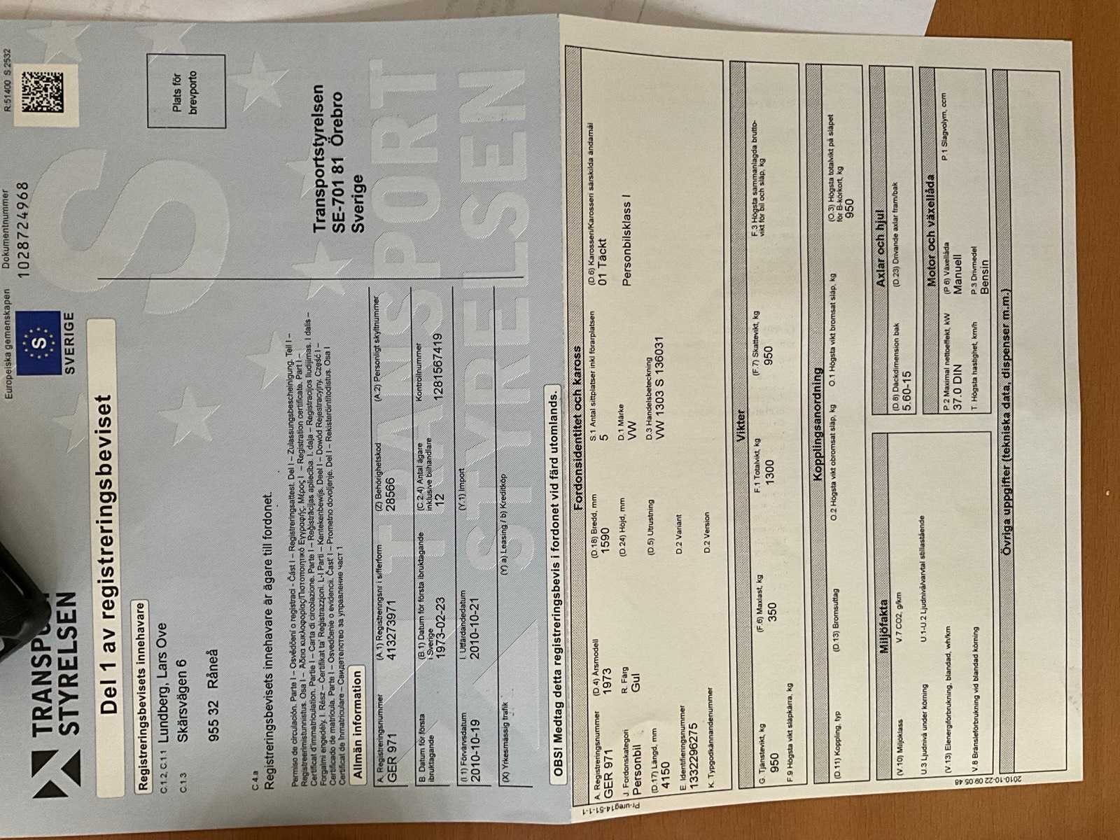 Merk: Volkswagen Type: Kever Bouwjaar: 1973 Chassisnummer: 1332296275 Afgelezen kilometerstand: 86376 Model: Kever Brandstof: Benzine Nationaliteit documenten: Fins Kentekenpapieren compleet?: true No self drive export!: true