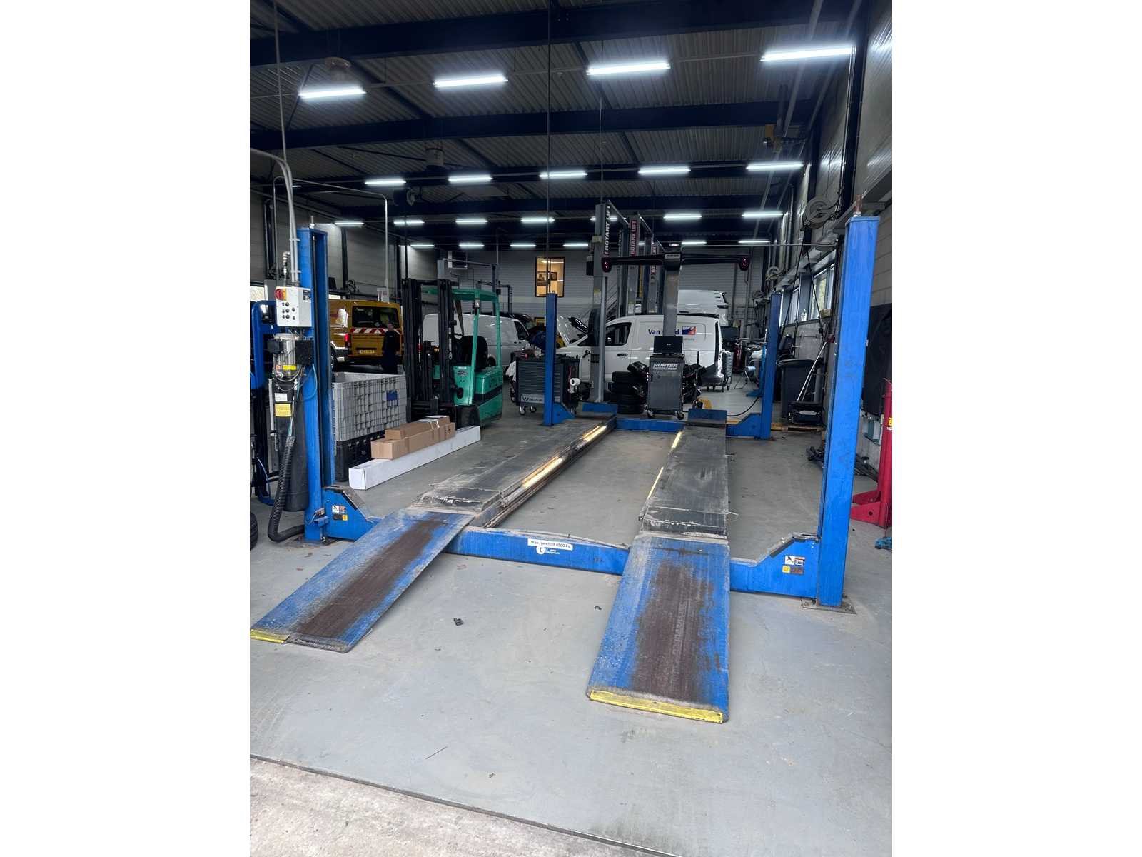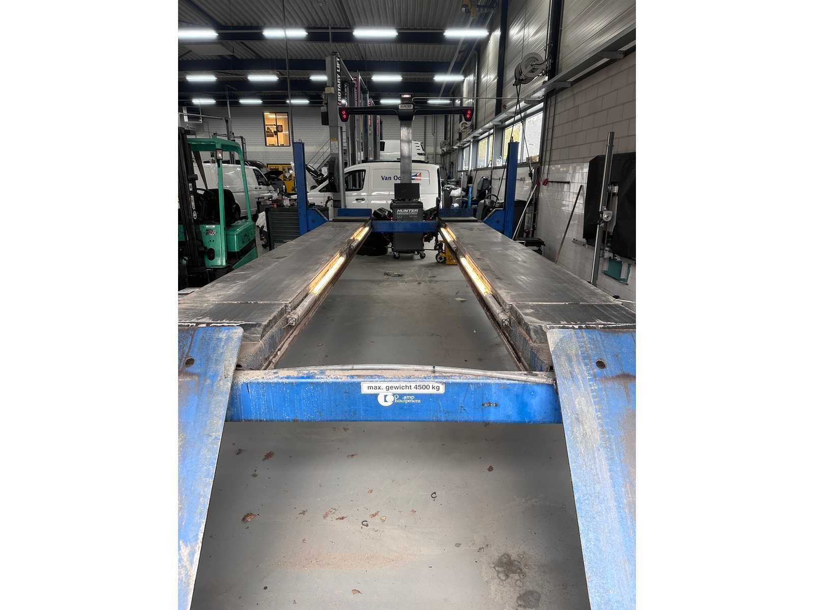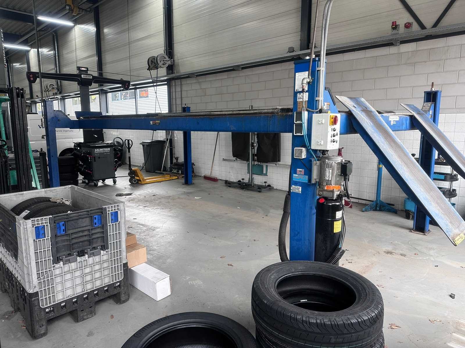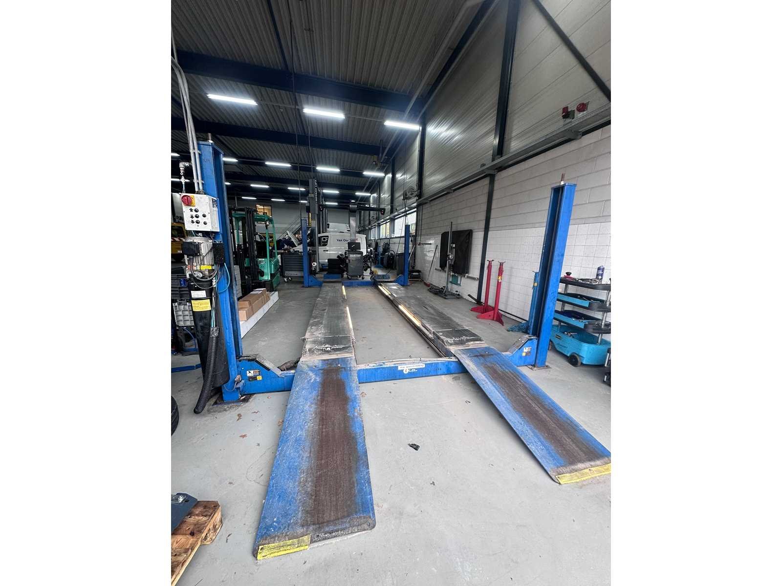 Extra brede en zware hefbrug, o.a. verlengde sprinters / bussen lange rijbanen ideaal voor uitlijnen 10000lbs capacity Model SM80-11 A. Rise 1730 mm B. Overall length 6985 mm C. Overall width 3499 mm D. Height of platforms 191 mm E. Platform length 5650 mm F. Platform width 660 mm G. Width between platforms 1093mm Motor performance 2.2 Kw 2.2 Kw * Electrical connection (3 phases) 380-415 v 380-415 v Compressed air connection 8 -10 bar 8 -10 bar Is al gedemonteerd opgeslagen op locatie heftruck aanwezig Merk: Rotary Type: SM80-11 4-koloms: true Aansluiting: 400V