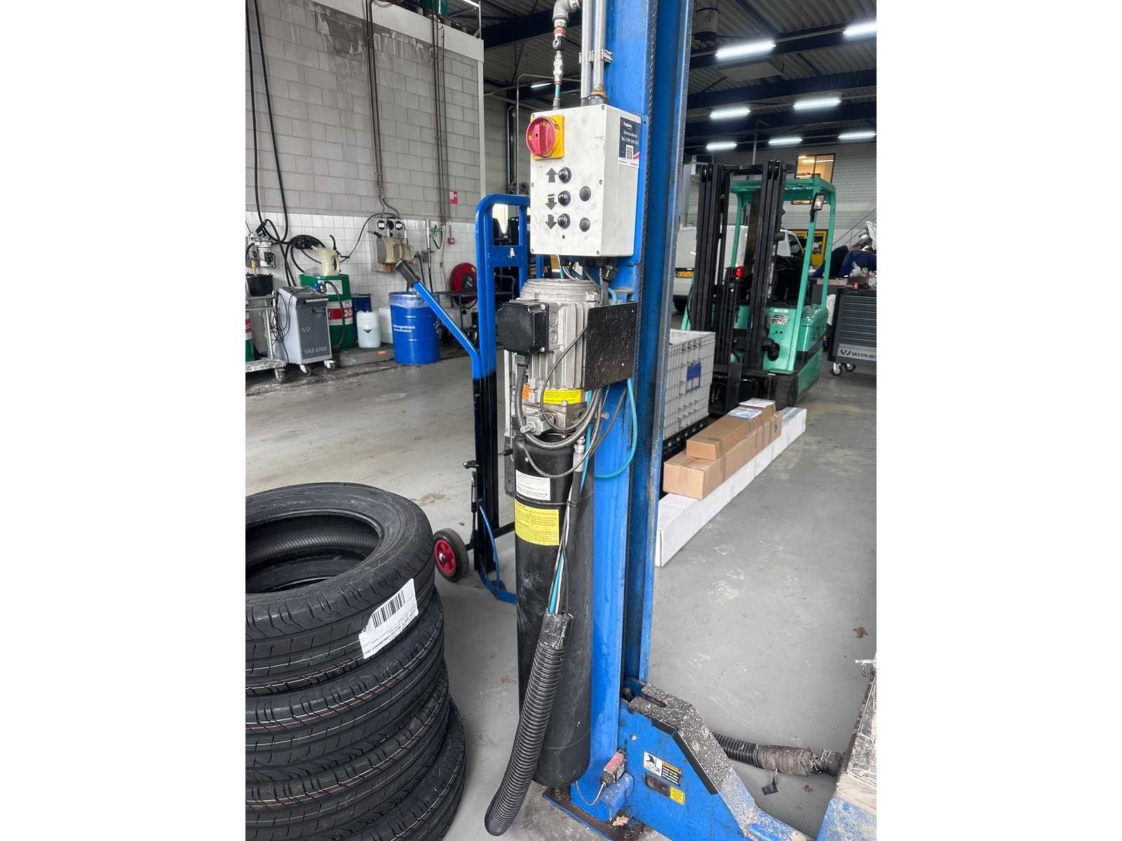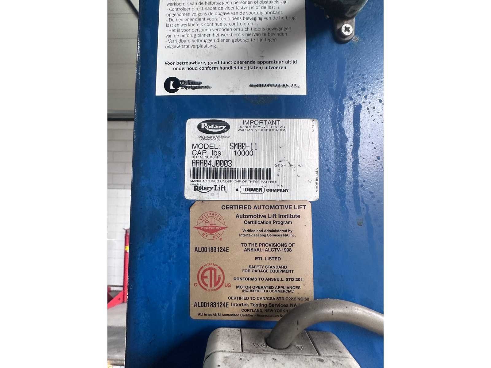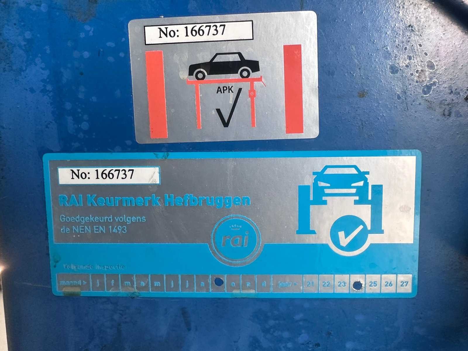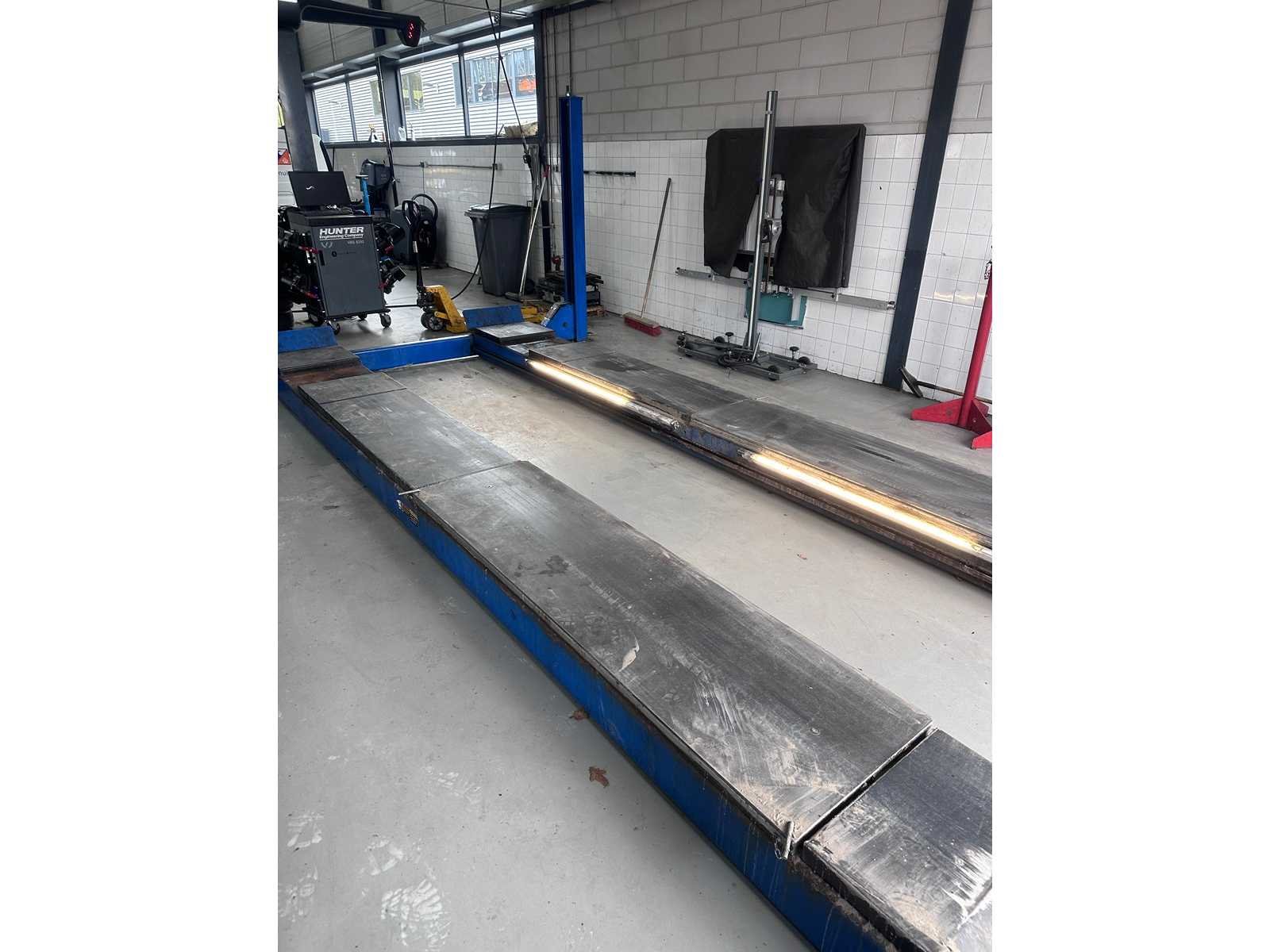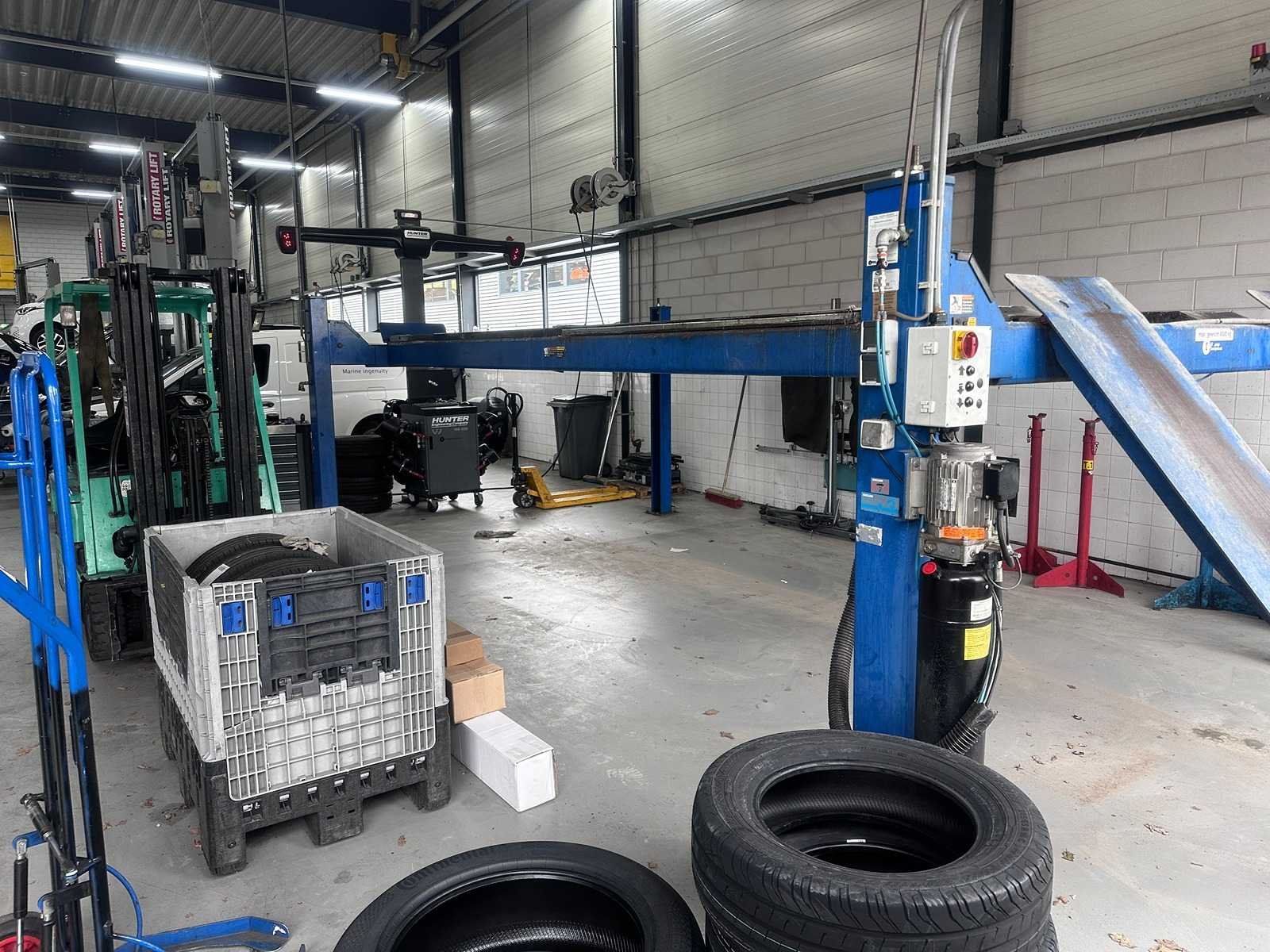 Extra brede en zware hefbrug, o.a. verlengde sprinters / bussen lange rijbanen ideaal voor uitlijnen 10000lbs capacity Model SM80-11 A. Rise 1730 mm B. Overall length 6985 mm C. Overall width 3499 mm D. Height of platforms 191 mm E. Platform length 5650 mm F. Platform width 660 mm G. Width between platforms 1093mm Motor performance 2.2 Kw 2.2 Kw * Electrical connection (3 phases) 380-415 v 380-415 v Compressed air connection 8 -10 bar 8 -10 bar Is al gedemonteerd opgeslagen op locatie heftruck aanwezig Merk: Rotary Type: SM80-11 4-koloms: true Aansluiting: 400V
