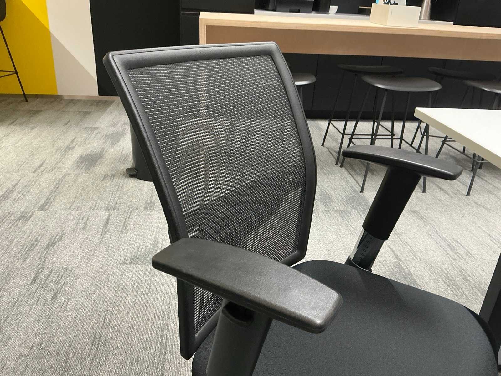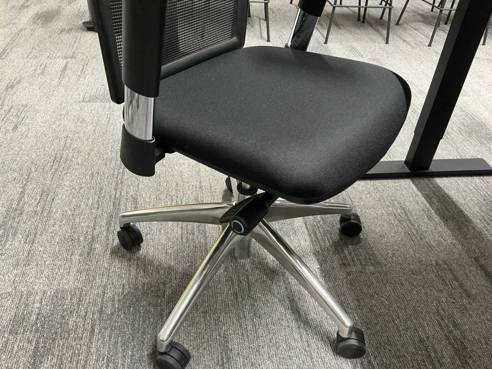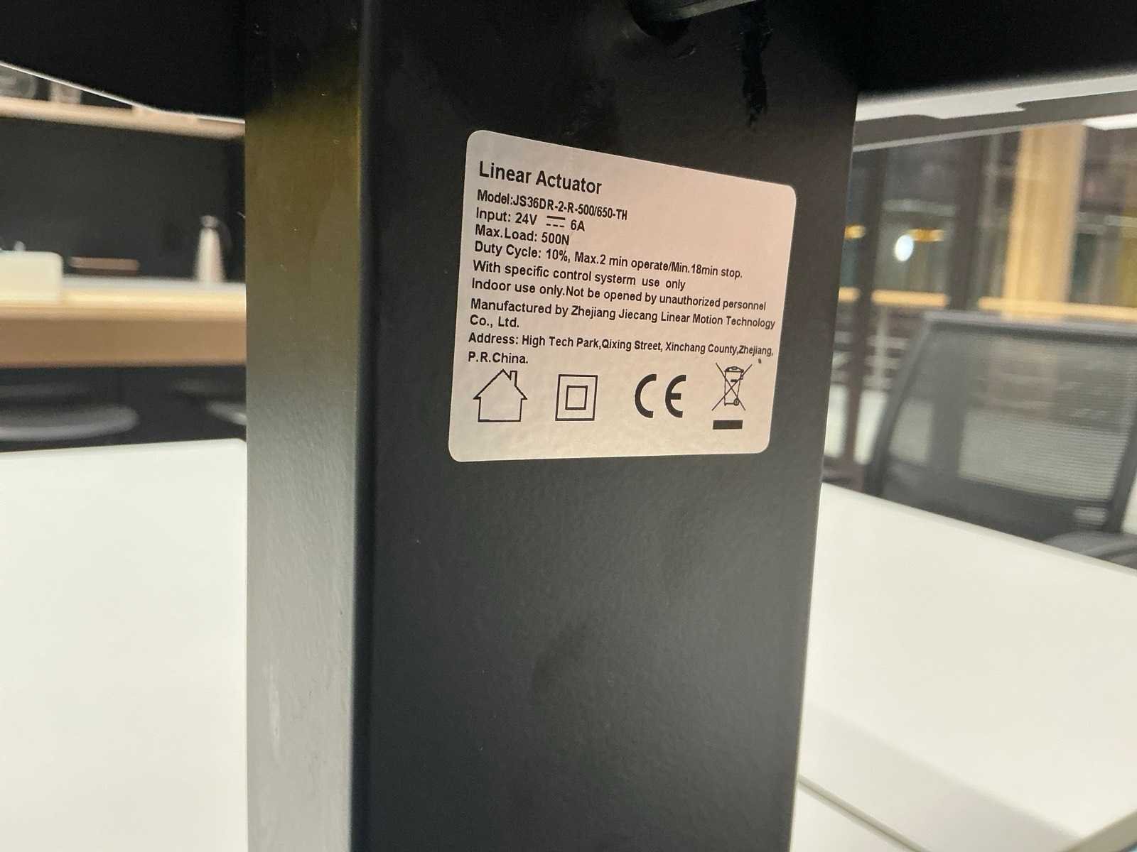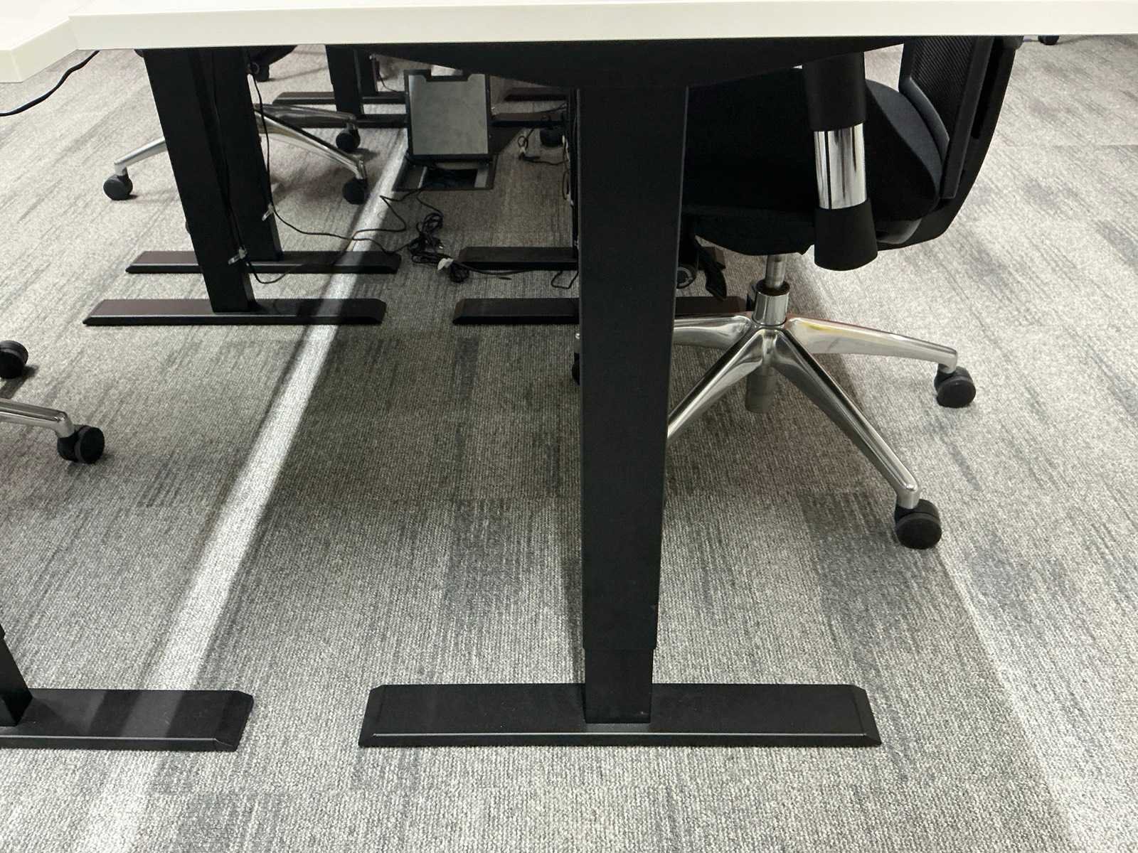 In hoogte verstelbaar middels drukknop, maximale hoogte 120cm. Kavel inclusief 6x bureaustoel met zwart stoffen bekleding op chroom kleurige voet. Zit-sta: true Elektrisch verstelbaar: true Kleur: Wit/zwarr Lengte: 120cm Breedte: 70cm