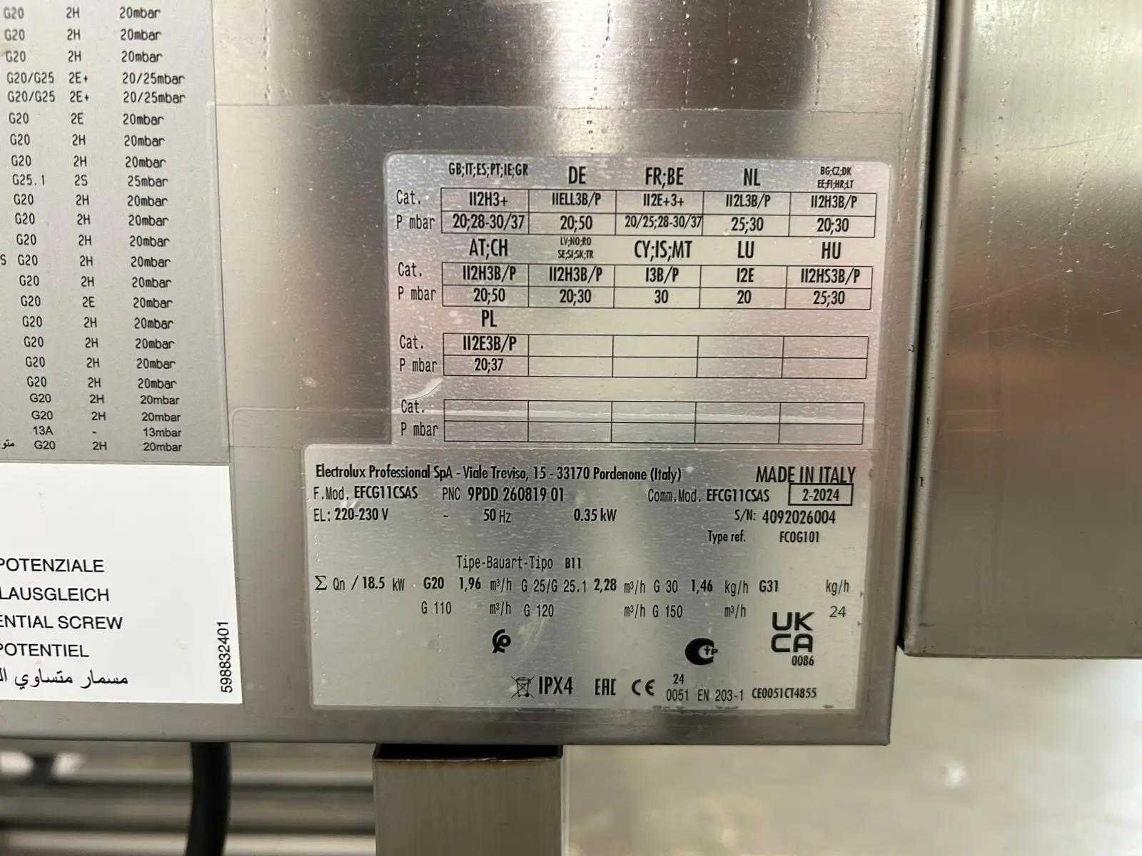 Capaciteit: 10 x1/1 GN Aansluitwaarde: Gas. Merk: Electrolux Bouwjaar: 2024 Type: 260819 Aansluiting: 230V Totale afmeting L: 90cm Totale afmeting Breedte: 100cm Totale afmeting Hoogte: 148cm