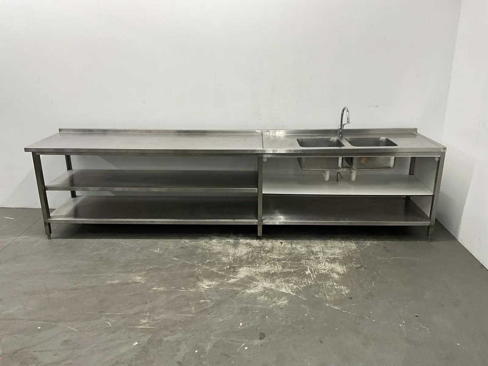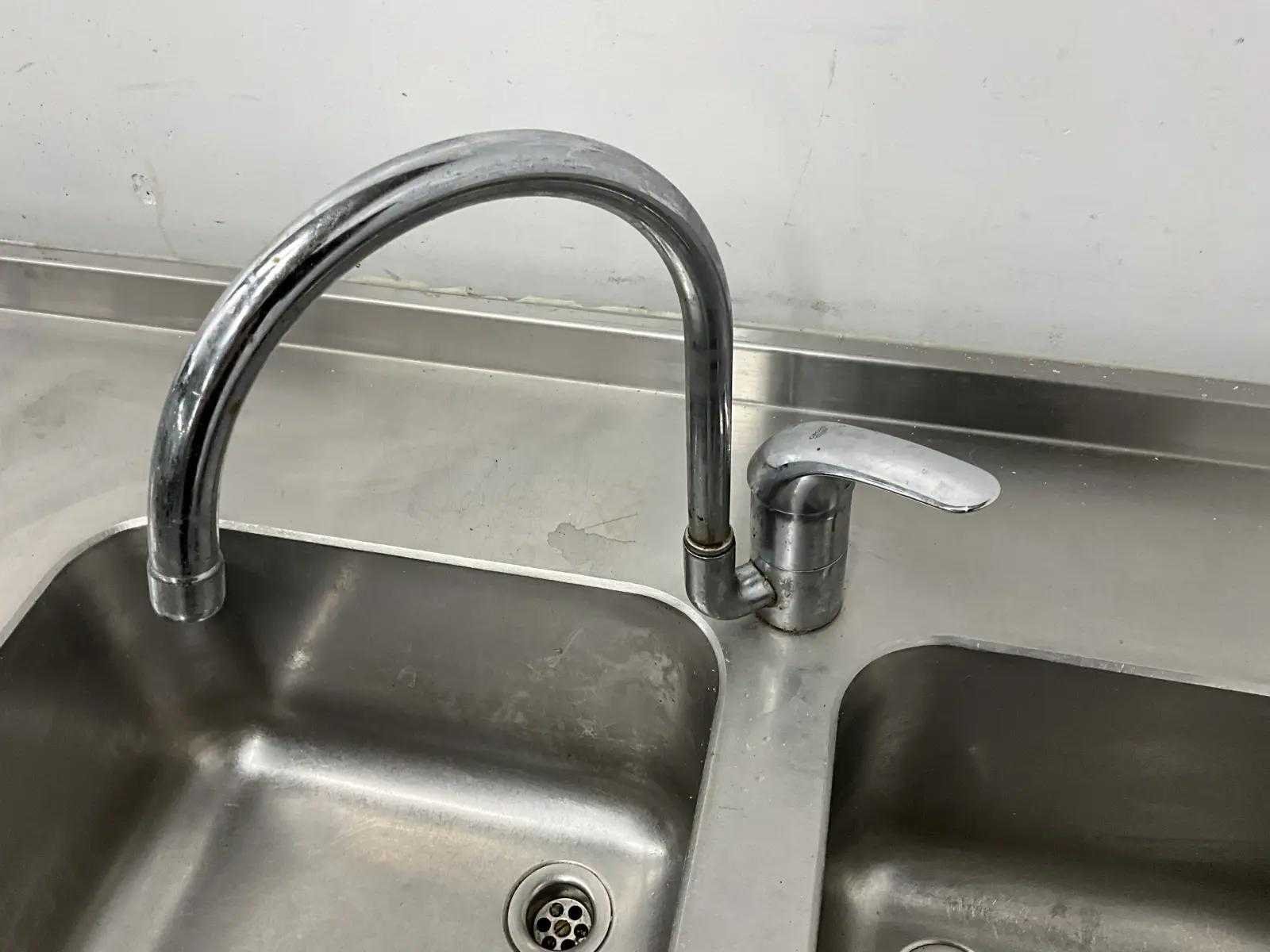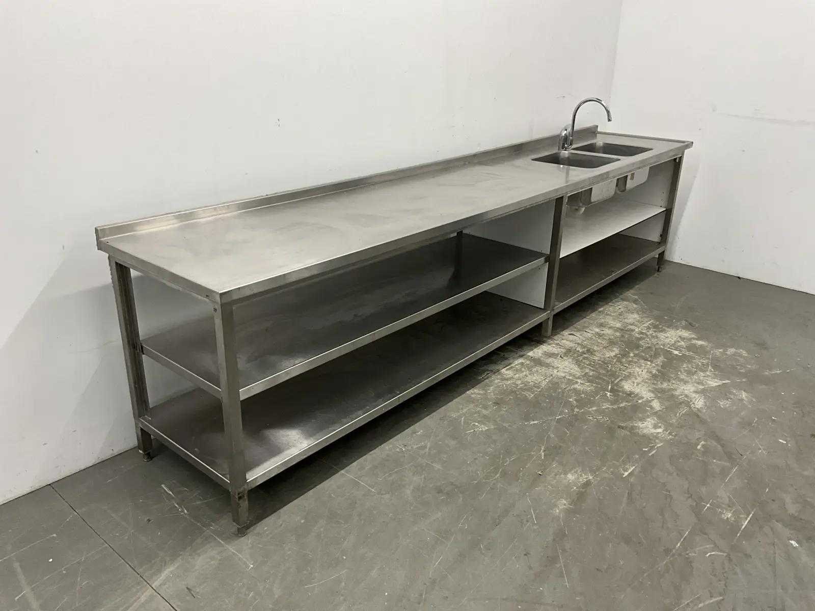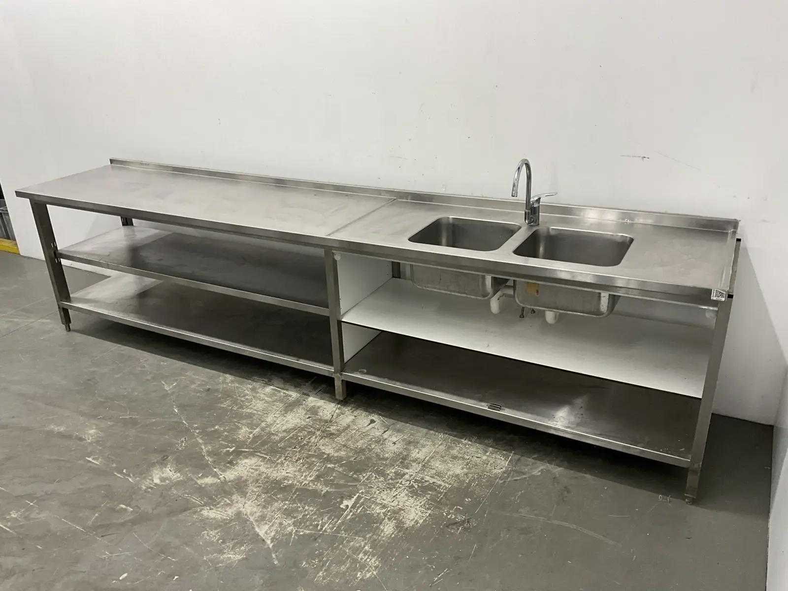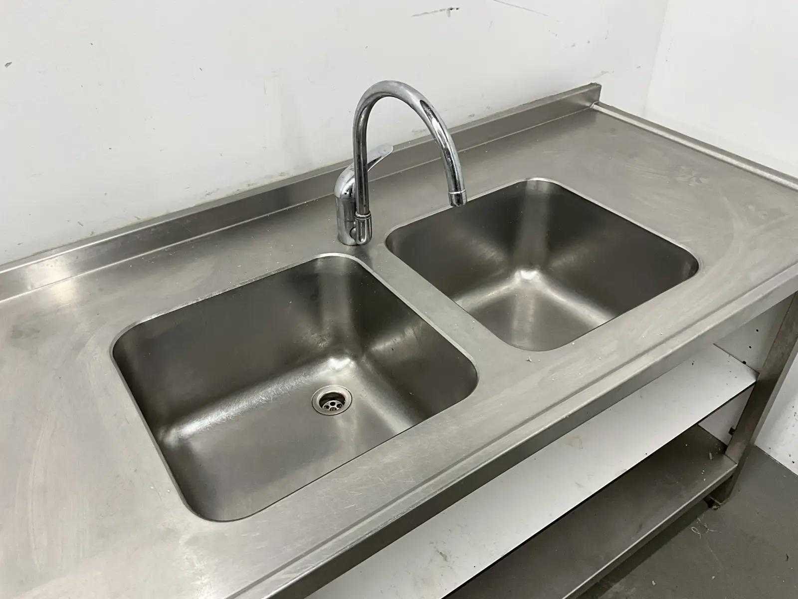 V.v. 2 spoelbakken en mengkraan. Afmeting spoelbakken (LxBxH): 40x40x25 cm. Lengte: 370cm Breedte: 70cm Hoogte: 93cm