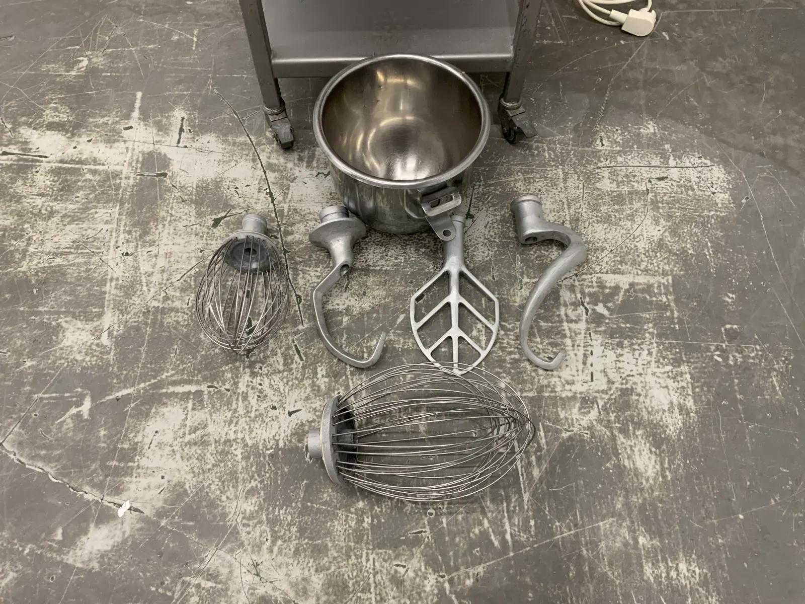 V.v. verrijdbaar 304 RVS onderstel, 2 mengkommen en 6 meng-accessoires. Merk: Hobart Type: NCM20 Aansluiting: 400V Totale afmeting L: 500mm Totale afmeting Breedte: 600mm Totale afmeting Hoogte: 1500mm