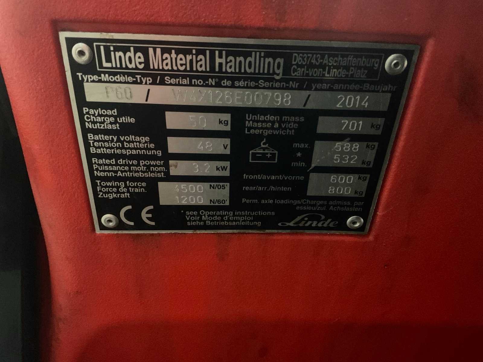Geen lader Merk: Linde Type: P 60 Bouwjaar: 2014 Serienummer: W4x126e007985 Elektrisch: true Trekcapaciteit: 4500kg Afgelezen urenstand: 8260 Eigen gewicht: 701kg Totale afmeting L: 1600mm Totale afmeting Breedte: 1000mm Totale afmeting Hoogte: 1600mm