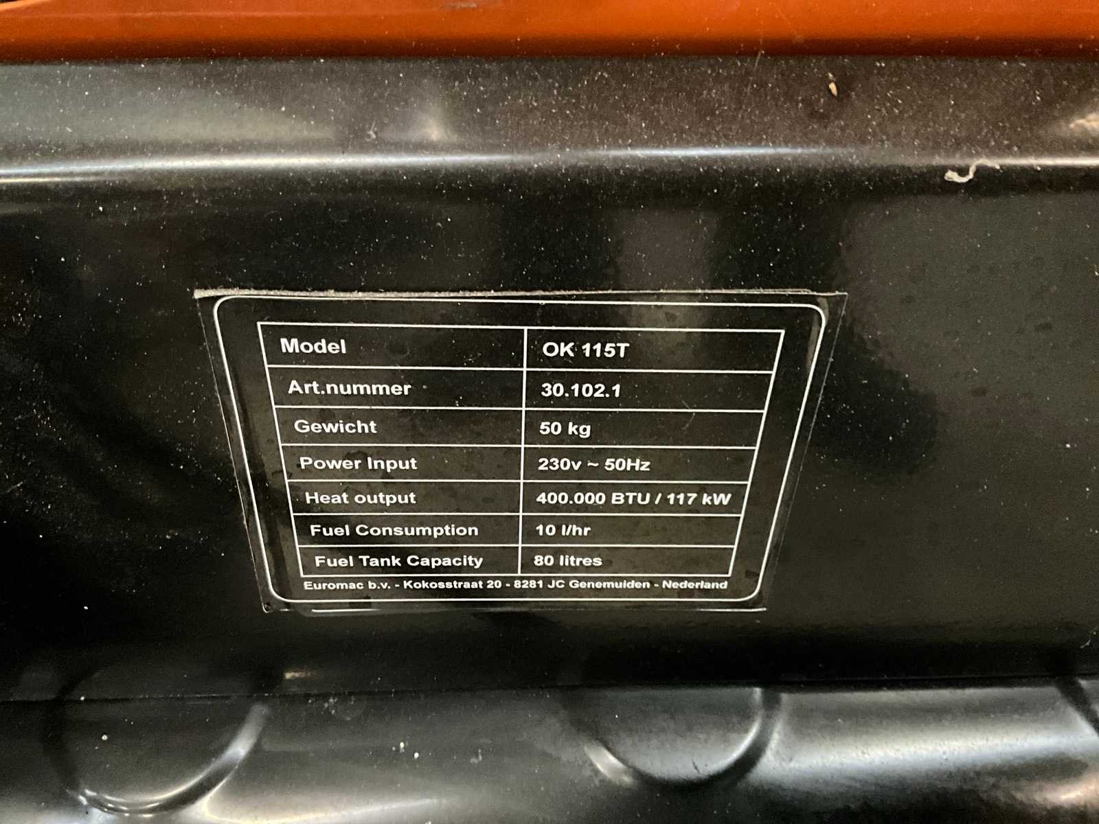 Voorzien van 80 liter brandstof opslag Merk: EUROM Type: OK115T Vermogen: 117kW Ventilator: true Thermostaat: true Eigen gewicht: 50kg Totale afmeting L: 1220mm Totale afmeting Breedte: 660mm Totale afmeting Hoogte: 850mm Aansluiting: 220V