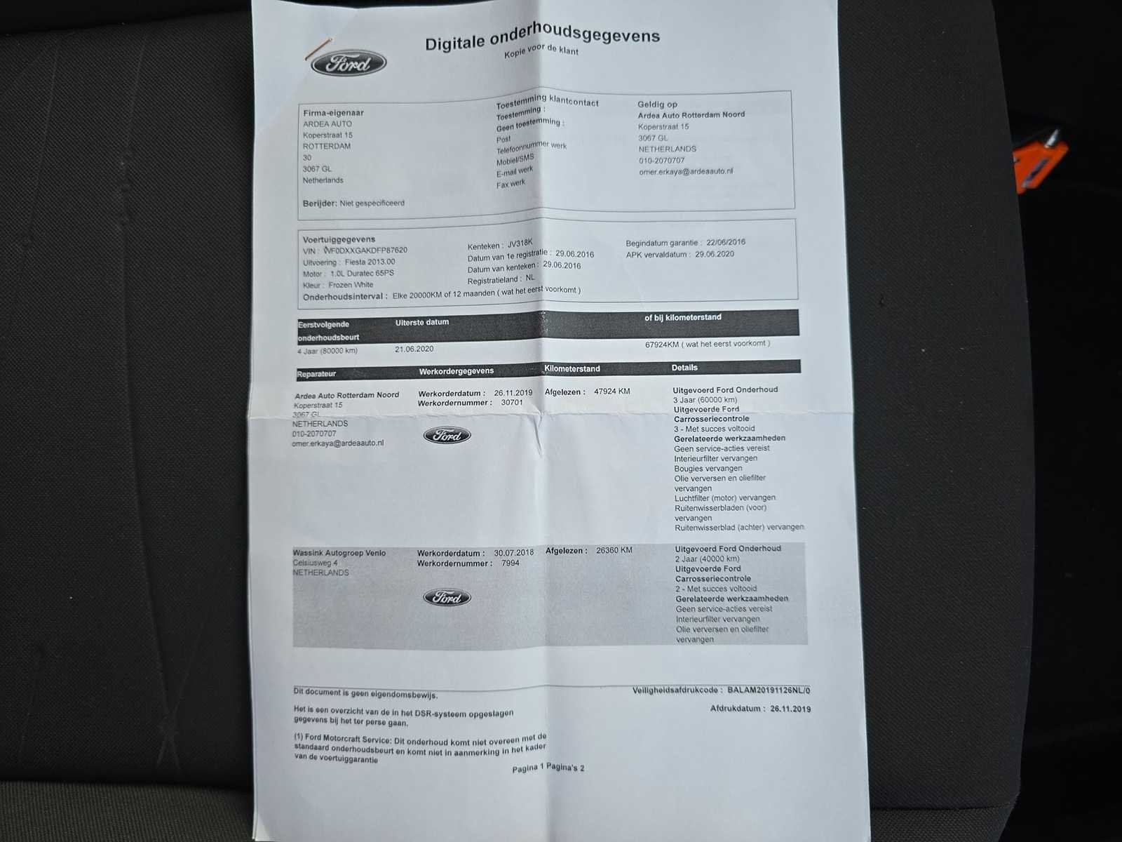 Kenteken: JV-318-K Merk: Ford Model: Fiesta Type: 1.0 White Edition Bouwjaar: 2016 Afgelezen kilometerstand: 58045km Cilinderinhoud: 998cc Vermogen (kW): 48kW Brandstof: Benzine Chassisnummer: WF0DXXGAKDFP87620 Datum eerste toelating: 2016-06-29 Datum eerste toelating (NL): 2016-06-29 APK vervaldatum: 2026-11-15 Vermogen (pk): 66hp Aandrijving: Start en rijdt Aantal zitplaatsen: 5 Kleur: wit Transmissie: Handgeschakeld Emissieklasse: 6 Aantal deuren: 4 Aantal sleutels: 1 Ledig gewicht: 955kg Bruto BPM (NL): 2029€ Aantal cilinders: 3 Carrosserie: hatchback Start en rijdt: Start and drive startinformatie : Start en rijdt