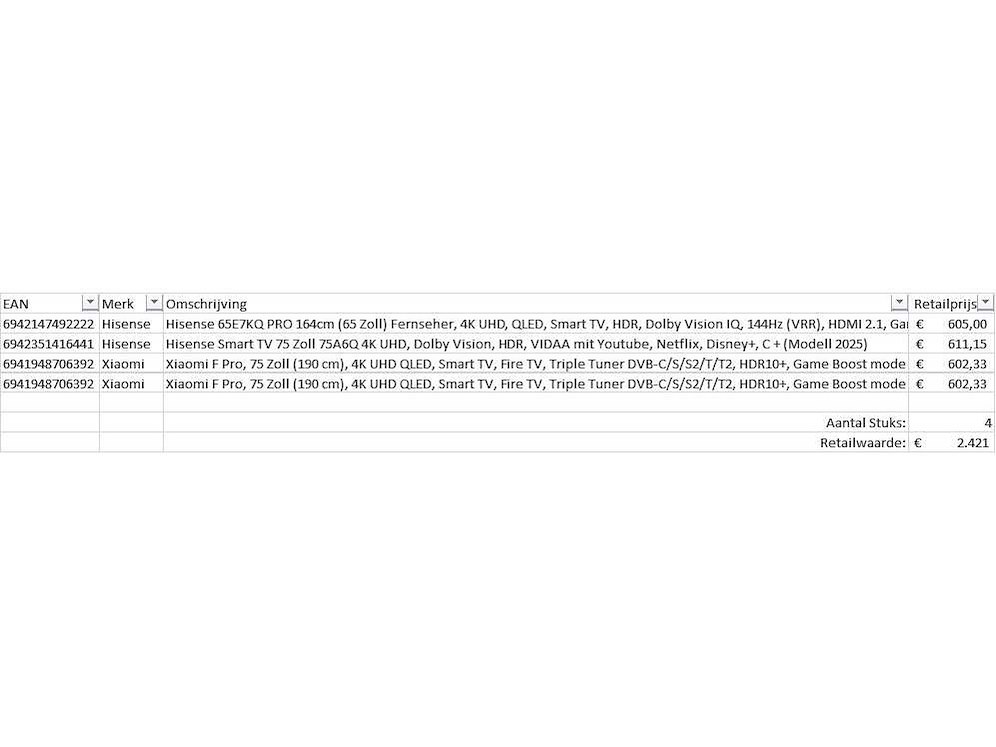 Dit betreft een partij televisies retourgoederen van een grote online retailer. De partij bestaat uit diverse diverse maten televisies. Aantal stuks: 4. Retailwaarde: €2421,- De televisies zijn niet werkend en zijn te gebruiken voor onderdelen. Kom op de kijkdag om te om zo een goed beeld te krijgen van de reden van retour. Zie foto's voor lijst met inhoud. Bezorgtermijn 14 dagen Merk: Pallet Retourgoederen - Televisies