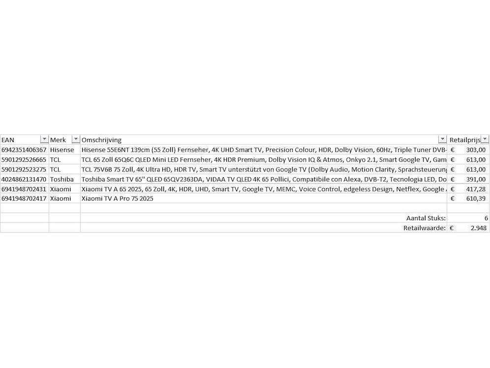 Dit betreft een partij televisies retourgoederen van een grote online retailer. De partij bestaat uit diverse diverse maten televisies. Aantal stuks: 6. Retailwaarde: €2948,- De televisies zijn niet werkend en zijn te gebruiken voor onderdelen. Kom op de kijkdag om te om zo een goed beeld te krijgen van de reden van retour. Zie foto's voor lijst met inhoud. Bezorgtermijn 14 dagen Merk: Pallet Retourgoederen - Televisies