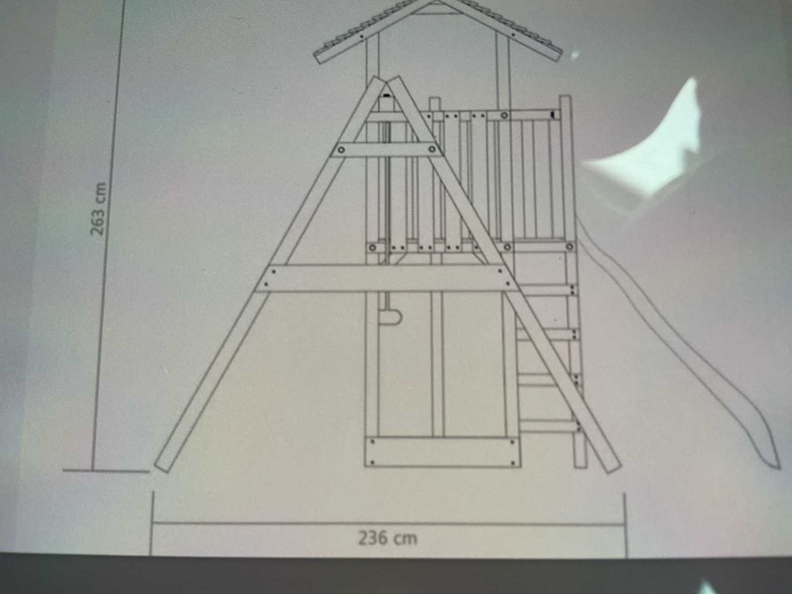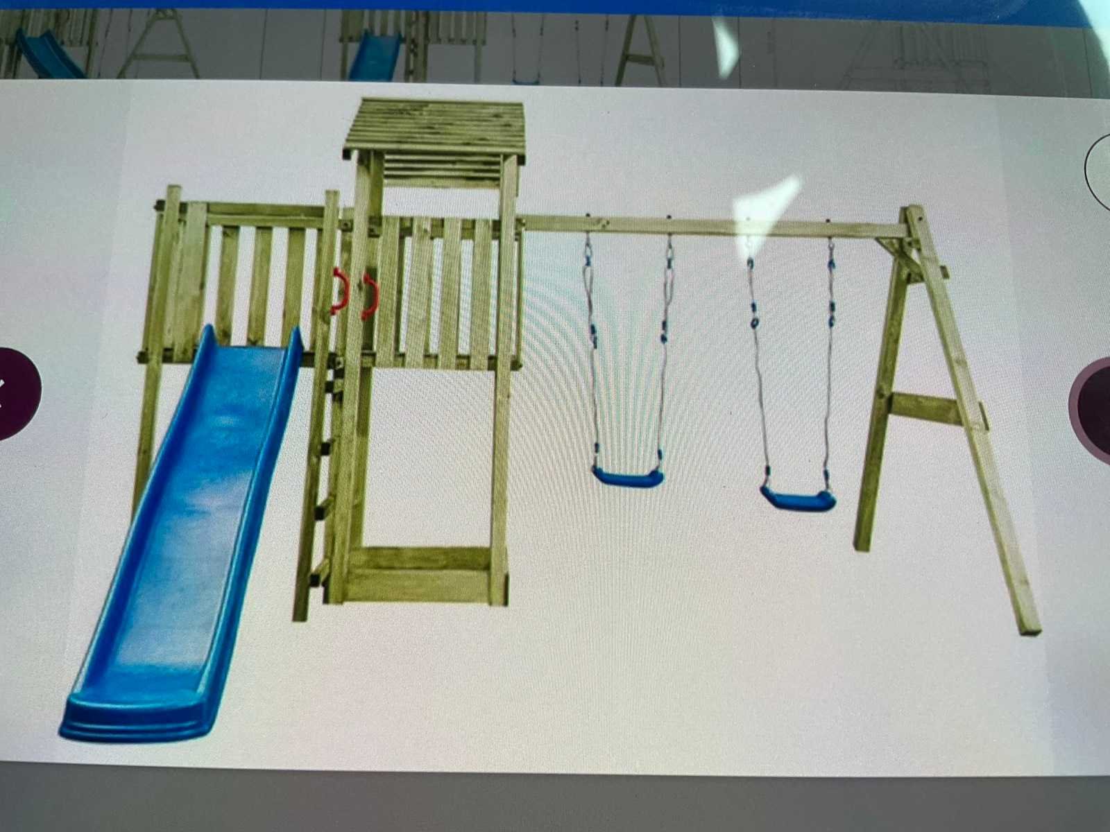 Wordt geleverd met glijbaan, schommels, handleiding en bevestigingsmaterialen. Lengte: 407cm Breedte: 340cm Hoogte: 263cm Materiaal: Grenen geimpregneerd