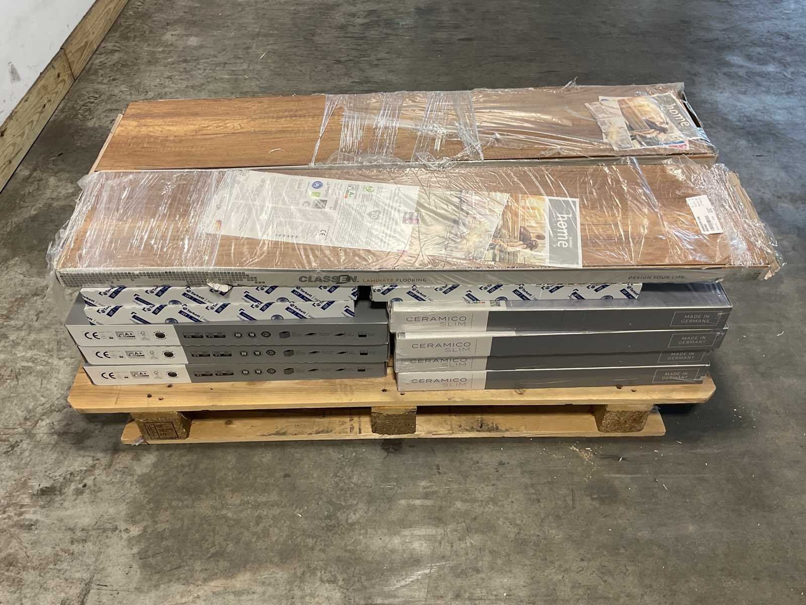 Mixpallet met diverse soorten laminaat – ongeveer 14 pakken, goed voor circa 30 m². Bekijk de foto’s voor specificaties en details.