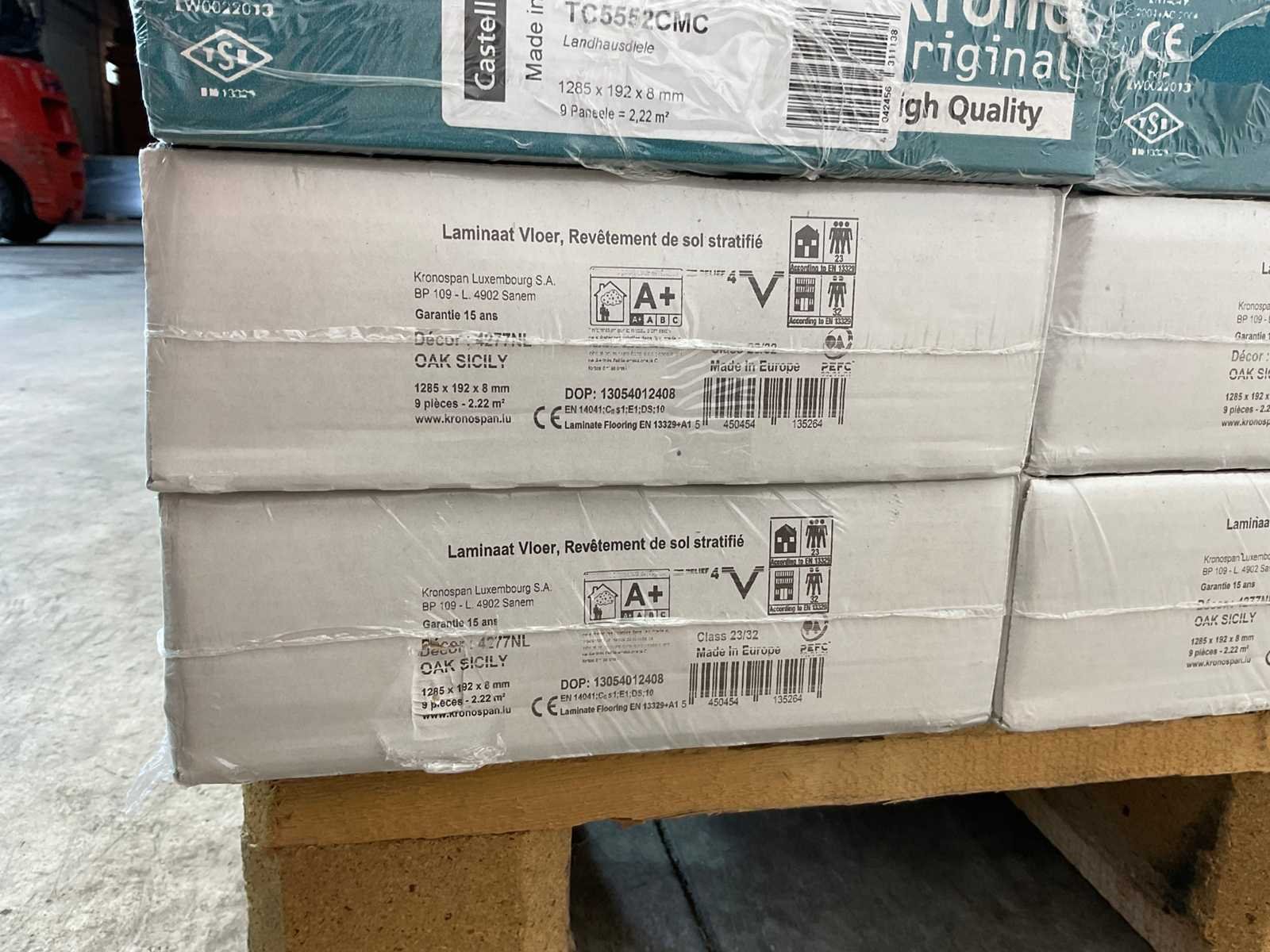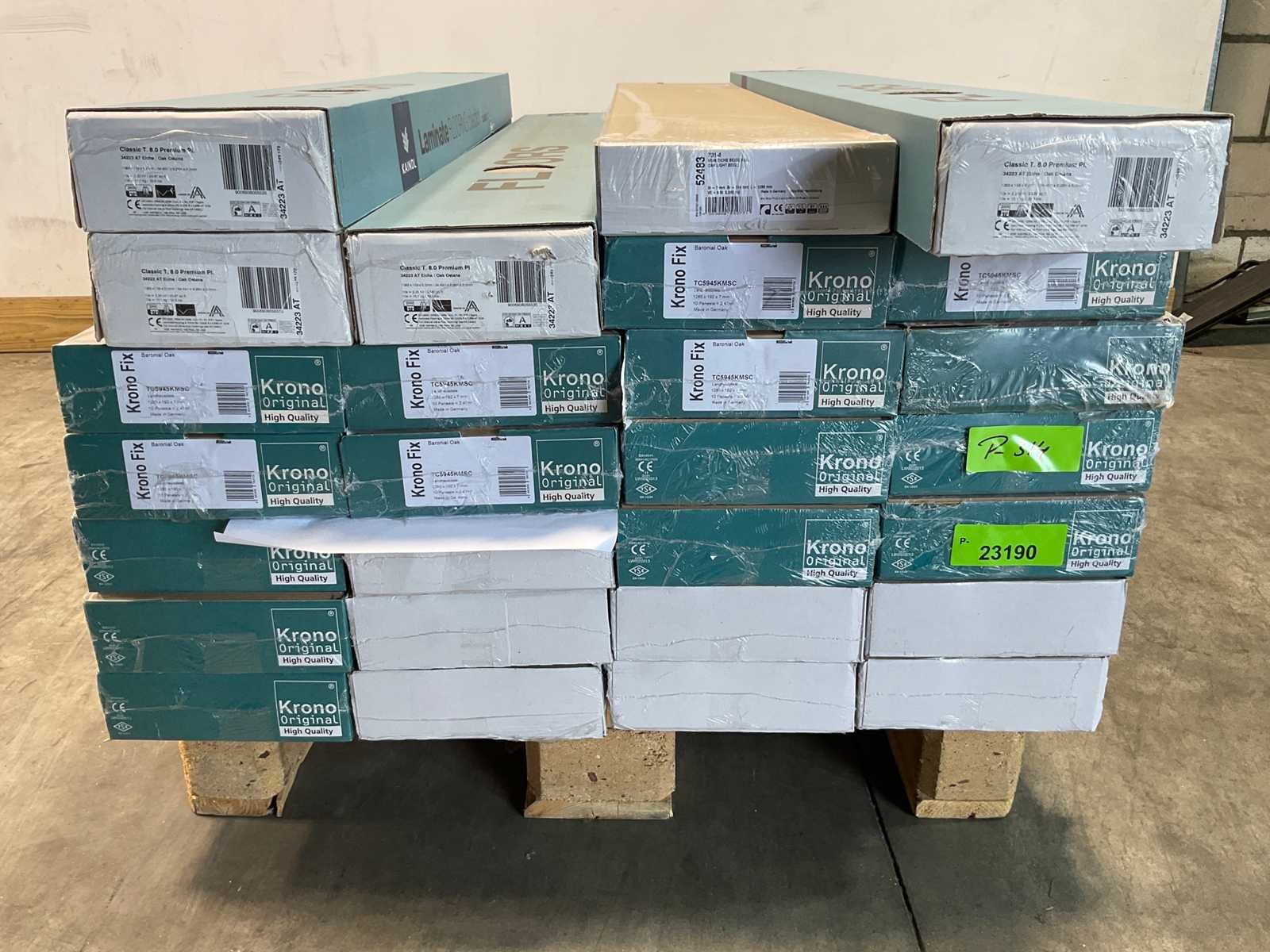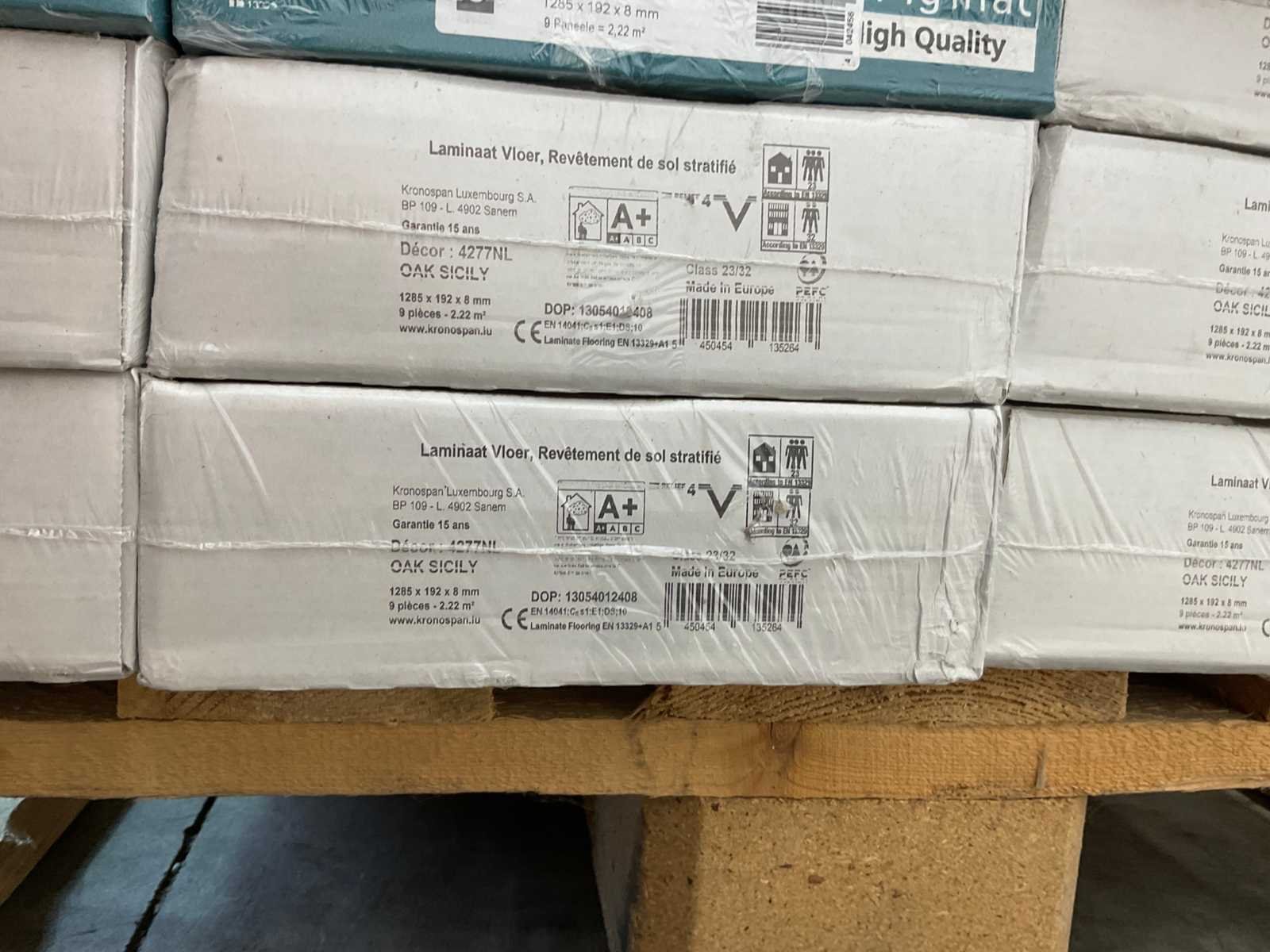 Mixpallet met diverse soorten laminaat – ongeveer 27 pakken, goed voor circa 60 m². Bekijk de foto’s voor specificaties en details.