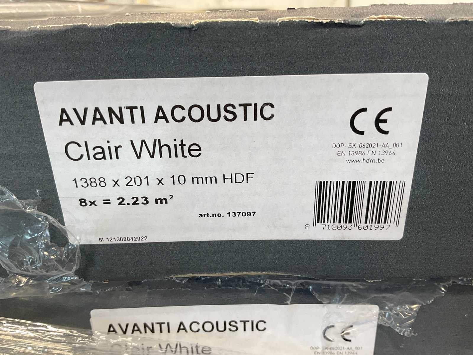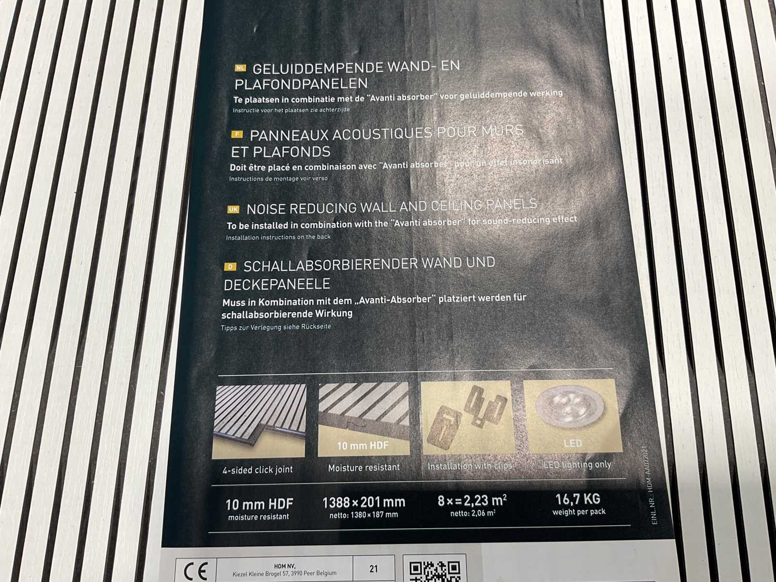 De Avanti Acoustic panelen combineren een modern lattenwand design met functionele geluidsdemping en zijn daarmee de ideale keuze voor zowel wanden als plafonds. Gemaakt van 10 mm vochtwerend HDF met een hoogwaardig melamine oppervlak, bieden ze een duurzame en stijlvolle afwerking. De panelen hebben een formaat van 138,8 x 20,1 cm en worden geleverd in pakken van 8 stuks (2,23 m²) met een gewicht van 16,7 kg per pak. Dankzij de klikverbinding aan vier zijden zijn de panelen snel, strak en naadloos te monteren met clips, wat zorgt voor een professionele uitstraling met minimale inspanning. Merk: HDM Model: Avanti Product type: Wandpaneel Kleur: Clair white Gewicht: 16,7kg Lengte: 138.8cm Breedte: 20.1cm Hoogte: 1cm Materiaal: HDF