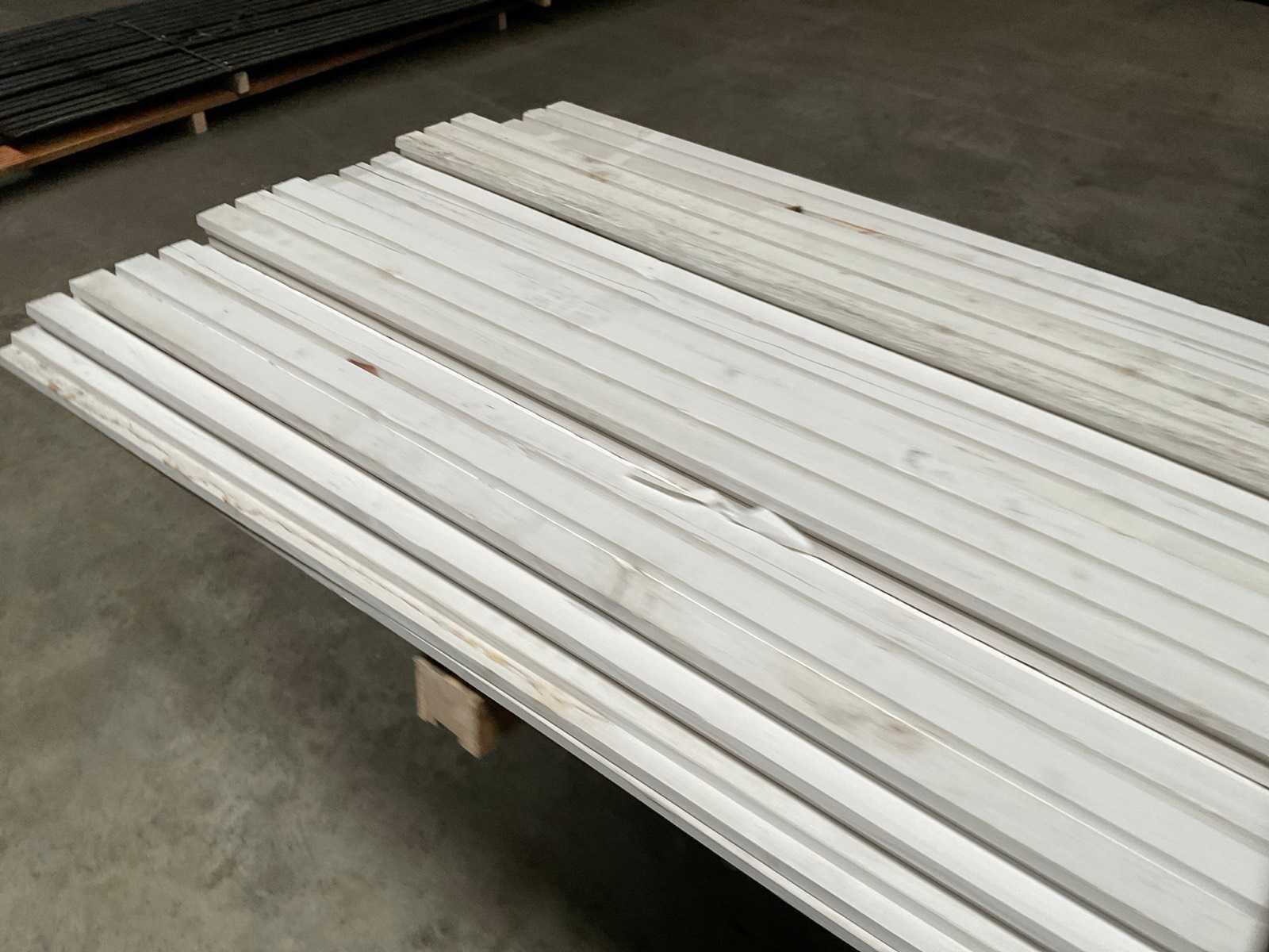 Douglas dubbel rhombusprofiel wit 300x14,5x2,1 cm. Kleine beschadigingen. Houtsoort: Douglas Lengte: 300cm Kopmaat: 21x145 Kleur: Wit gespoten Gewicht: 300kg