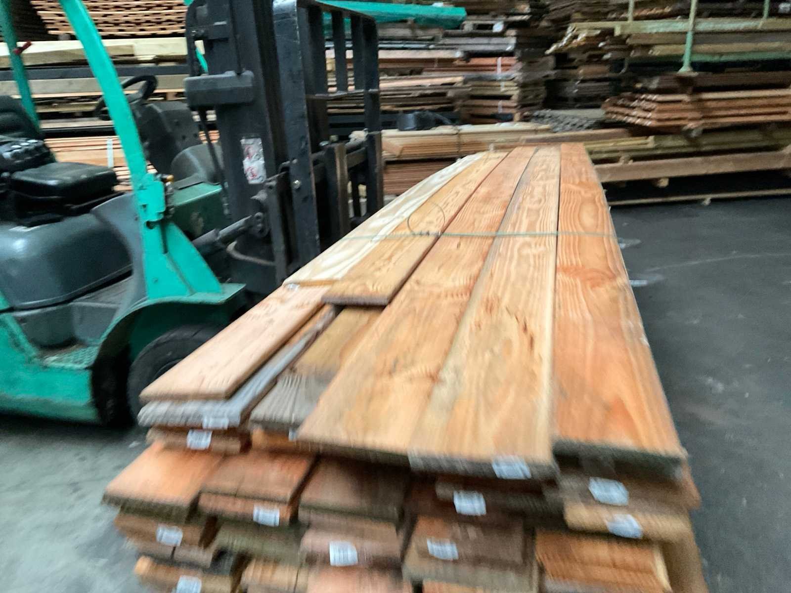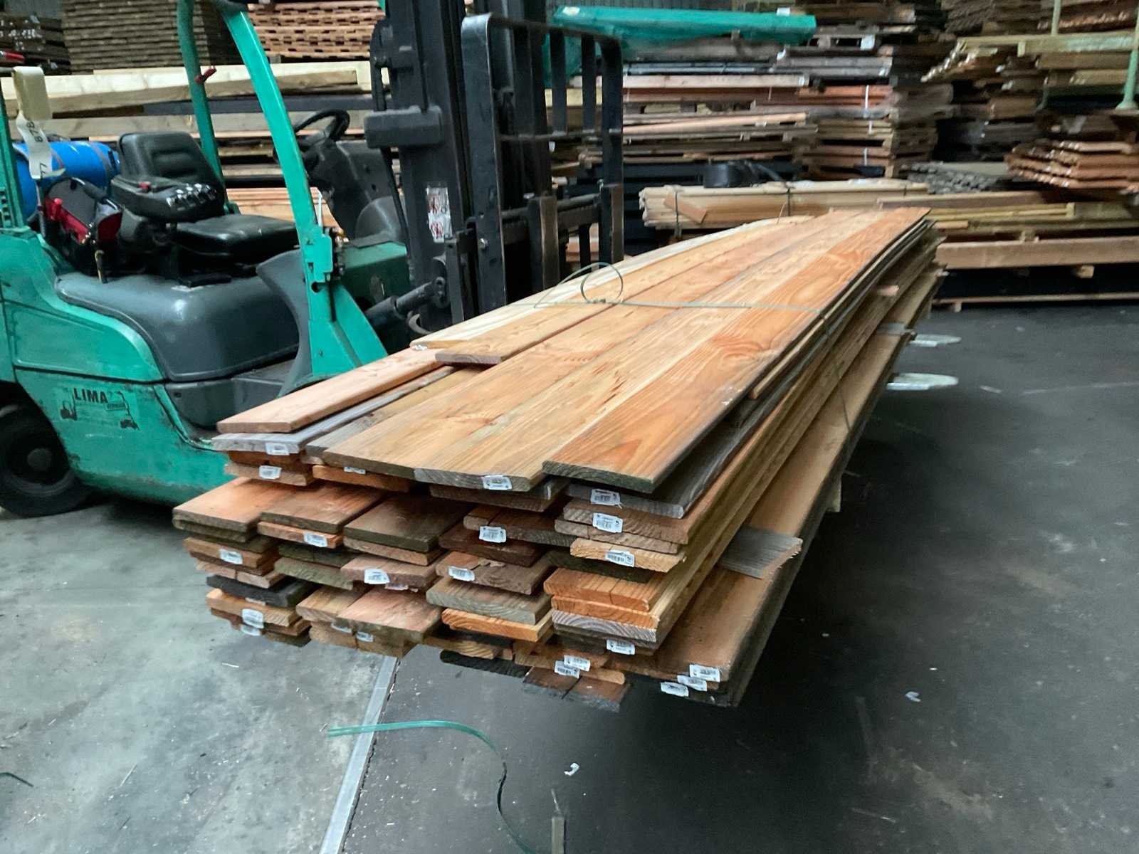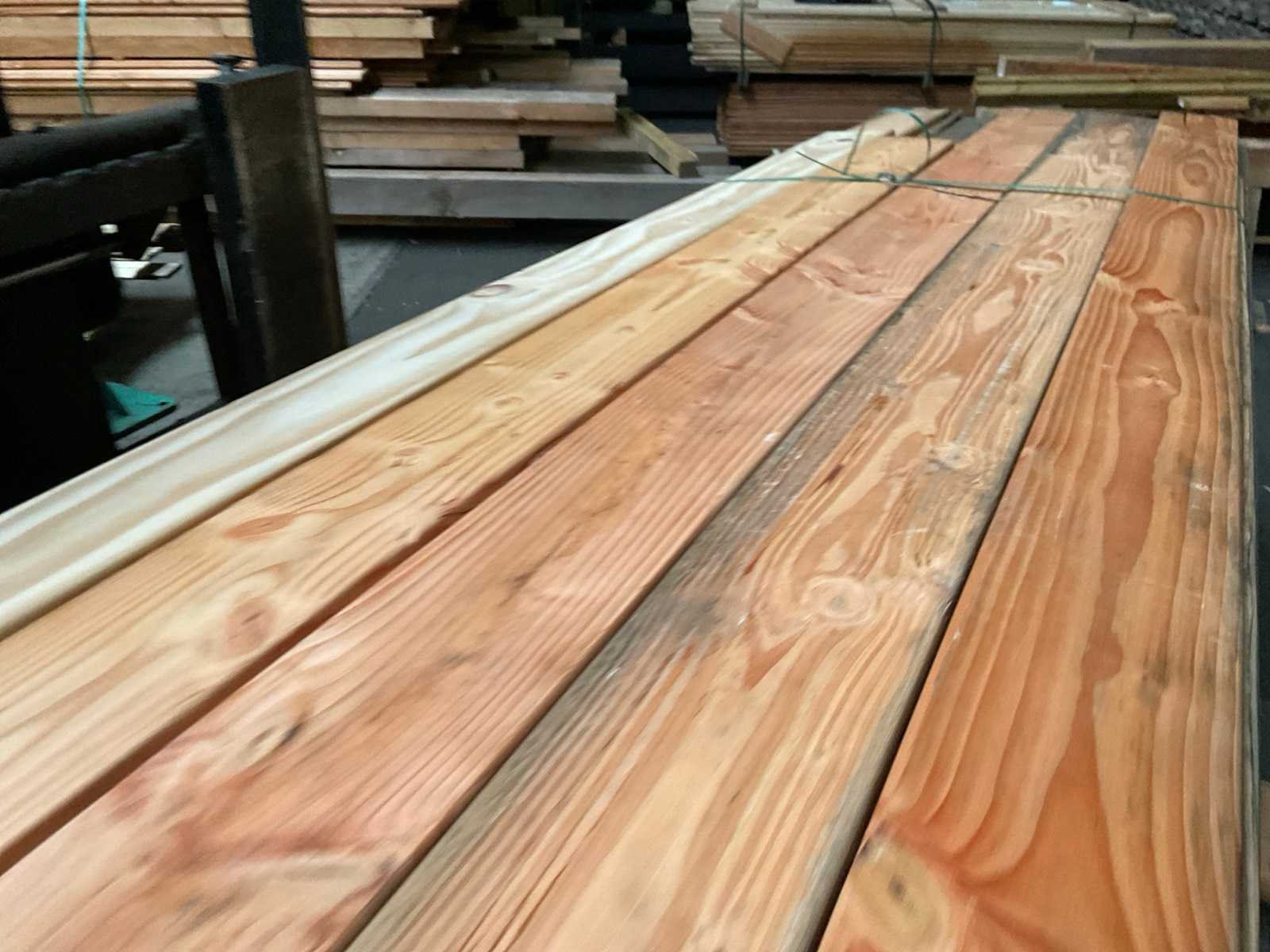 Lengte ca. 300 cm. Gemixt in kopmaten: 16×140 mm, 18×145 mm en 18×160 mm. Totaal ca. 80 stuks. Kleine beschadigingen en verkleuringen aanwezig, zie foto's. Houtsoort: Douglas Lengte: 300cm Kopmaat: 17x140 Gewicht: 875kg