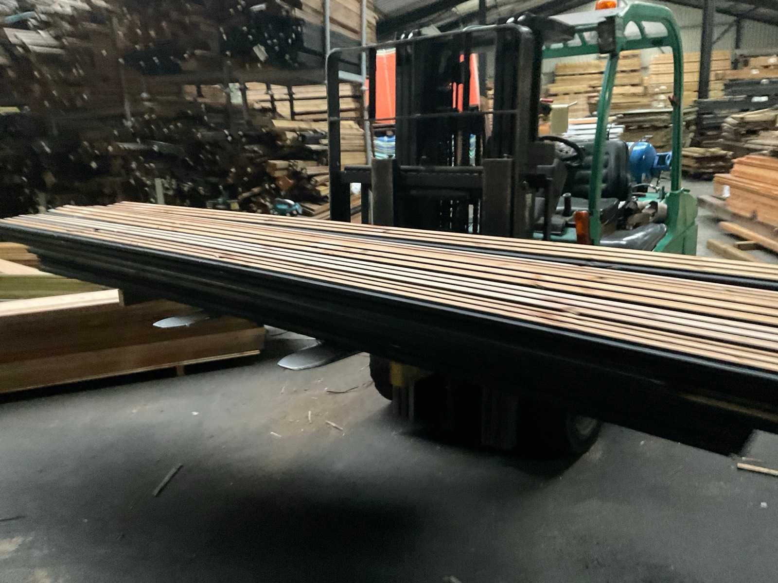 Douglas triple rhombusprofielplanken, 14,5×2,8 cm (totaal 50 stuks). 20 stuks van 300 cm en 30 stuks van 400 cm. Vergrijzing en lichte beschadigingen aanwezig. Houtsoort: Douglas Materiaal: Zwart gespoten Lengte: 400cm Kopmaat: 28x145 Gewicht: 875kg