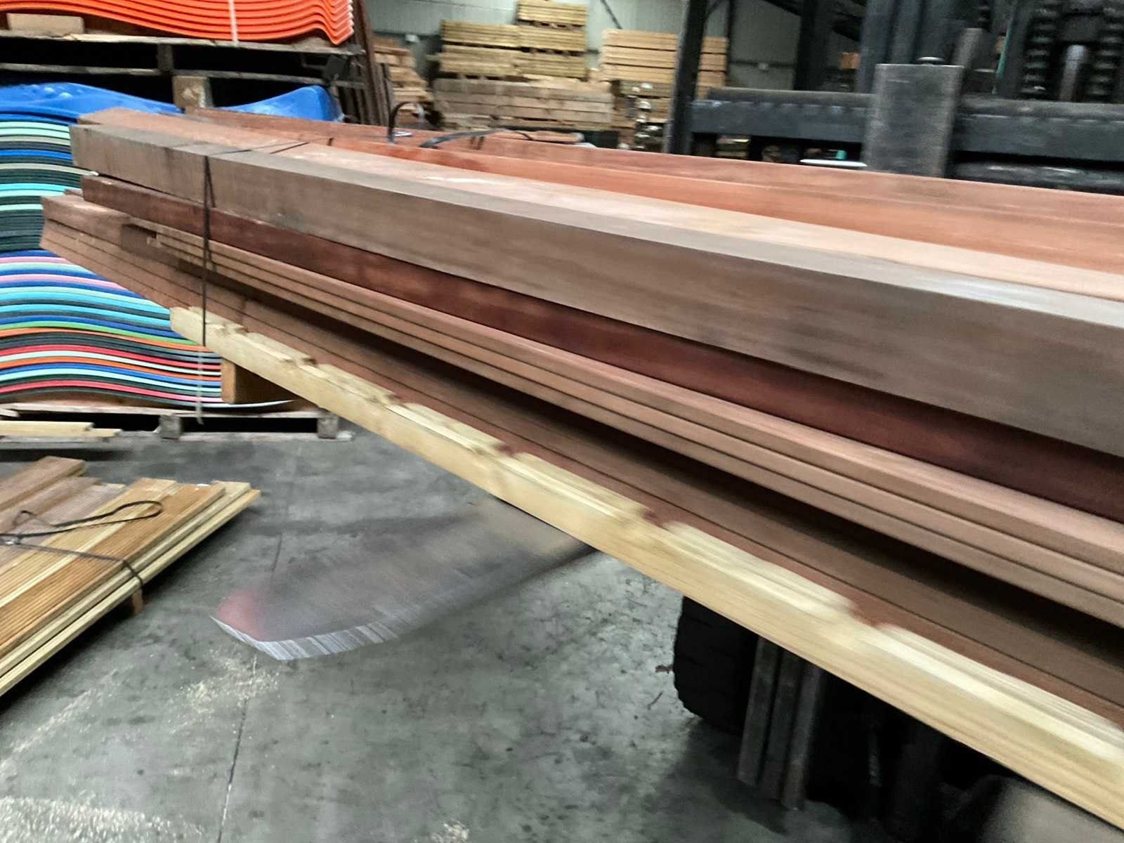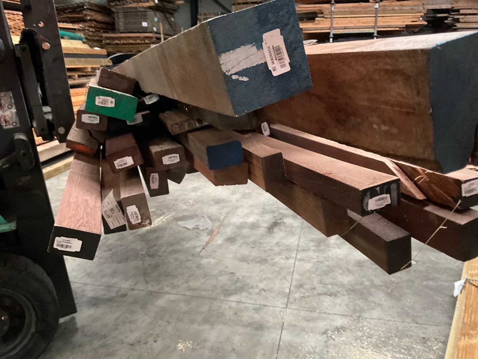 Partij Azobé hardhout met diverse beschadigingen en verkleuringen. Verschillende modellen en verschillende kopmaten aanwezig. Zie foto’s voor alle details en specificaties. Houtsoort: Azobé hardhout Lengte: 500cm Gewicht: 900kg
