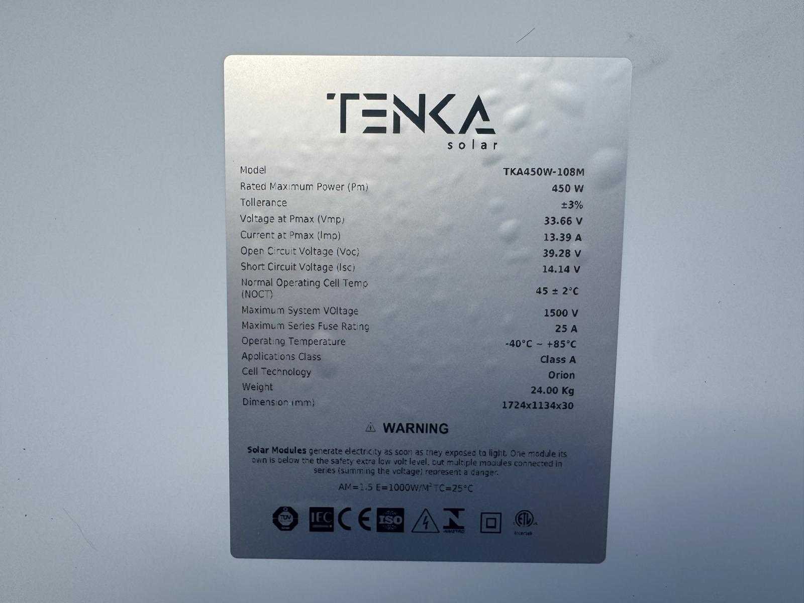 Set van 36 zonnepanelen Tenka TKA450W-108M (450 Wp) met GoodWe GW15k (3-fase) omvormer: GoodWe GW15k (3-fase) totaal vermogen: 16.200 Wp vermogen: 450 Wp per zonnepaneel conditie: nieuw Merk: Tenka Type: TKA450W-108M Max. dc power: 450W Eigen gewicht: 24kg Totale afmeting L: 1724mm Totale afmeting Breedte: 1134mm Totale afmeting Hoogte: 30mm