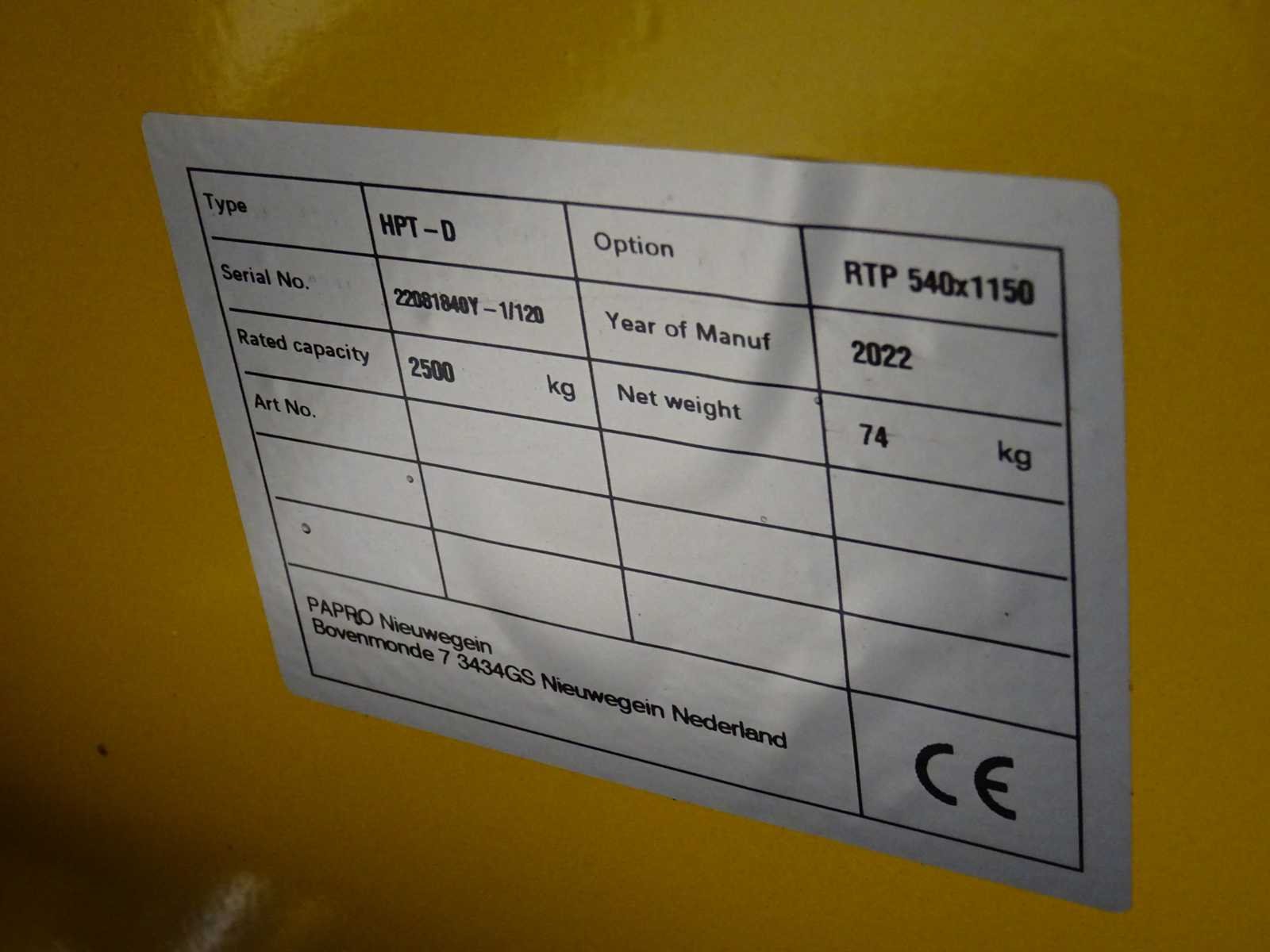 Merk: Papro Type: HPT-D Bouwjaar: 2022 Hefvermogen: 2500kg Lepellengte: 1150mm