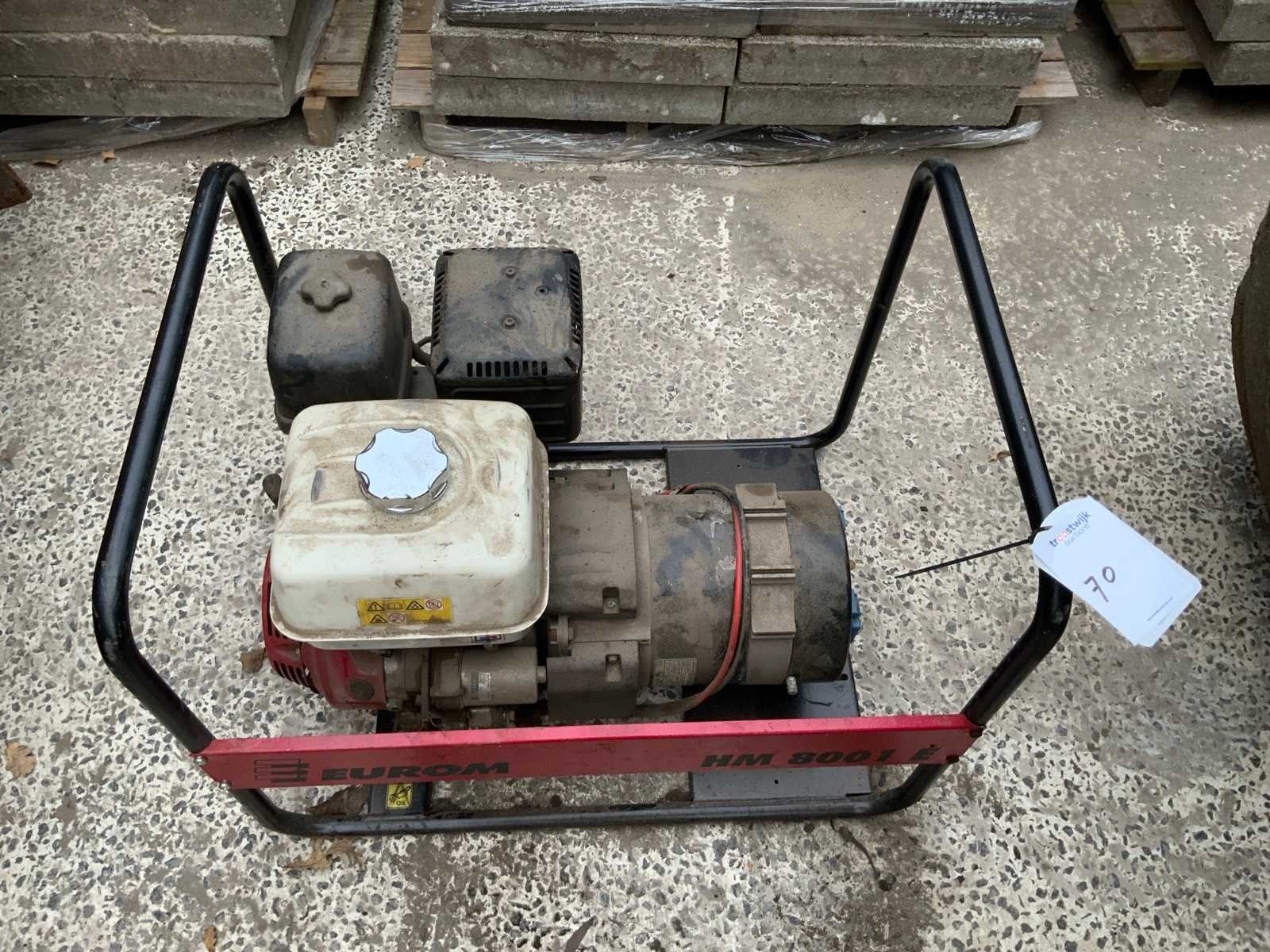 Aansluiting 2x 230 volt, frequentie 50 HZ Merk: Eurom Type: HM 8001 E Bouwjaar: 2011 Capaciteit.: 7kVA Benzine: true Type motor: Honda GX 390 Aantal cilinders: 1 Luchtgekoeld: true Totale afmeting L: 760mm Totale afmeting Breedte: 570mm Totale afmeting Hoogte: 600mm
