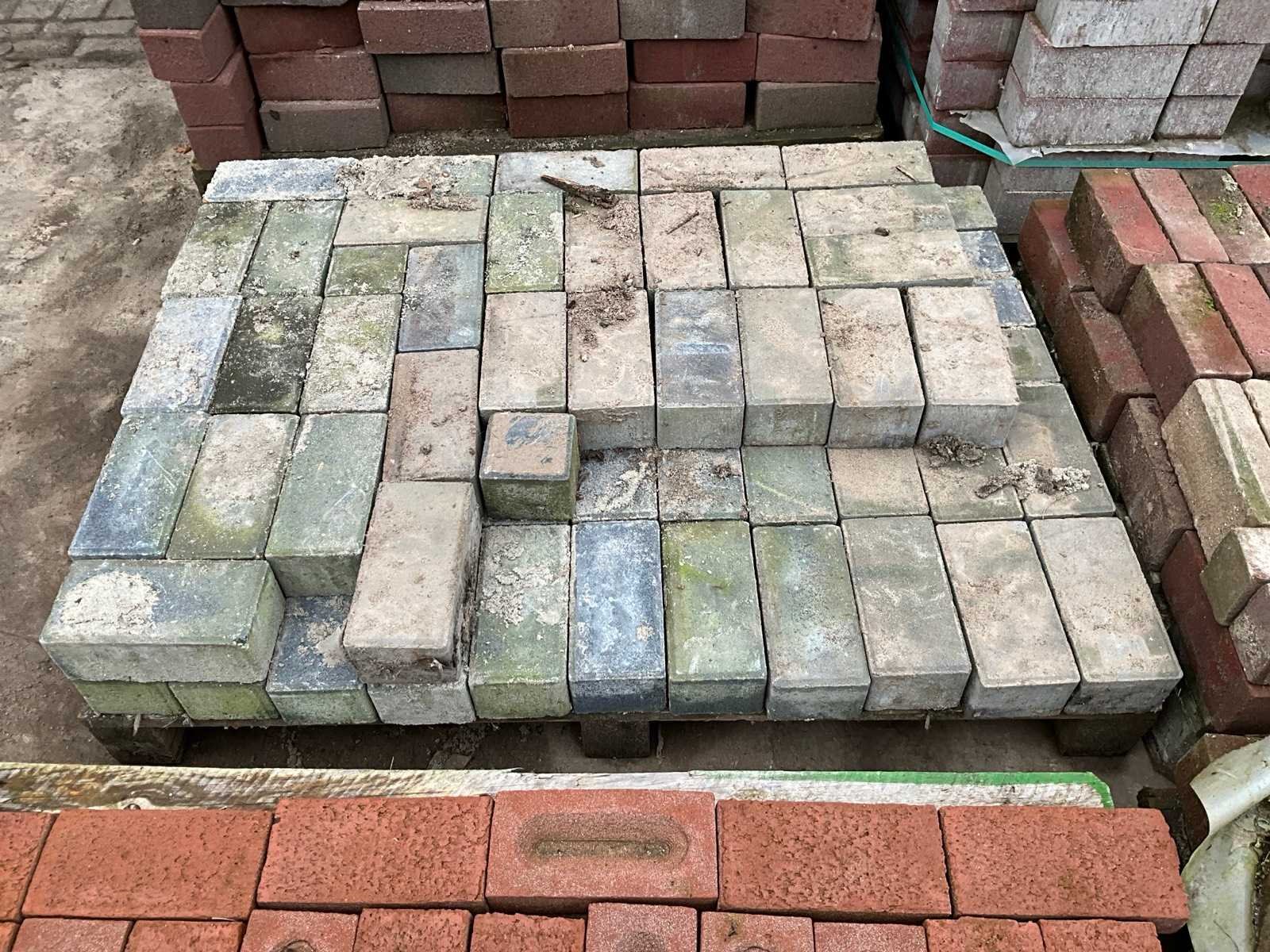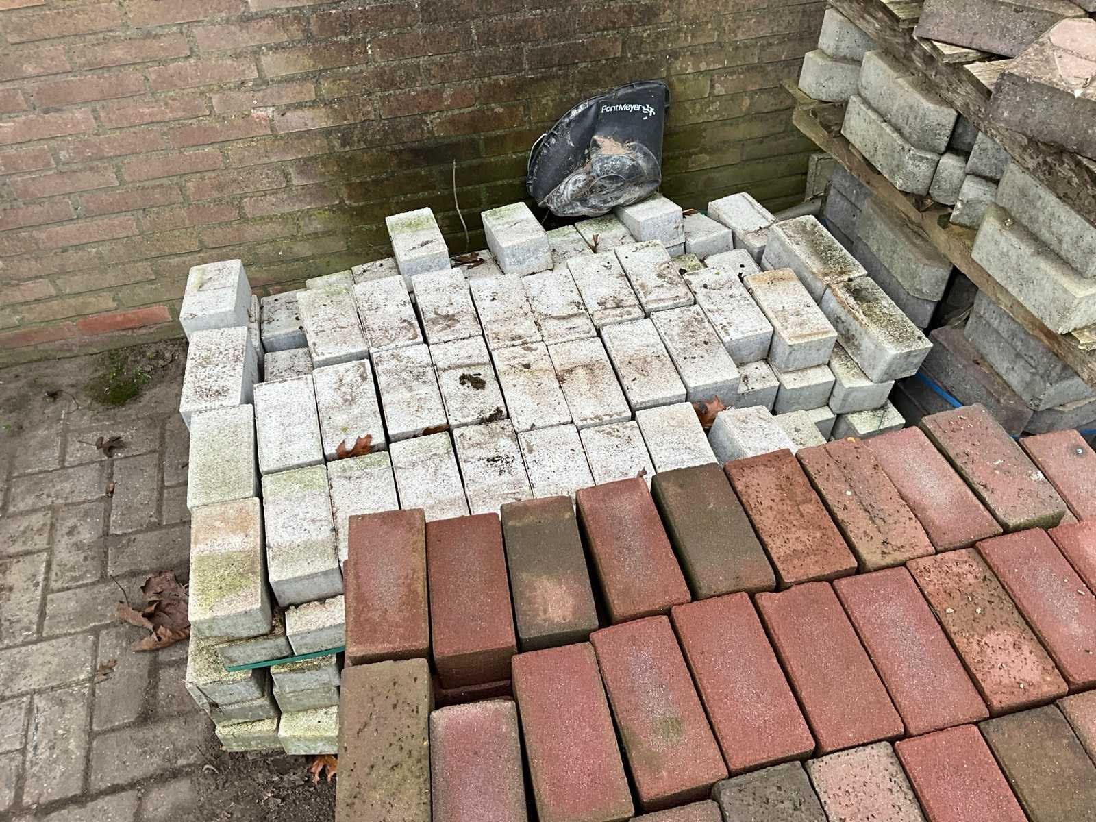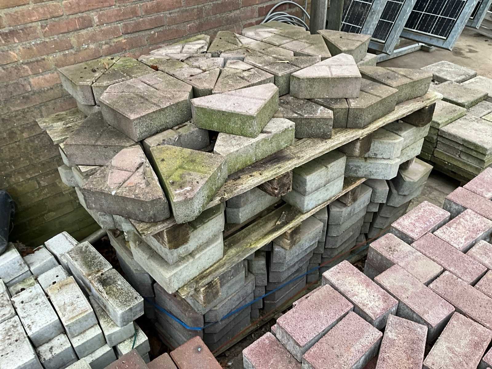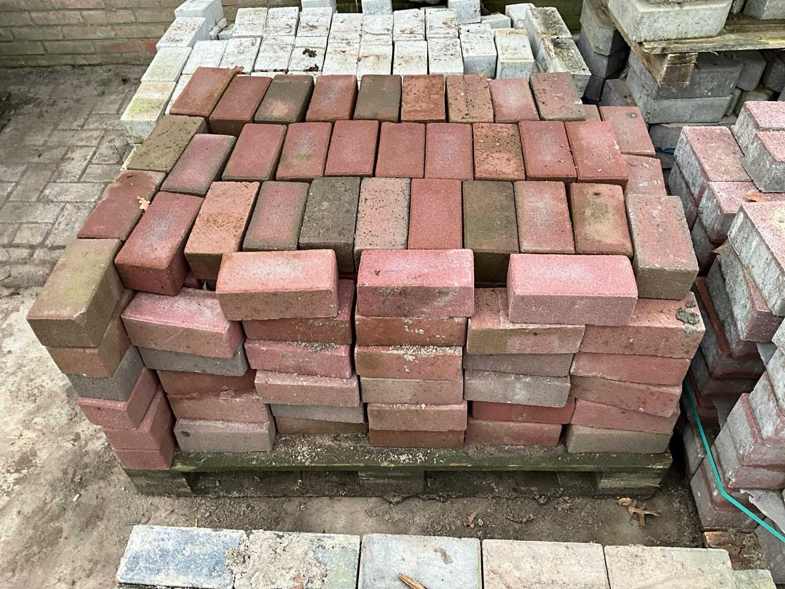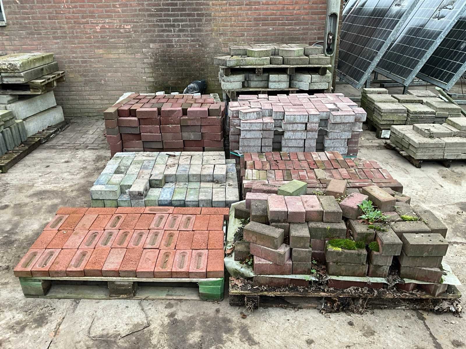 Bestaande uit totaal 7 pallets met klinkers waaronder 20x10x8 cm; 20x10x5 cm en 20x8x6 cm; inclusief 1 pallet bisschopmutsen 30x20x8 cm en 2 pallets tegels 30x30 cm