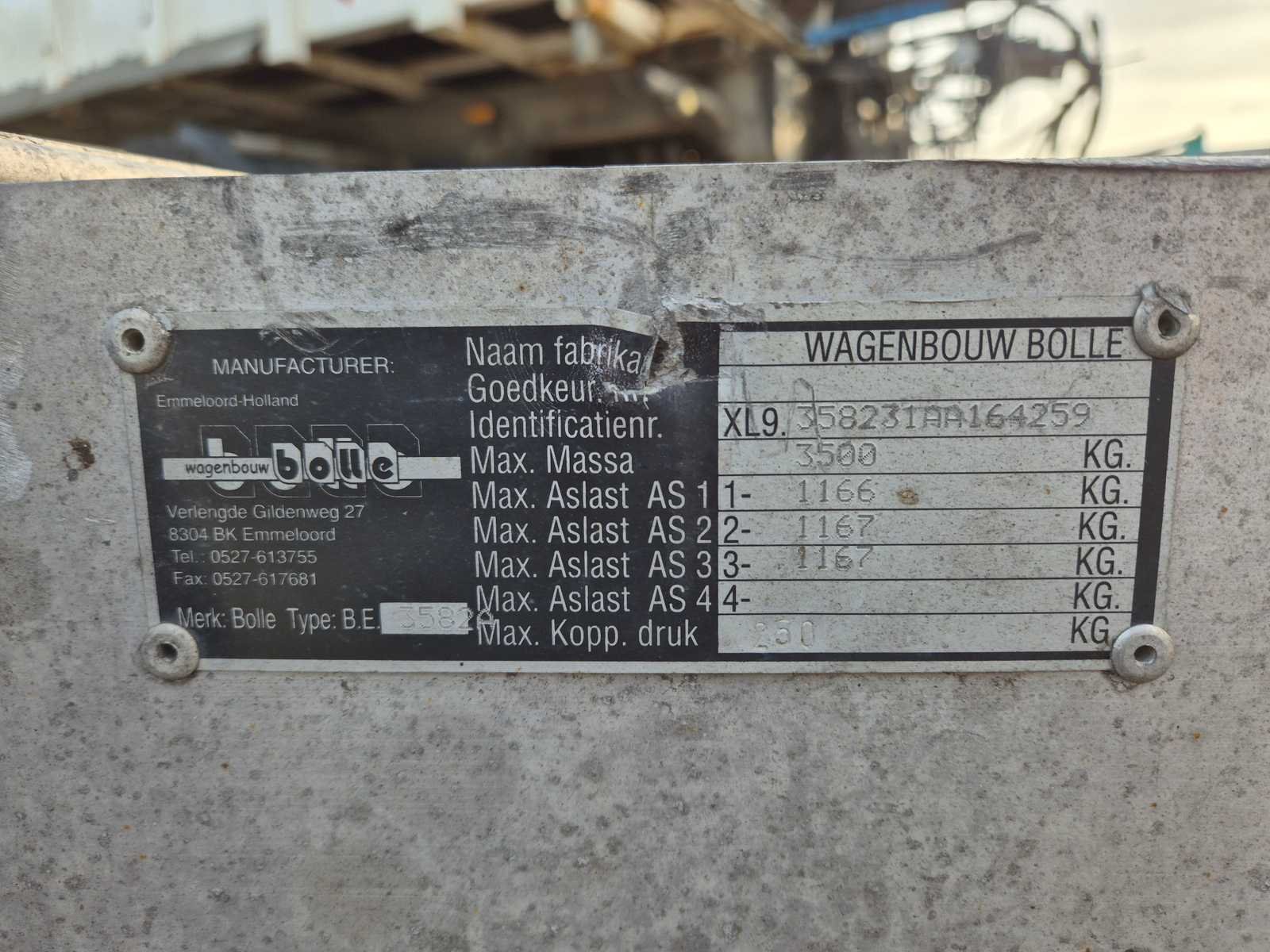 Toegestane maximum gewicht 3500 kg Merk: Bolle Type: BE3582A Bouwjaar: 2022 Aantal assen: 3 Ledig gewicht: 890kg Laadvermogen: 2610kg Datum eerste toelating: 2022-04-21 Datum eerste toelating (NL): 2022-04-21 Kenteken: 46-WDT-4 Lengte: 9600cm Breedte: 2220cm