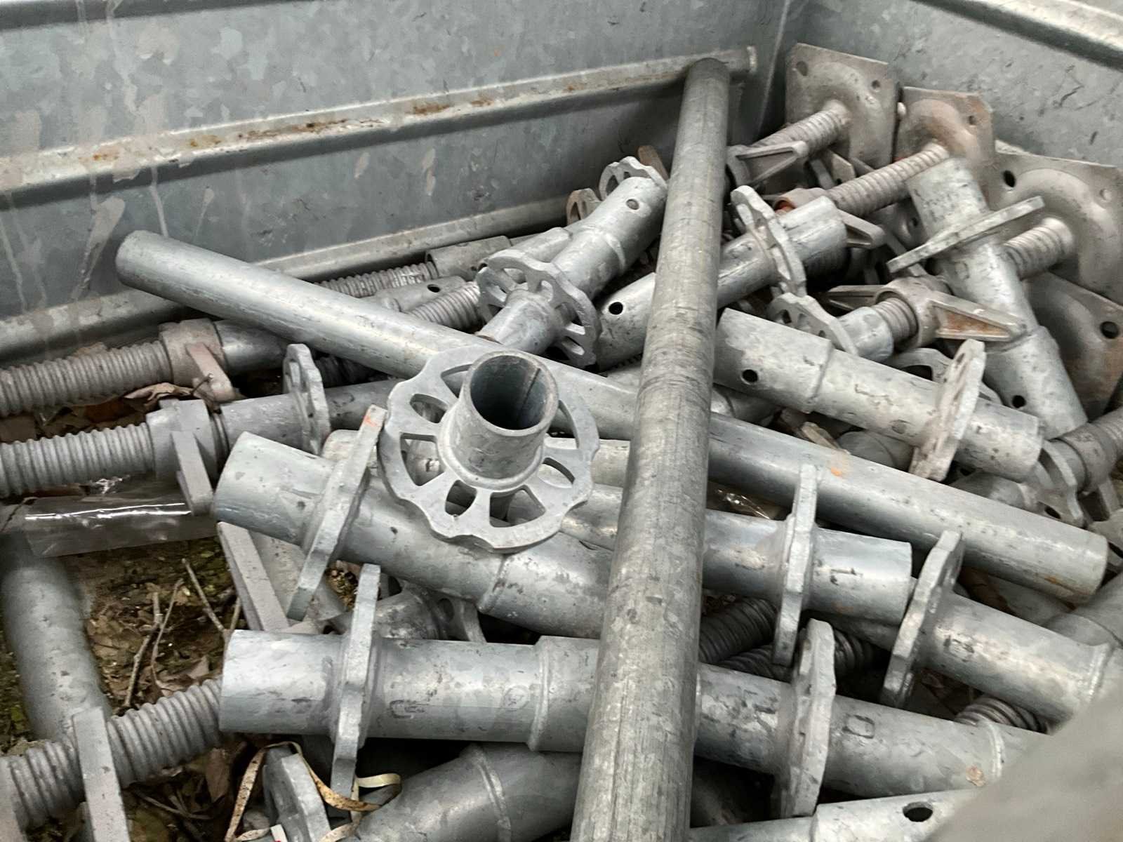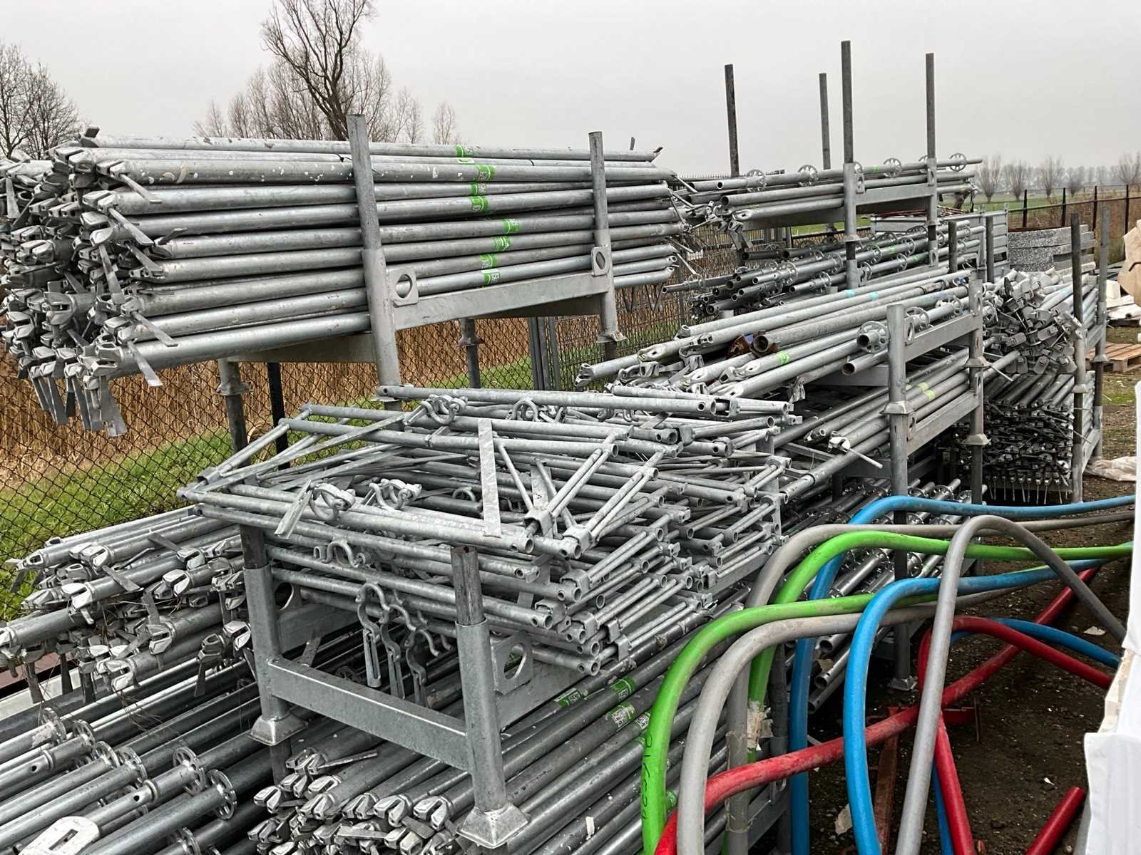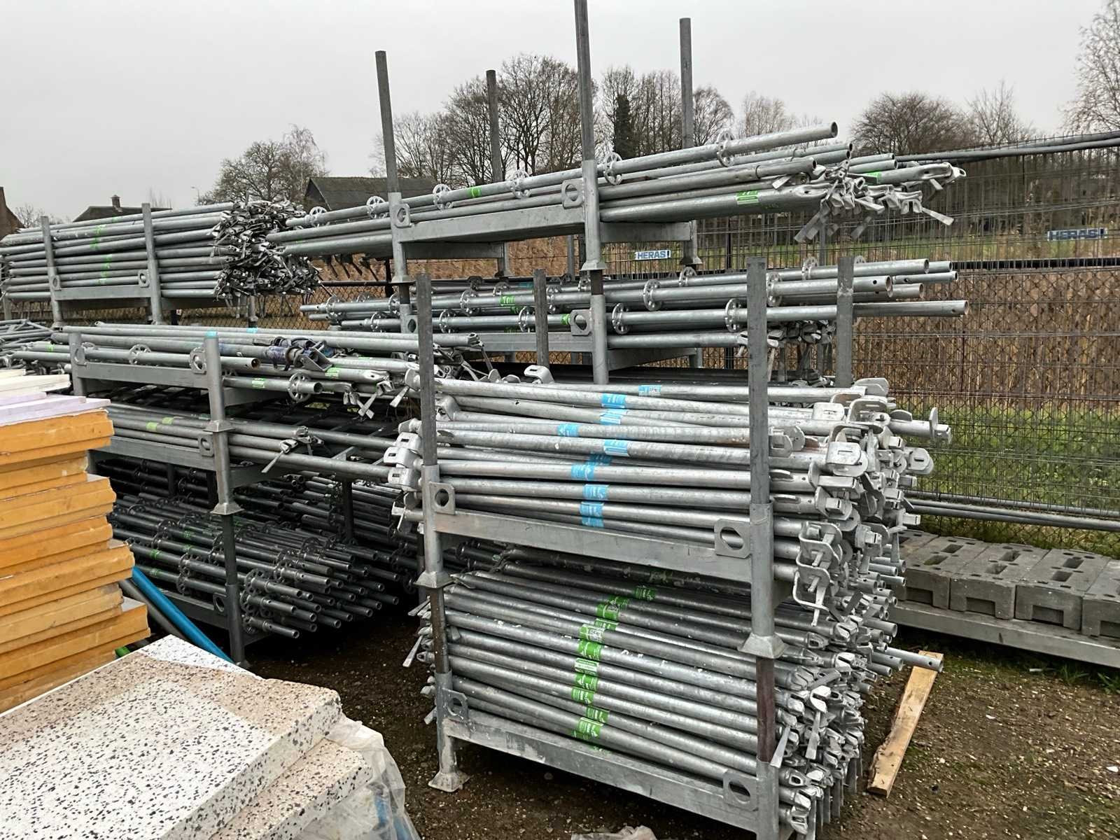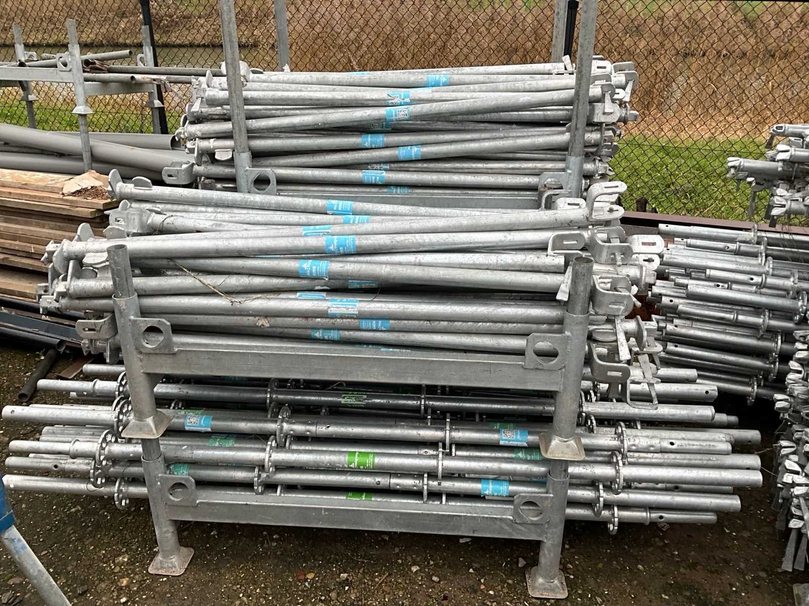 Diverse steigermaterialen in 18 transportframes, 2x standard 2m, 2x ledger 1,40m, 3x adjustable transom 1,40m, 2x standard 3m, 2x ledger 2,57m en diverse losse delen in 3 stalen stapelkratten Merk: Rix Gegalvaniseerd: true