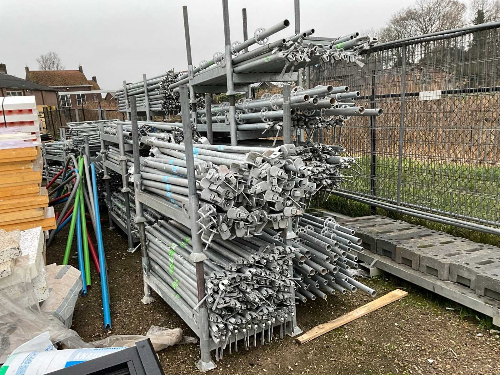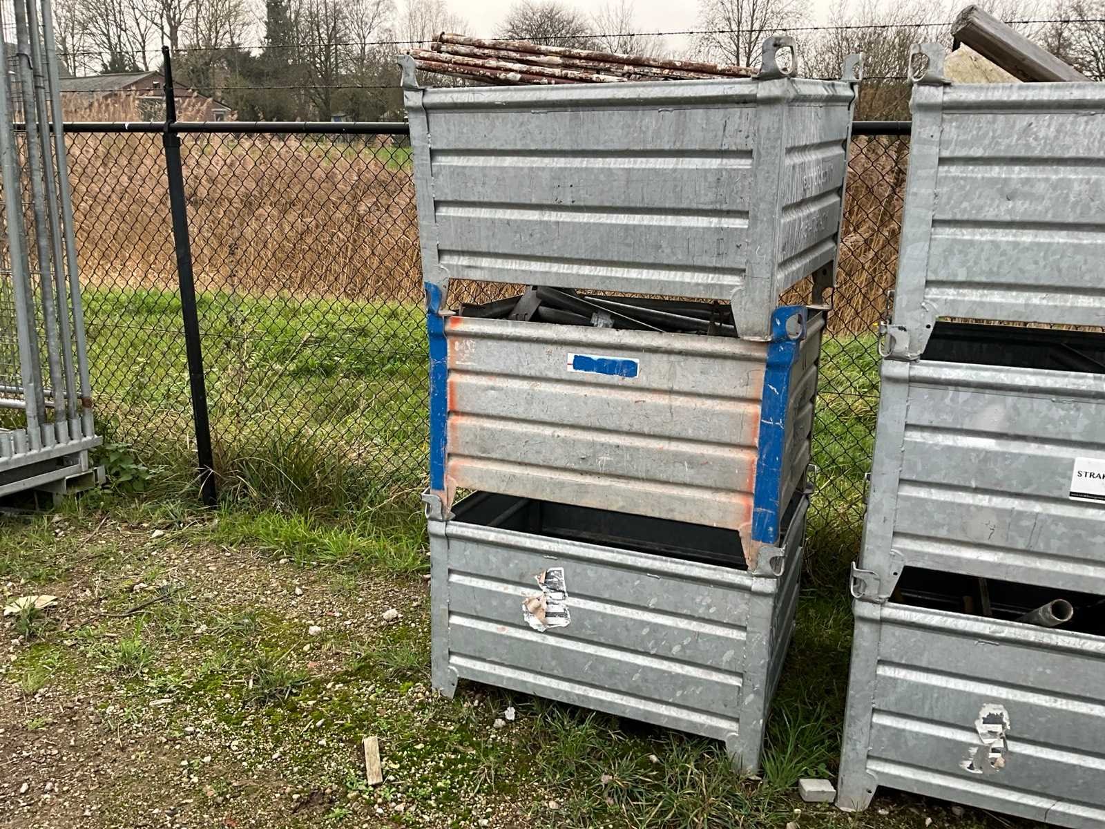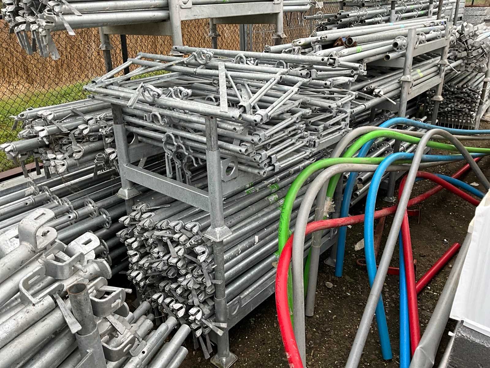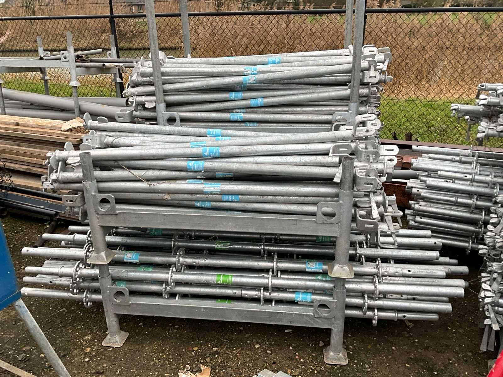 Diverse steigermaterialen in 18 transportframes, 2x standard 2m, 2x ledger 1,40m, 3x adjustable transom 1,40m, 2x standard 3m, 2x ledger 2,57m en diverse losse delen in 3 stalen stapelkratten Merk: Rix Gegalvaniseerd: true