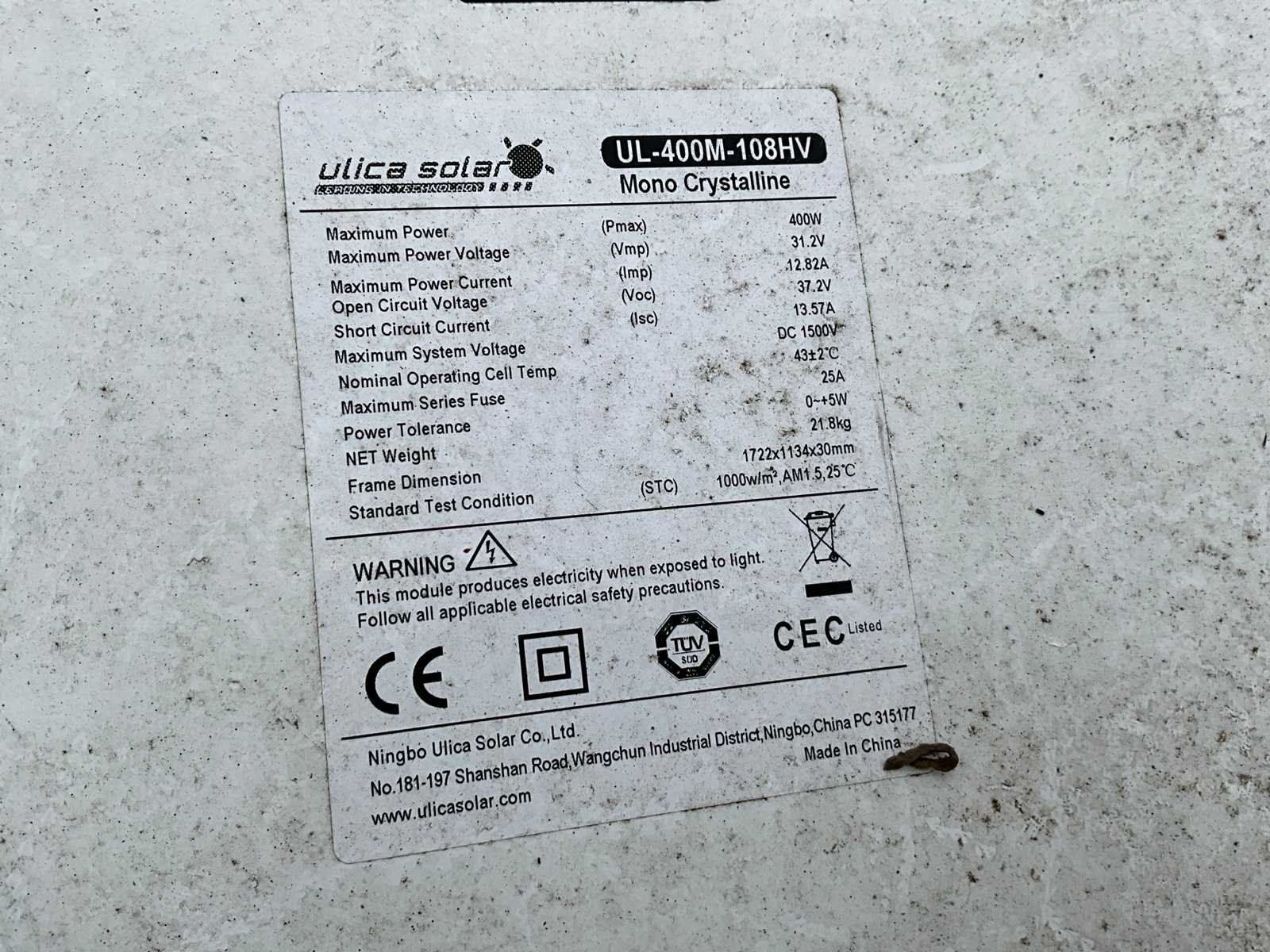 Merk: Ulica Solar Type: UL-400M-108HV