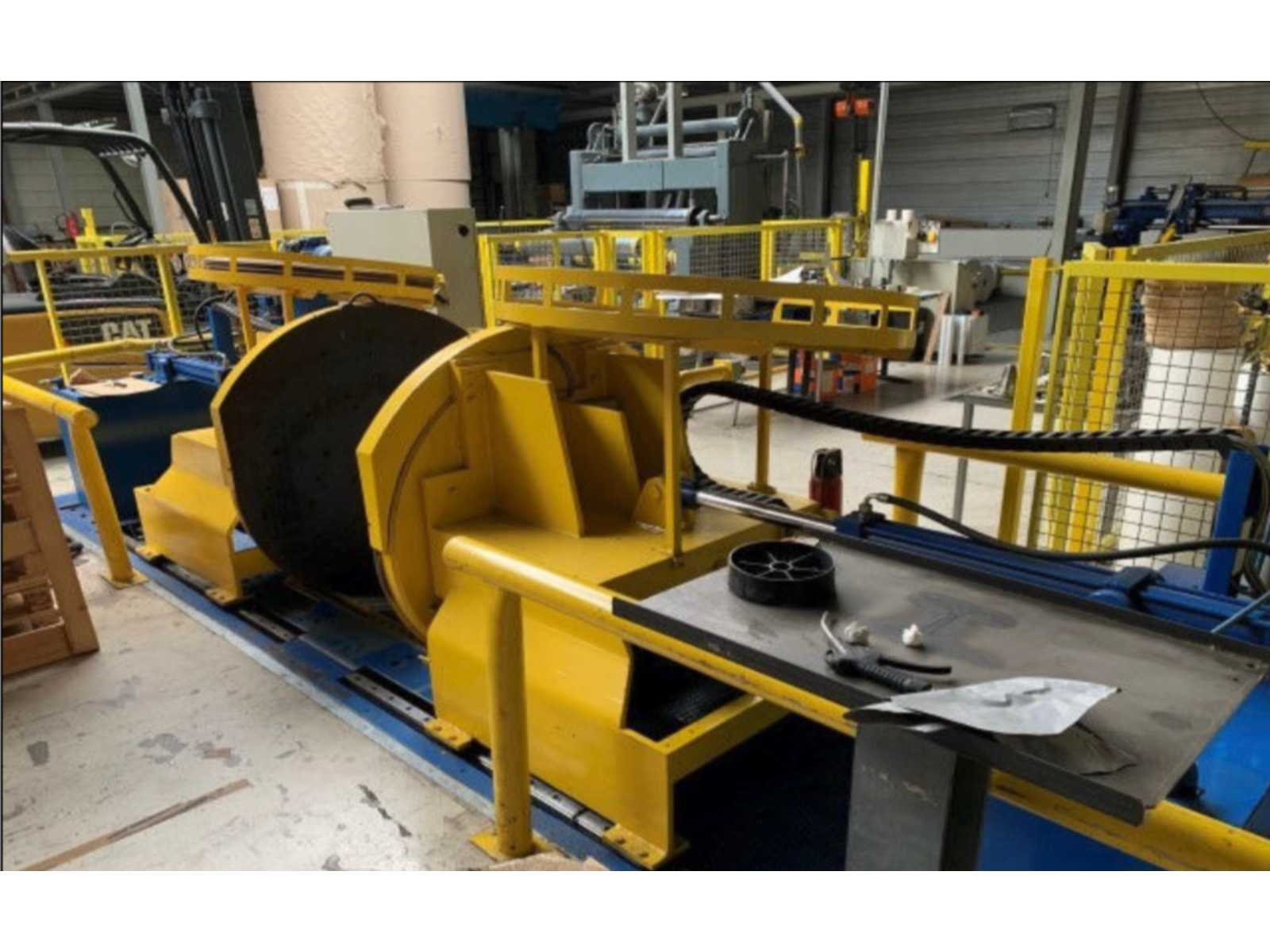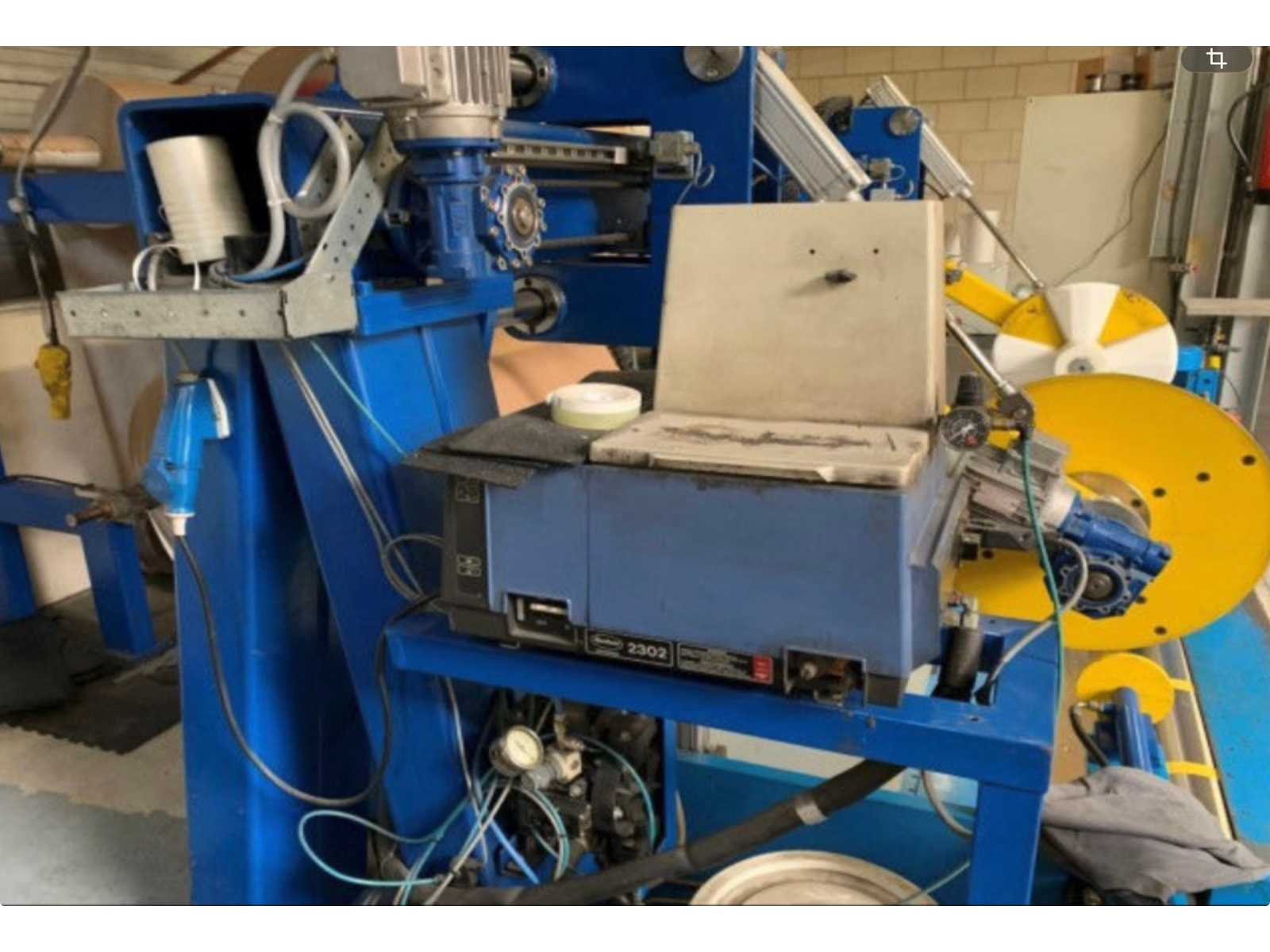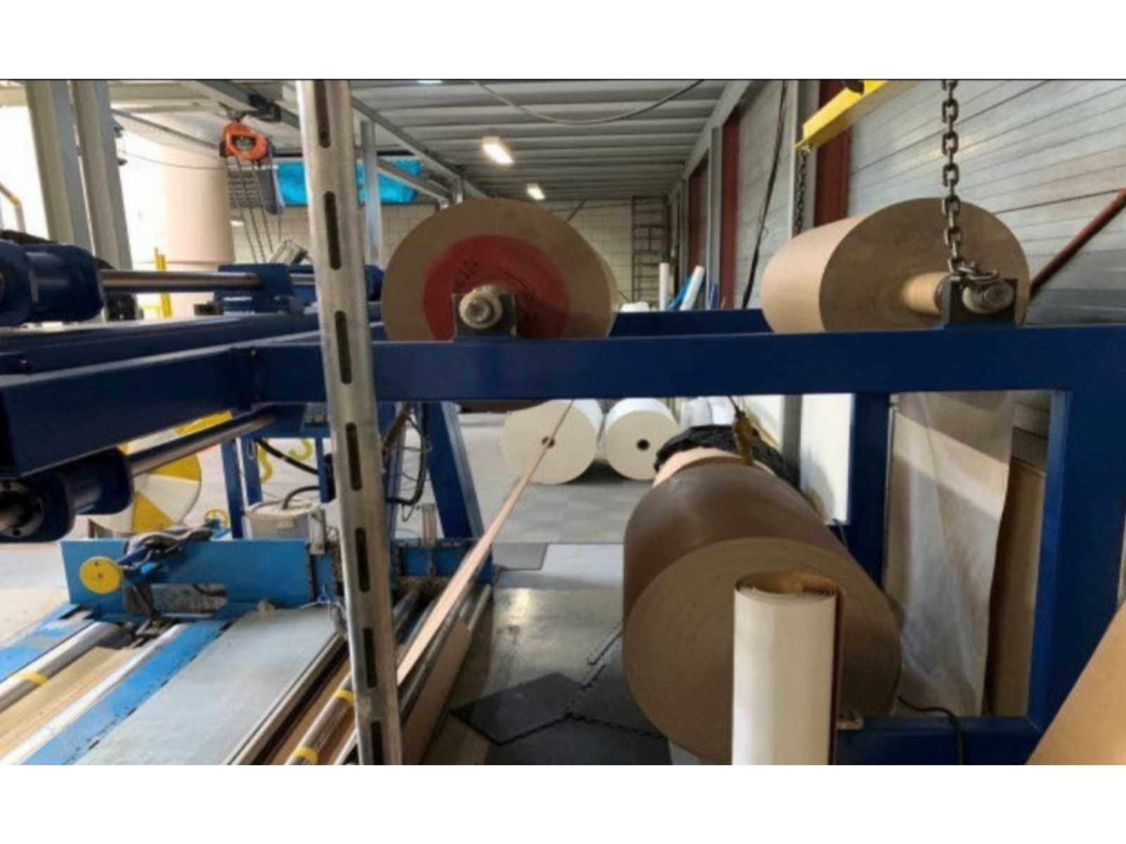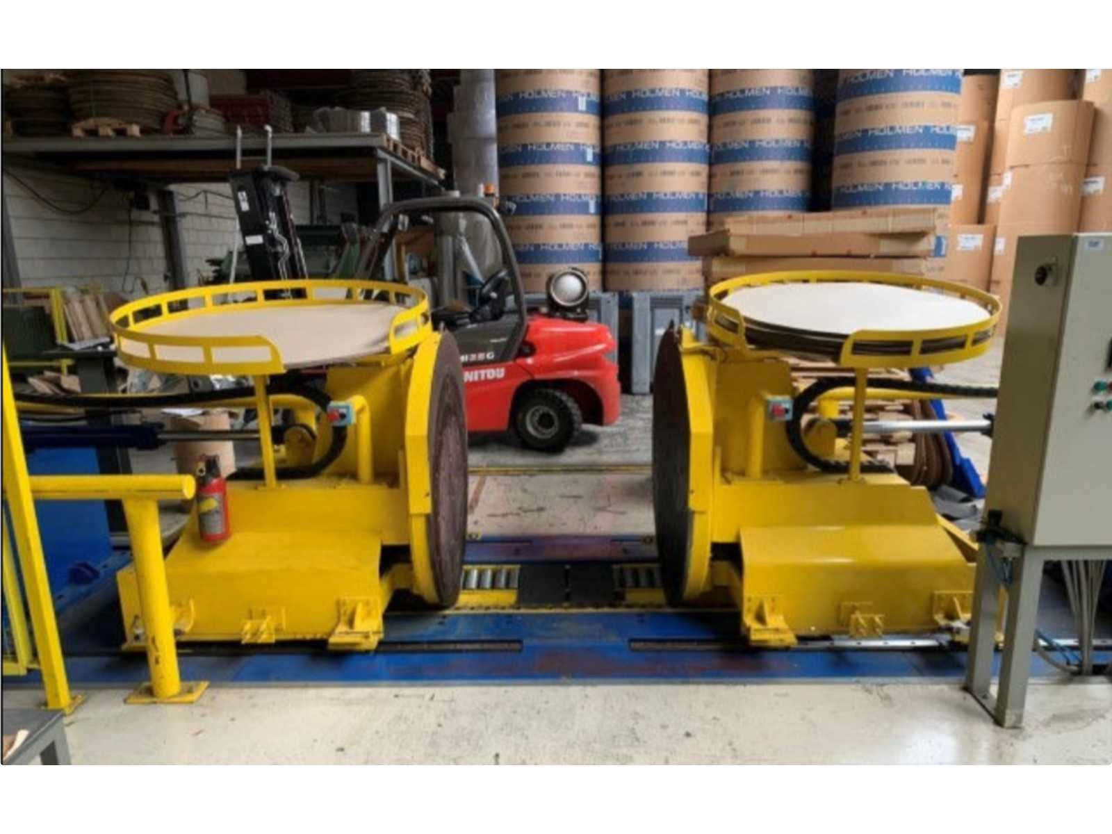 2-delige papierrollen-inpakstraat; v.v. rollenbaan; hydraulische positioneercilinders; aandrukrollen; verpakking papierrollenframe; hotlijmunit Nordson met langslopende spuitkopmotoren; hydraulische pomp; vloerweegschaal; kantenverpakkingsmachine met stalen frame; 2 verwarmbare hydraulische aandruk persplaten doorsnede 1,5 mtr.; rollenheftafel met dwarsrollenbaan; verdere toebehoren. Merk: Voith Bouwjaar: 1999