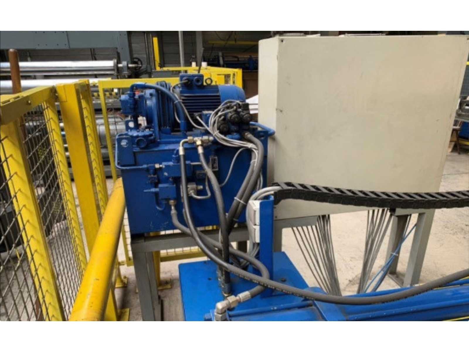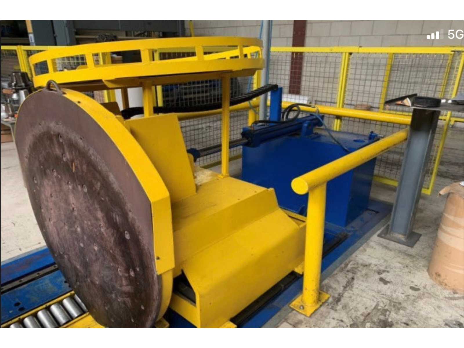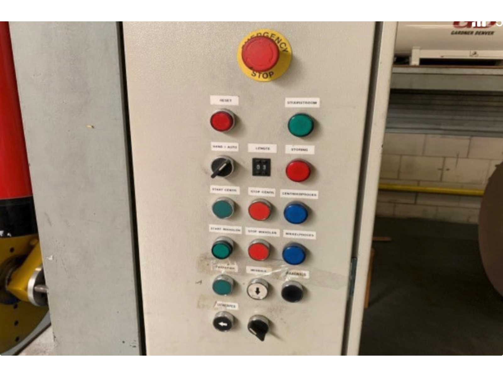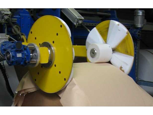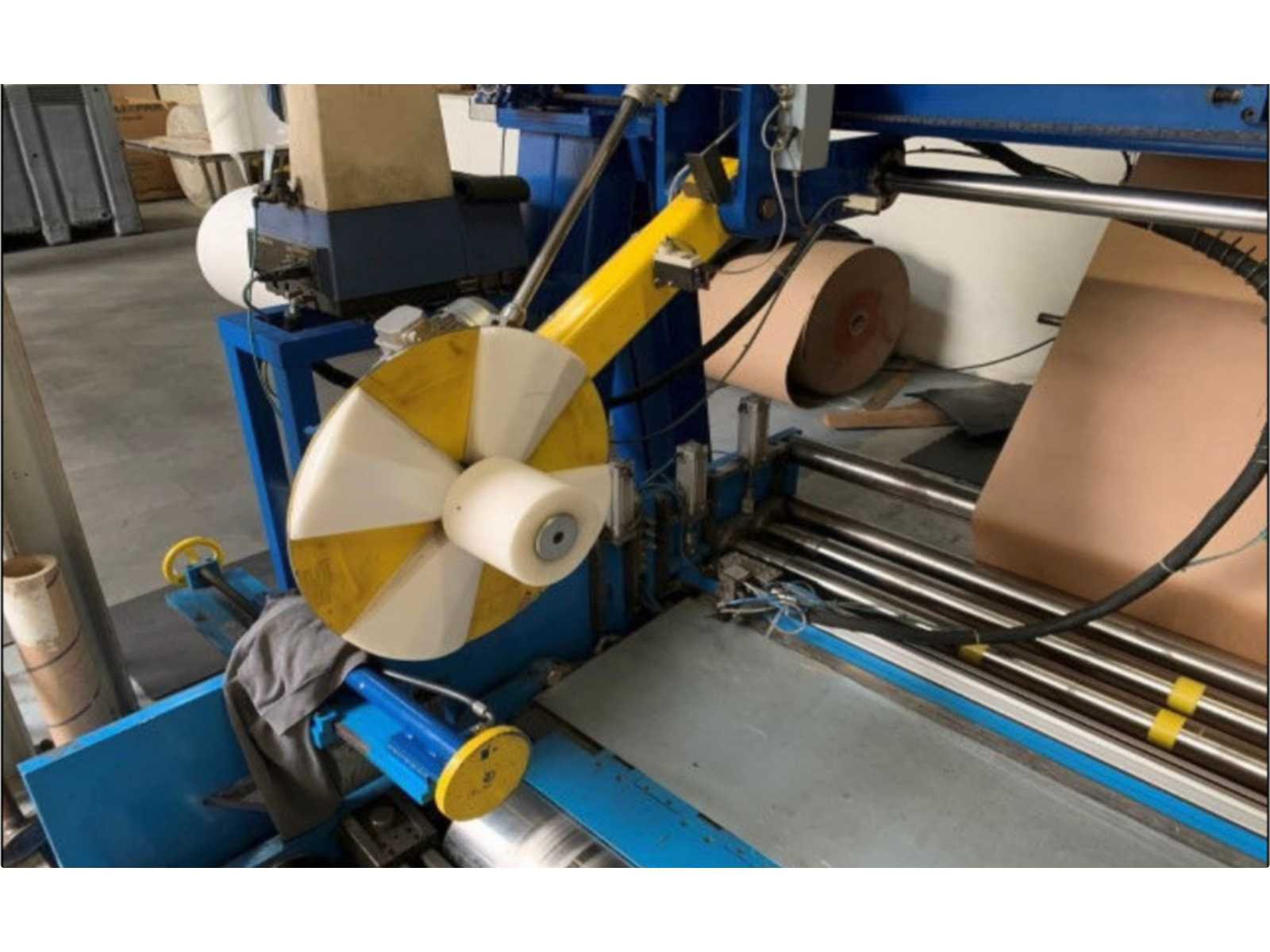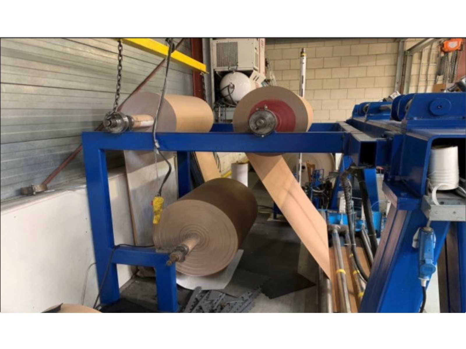 2-delige papierrollen-inpakstraat; v.v. rollenbaan; hydraulische positioneercilinders; aandrukrollen; verpakking papierrollenframe; hotlijmunit Nordson met langslopende spuitkopmotoren; hydraulische pomp; vloerweegschaal; kantenverpakkingsmachine met stalen frame; 2 verwarmbare hydraulische aandruk persplaten doorsnede 1,5 mtr.; rollenheftafel met dwarsrollenbaan; verdere toebehoren. Merk: Voith Bouwjaar: 1999