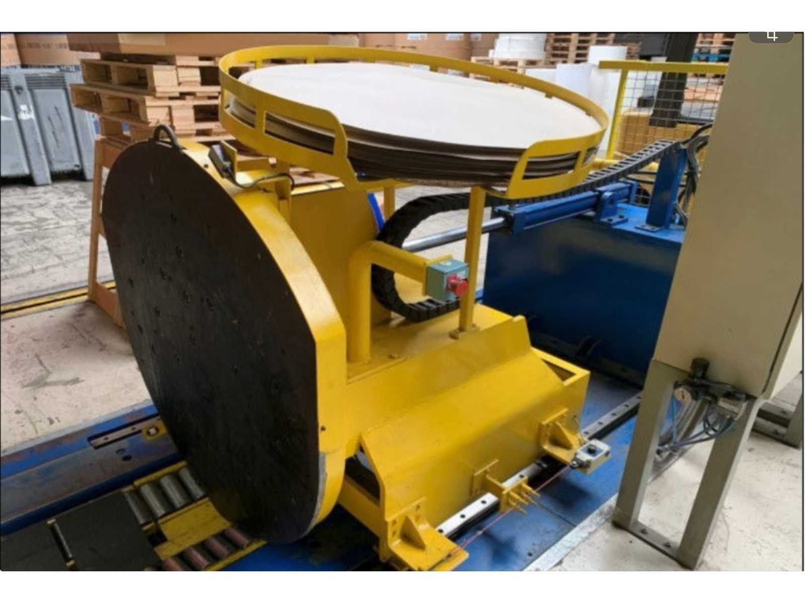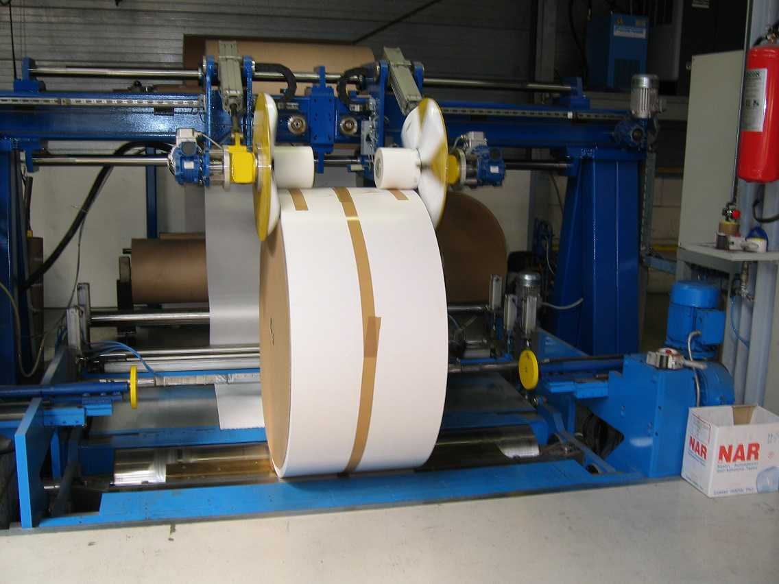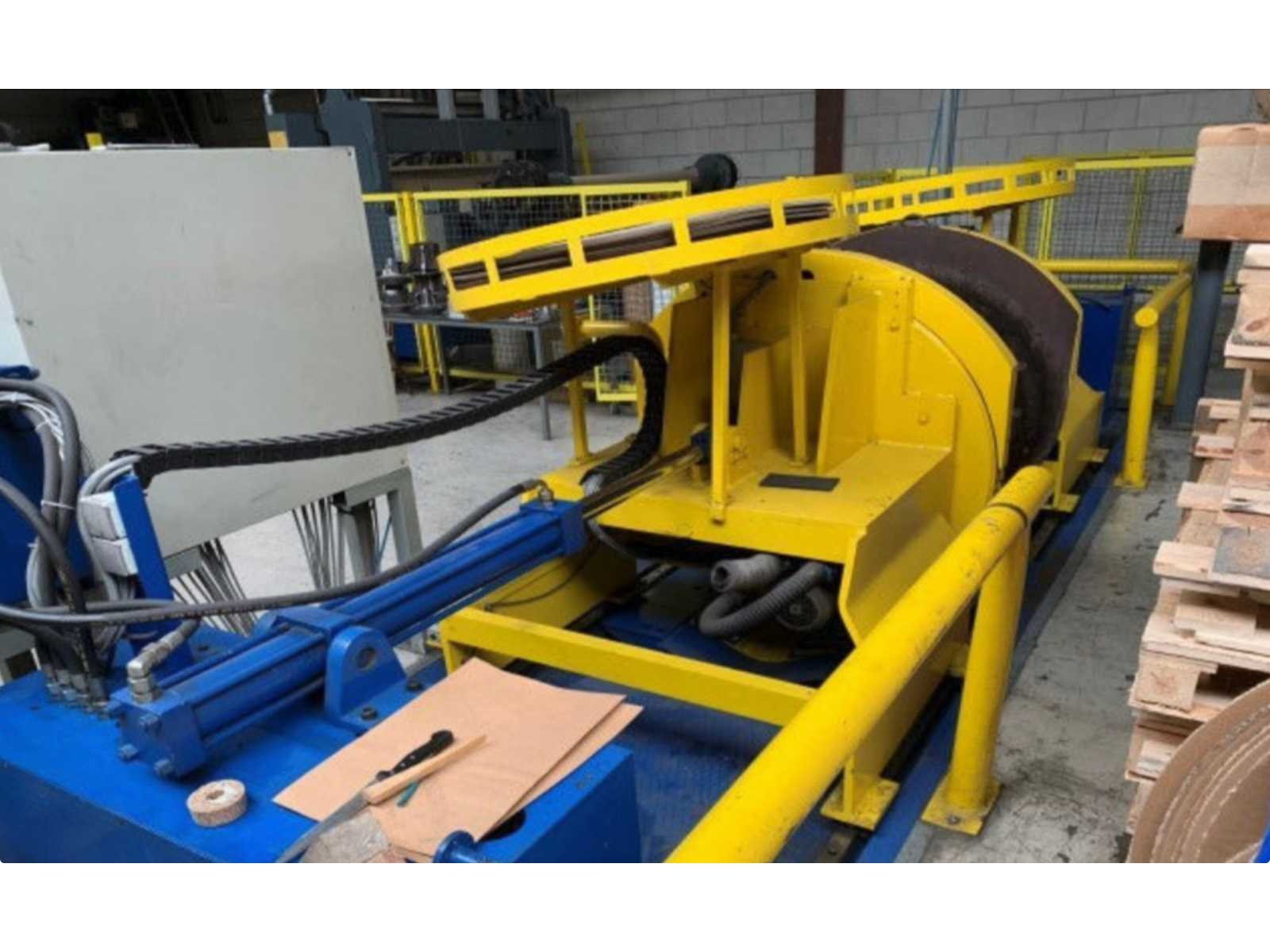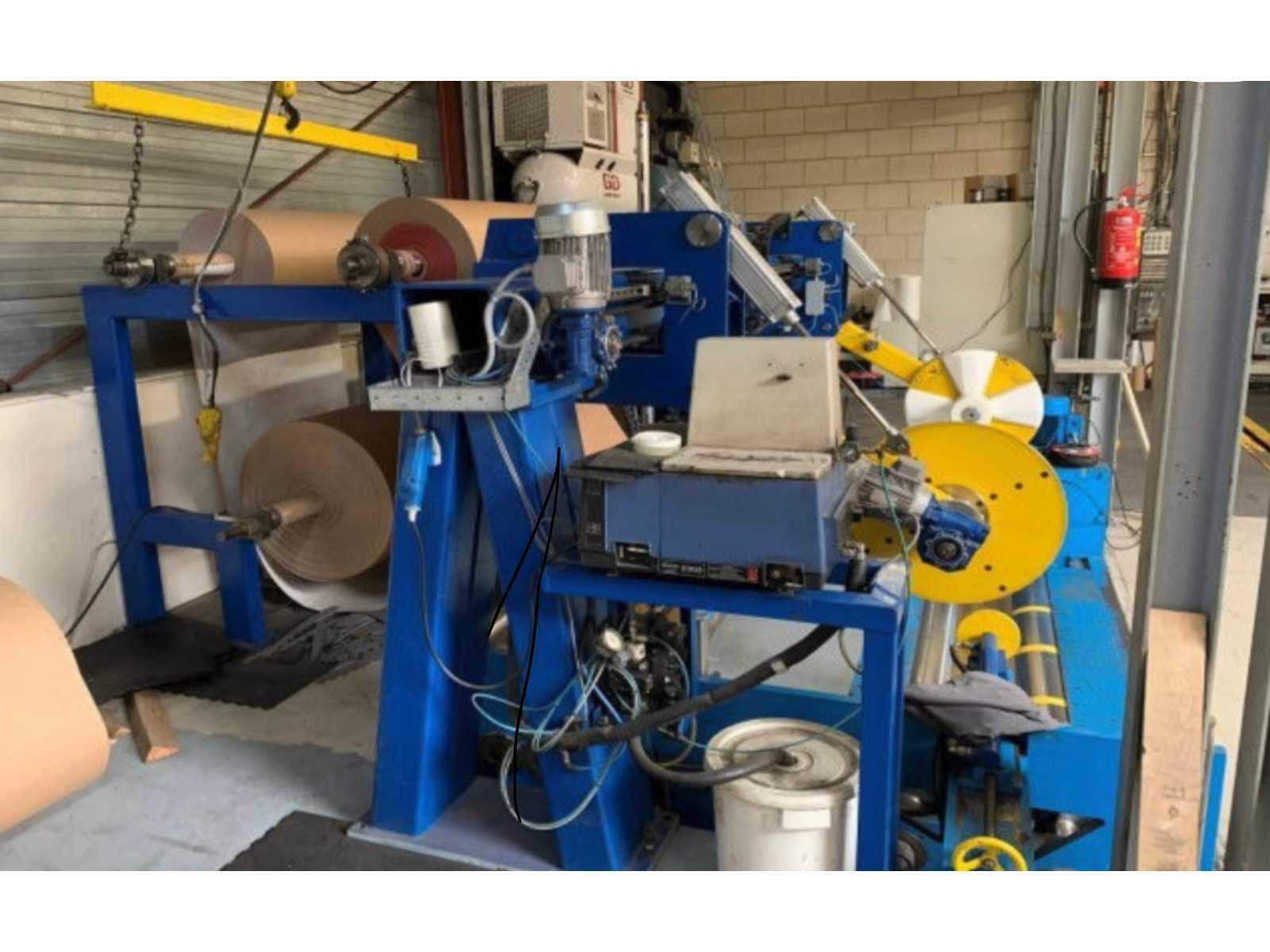 2-delige papierrollen-inpakstraat; v.v. rollenbaan; hydraulische positioneercilinders; aandrukrollen; verpakking papierrollenframe; hotlijmunit Nordson met langslopende spuitkopmotoren; hydraulische pomp; vloerweegschaal; kantenverpakkingsmachine met stalen frame; 2 verwarmbare hydraulische aandruk persplaten doorsnede 1,5 mtr.; rollenheftafel met dwarsrollenbaan; verdere toebehoren. Merk: Voith Bouwjaar: 1999
