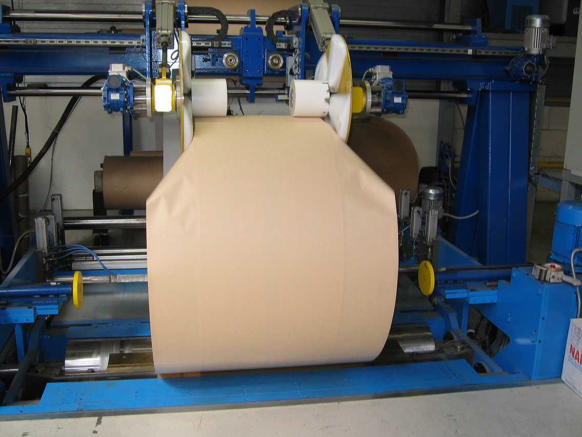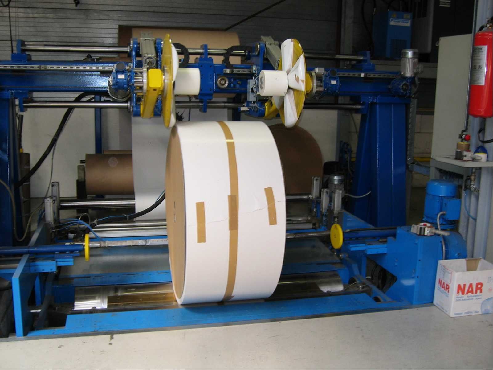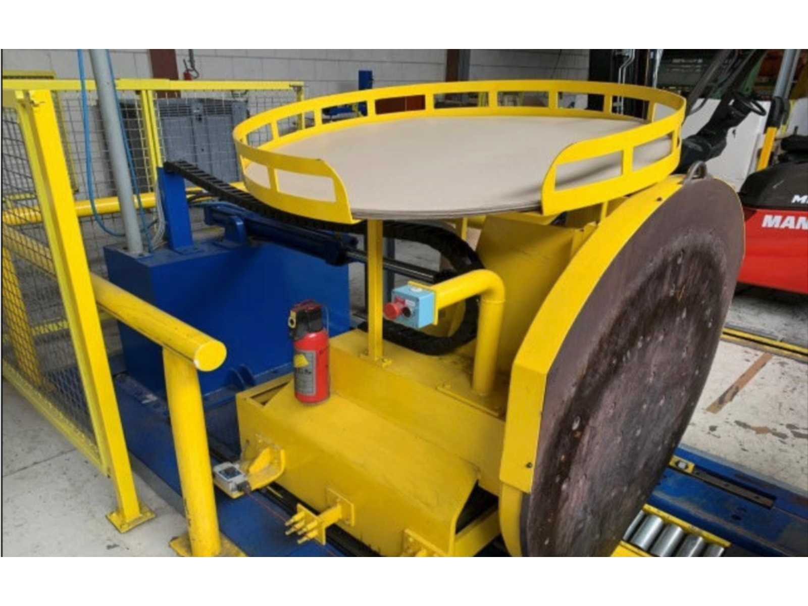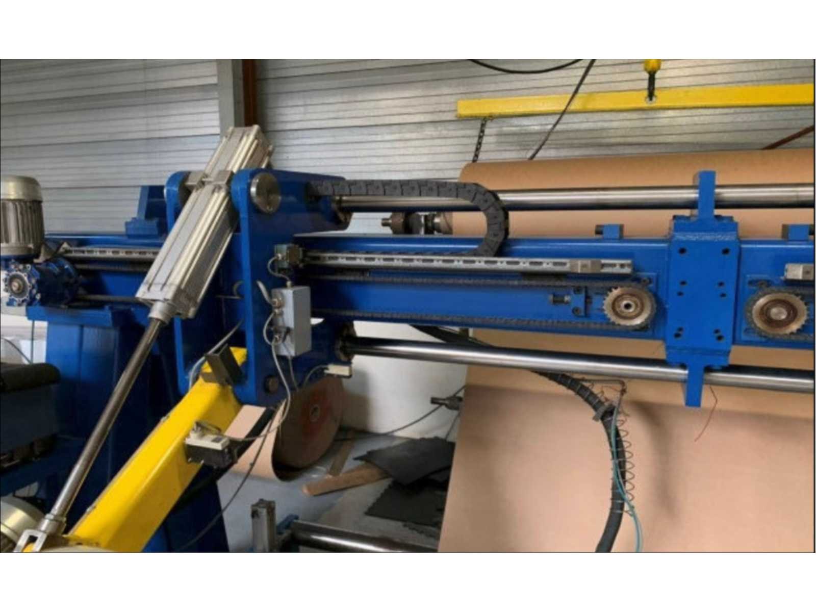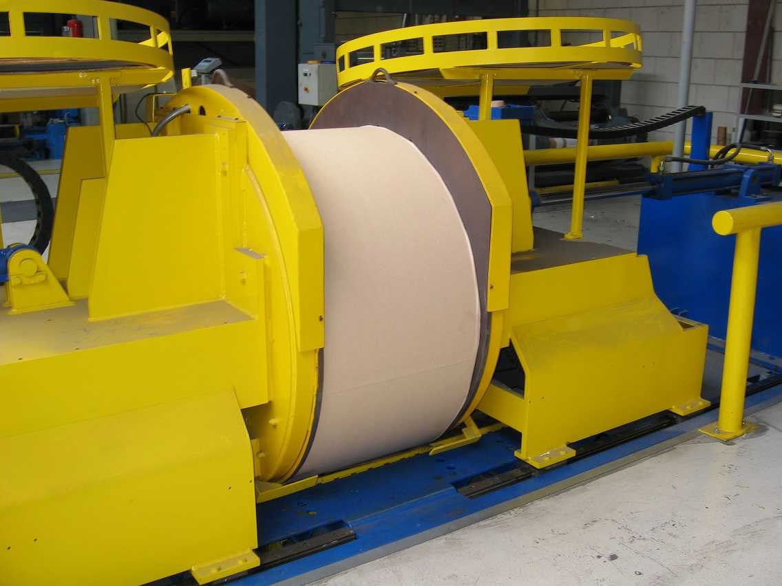 2-delige papierrollen-inpakstraat; v.v. rollenbaan; hydraulische positioneercilinders; aandrukrollen; verpakking papierrollenframe; hotlijmunit Nordson met langslopende spuitkopmotoren; hydraulische pomp; vloerweegschaal; kantenverpakkingsmachine met stalen frame; 2 verwarmbare hydraulische aandruk persplaten doorsnede 1,5 mtr.; rollenheftafel met dwarsrollenbaan; verdere toebehoren. Merk: Voith Bouwjaar: 1999