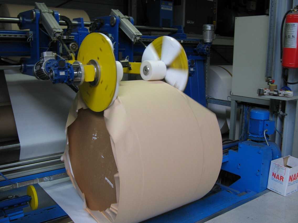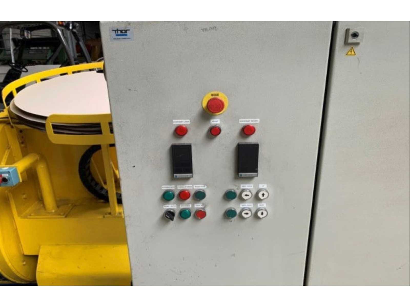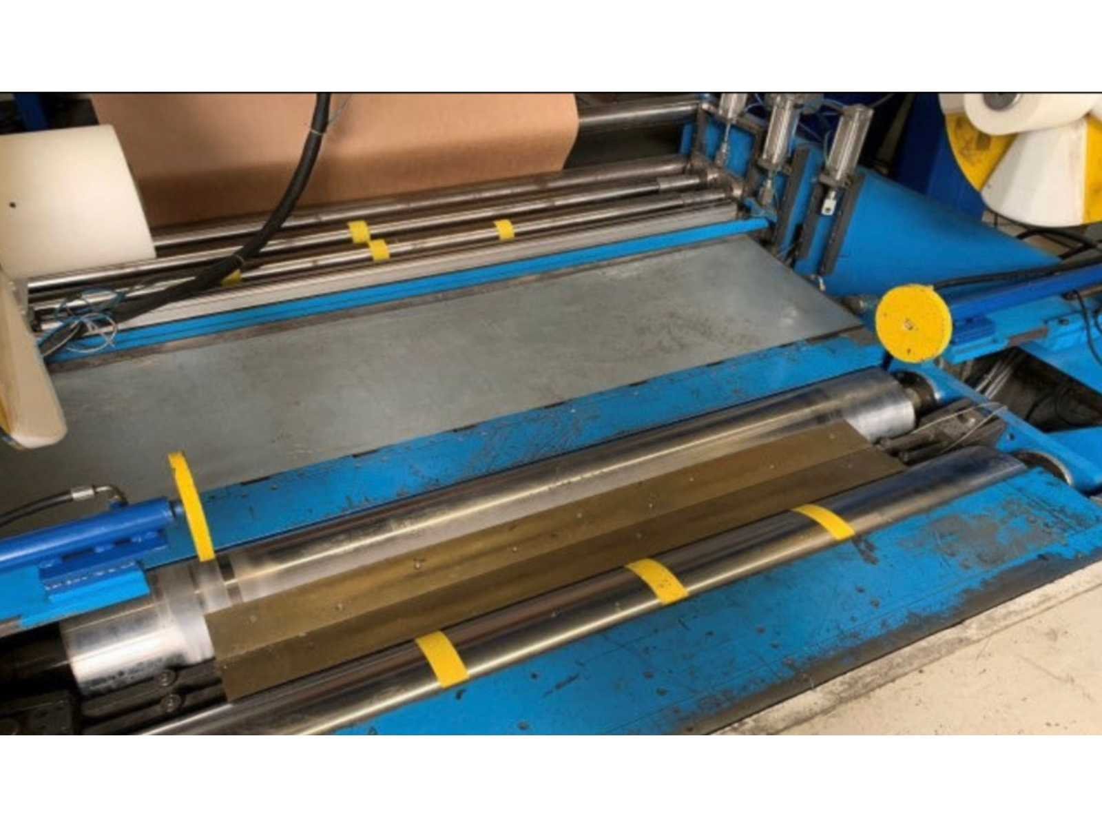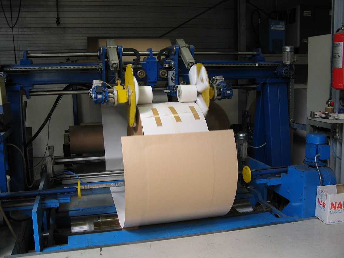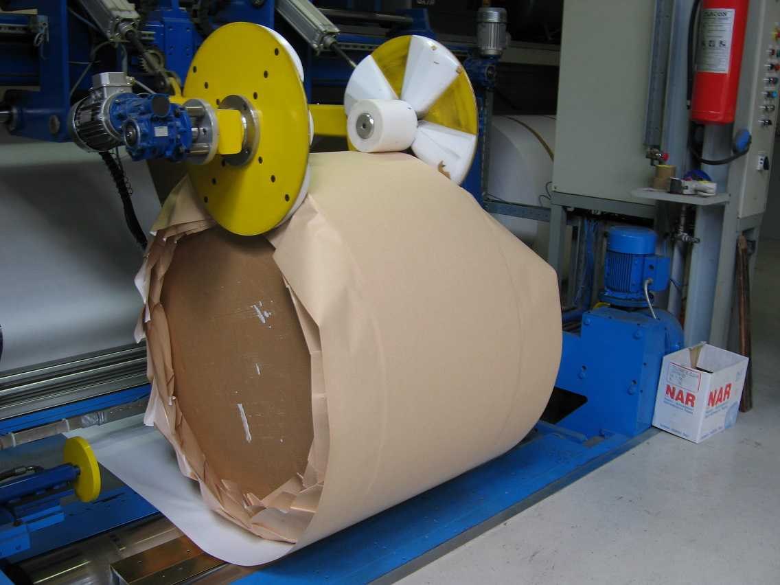 2-delige papierrollen-inpakstraat; v.v. rollenbaan; hydraulische positioneercilinders; aandrukrollen; verpakking papierrollenframe; hotlijmunit Nordson met langslopende spuitkopmotoren; hydraulische pomp; vloerweegschaal; kantenverpakkingsmachine met stalen frame; 2 verwarmbare hydraulische aandruk persplaten doorsnede 1,5 mtr.; rollenheftafel met dwarsrollenbaan; verdere toebehoren. Merk: Voith Bouwjaar: 1999